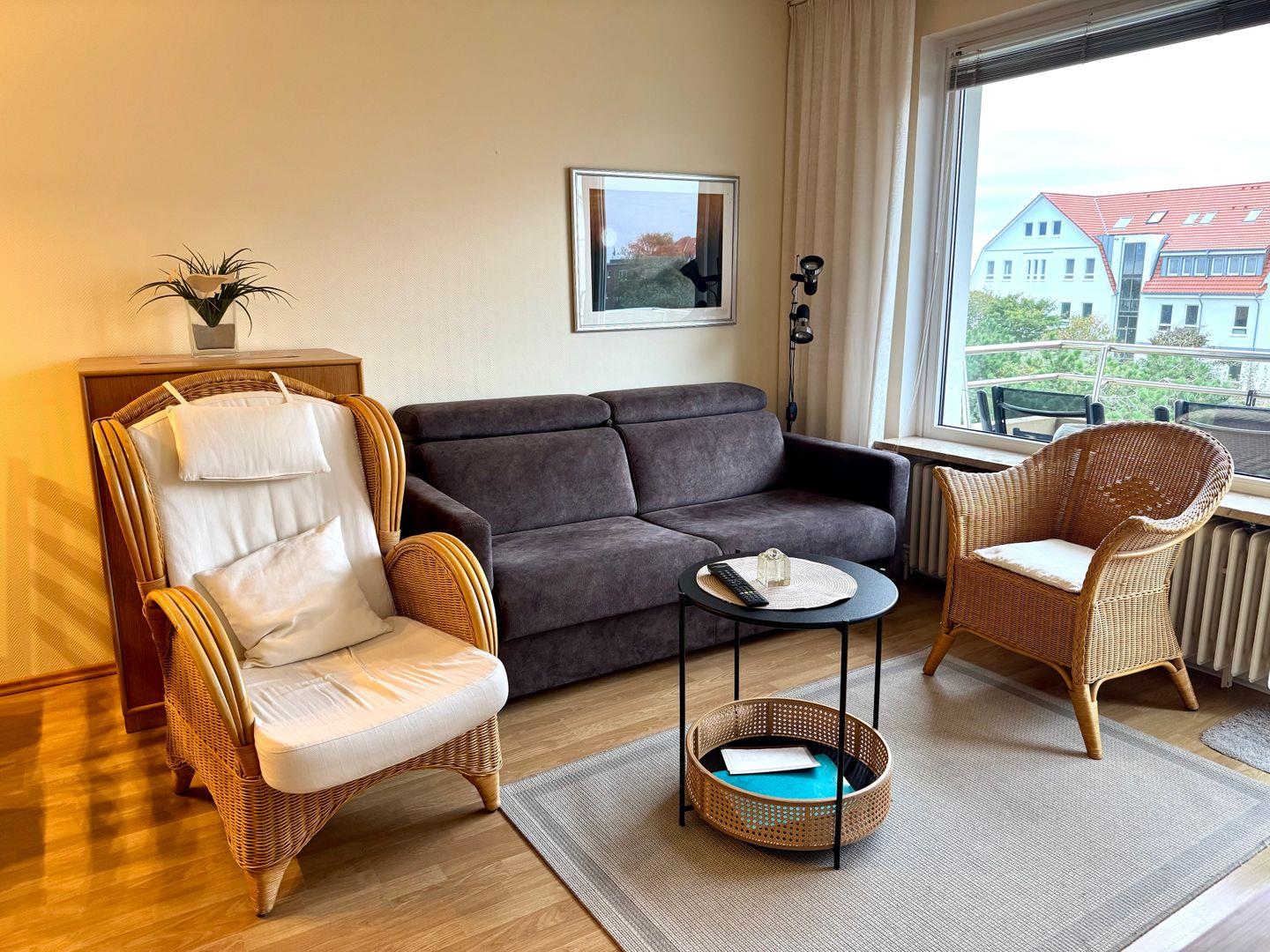 Der gemütliche Wohnbereich mit angrenzendem Südbalkon lädt zum Verweilen ein. In der offenen Küche befindet sich alles, was Sie für eine Selbstverpflegung benötigen.
