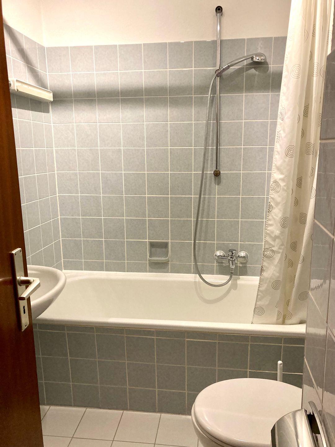 Das kleine aber feine Badezimmer beinhaltet eine Badewanne, Waschtisch und Toilette.
