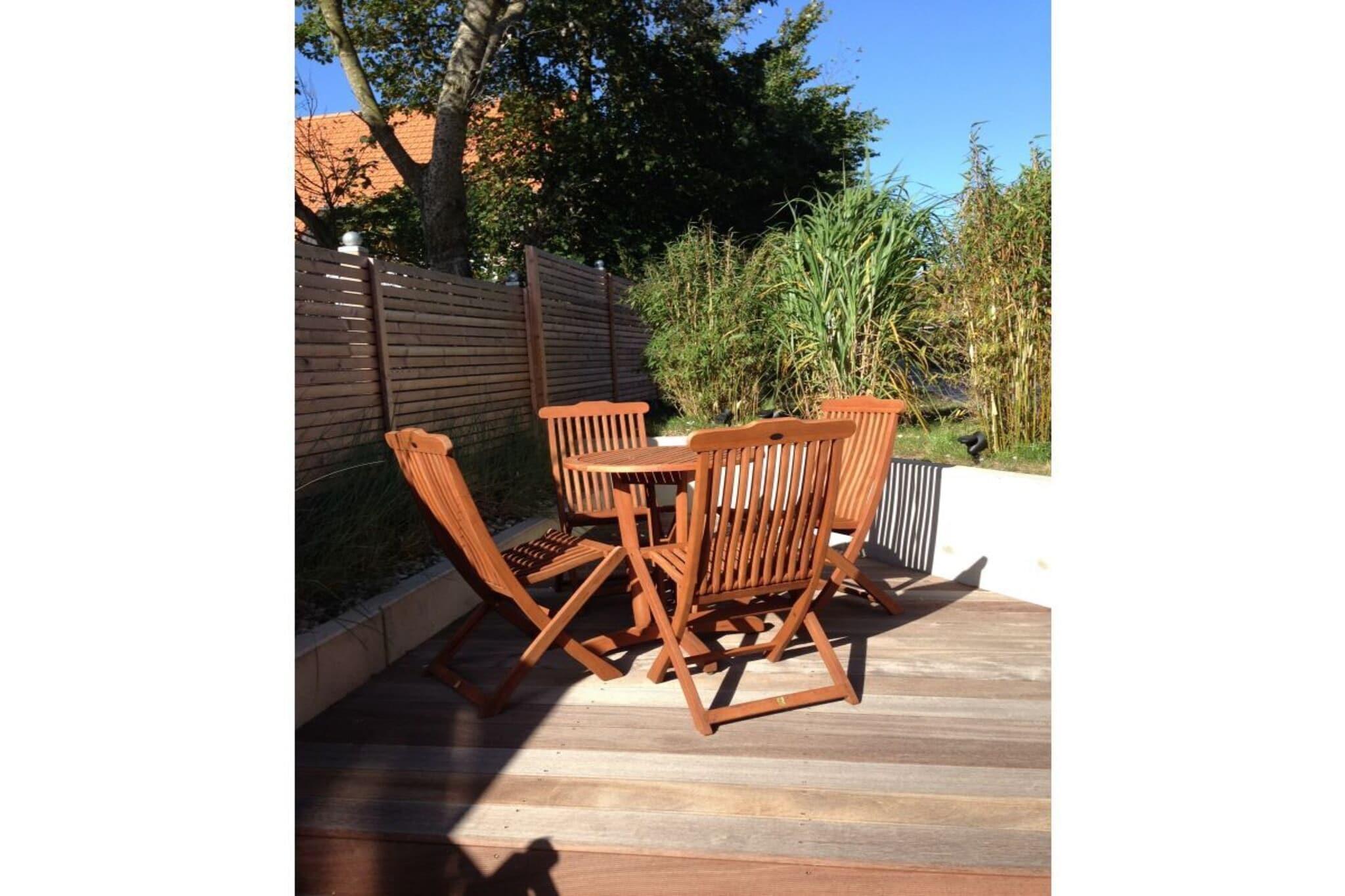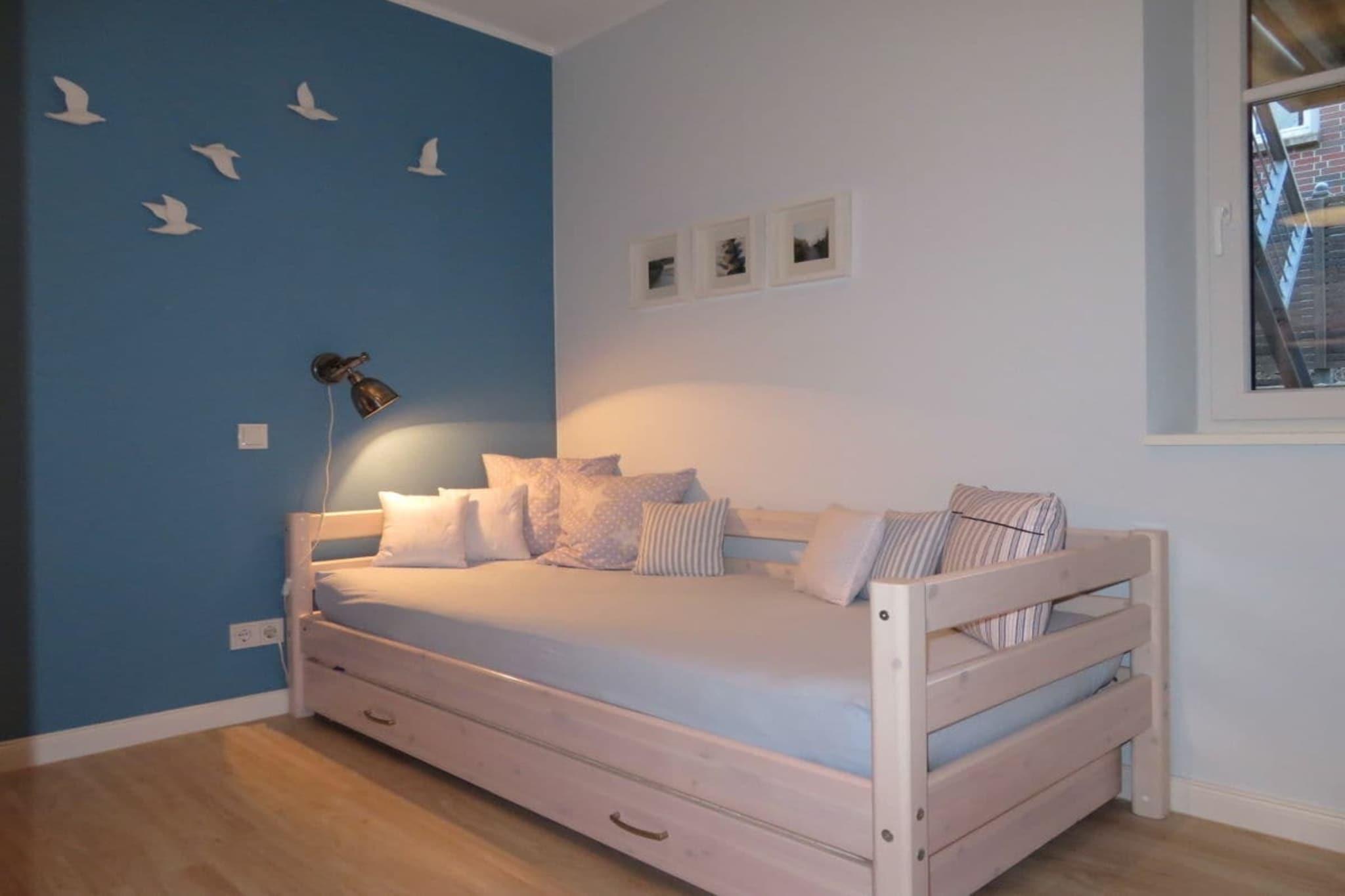 Enhver, der kommer til øen Wangerooge, sætter straks farten ned... Vores lejlighed i stueetagen i det nybyggede Kaptajnshus tilbyder de ideelle rammer for den mest vidunderlige tid på året. Vores lejlighed er møbleret med stor sans for detaljer og lader intet tilbage at ønske. I stueetagen finder du et fuldt udstyret køkken med en smagfuld opholds- og spisestue. Derfra har du adgang til den møblerede balkon og haven til din eksklusive brug. Den optimale placering garanterer smukke solskinstimer. Et soveværelse, et børneværelse og et badeværelse er placeret i lejlighedens kælder. Sengene vil naturligvis være redt ved ankomst. Håndklæder og viskestykker er inkluderet i prisen.