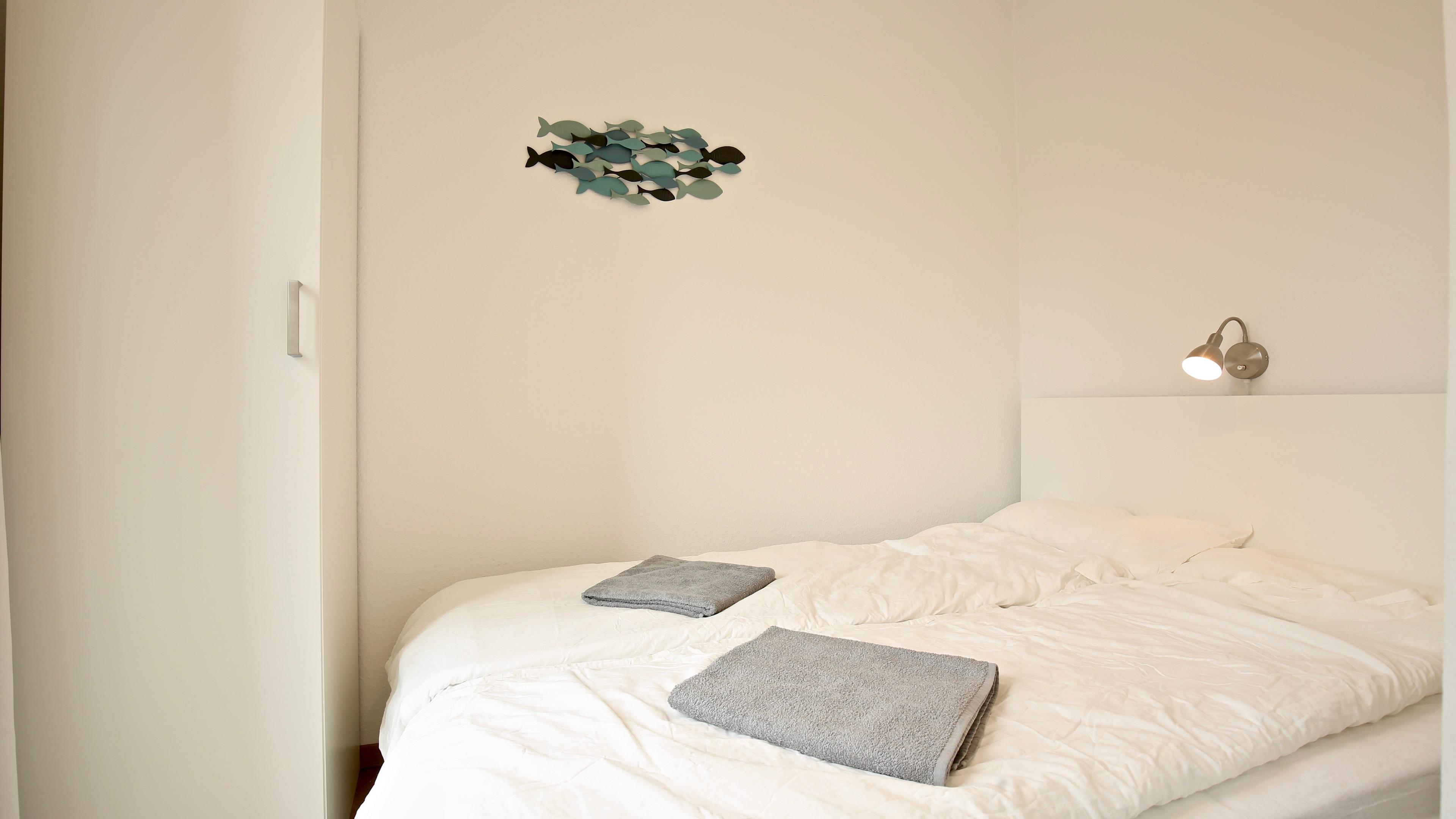 Das 1,40 m breite Bett im unteren Schlafzimmer eignet sich für 1-2 Personen. Alle Betten haben moderne Lattenroste und Latexmatratzen.