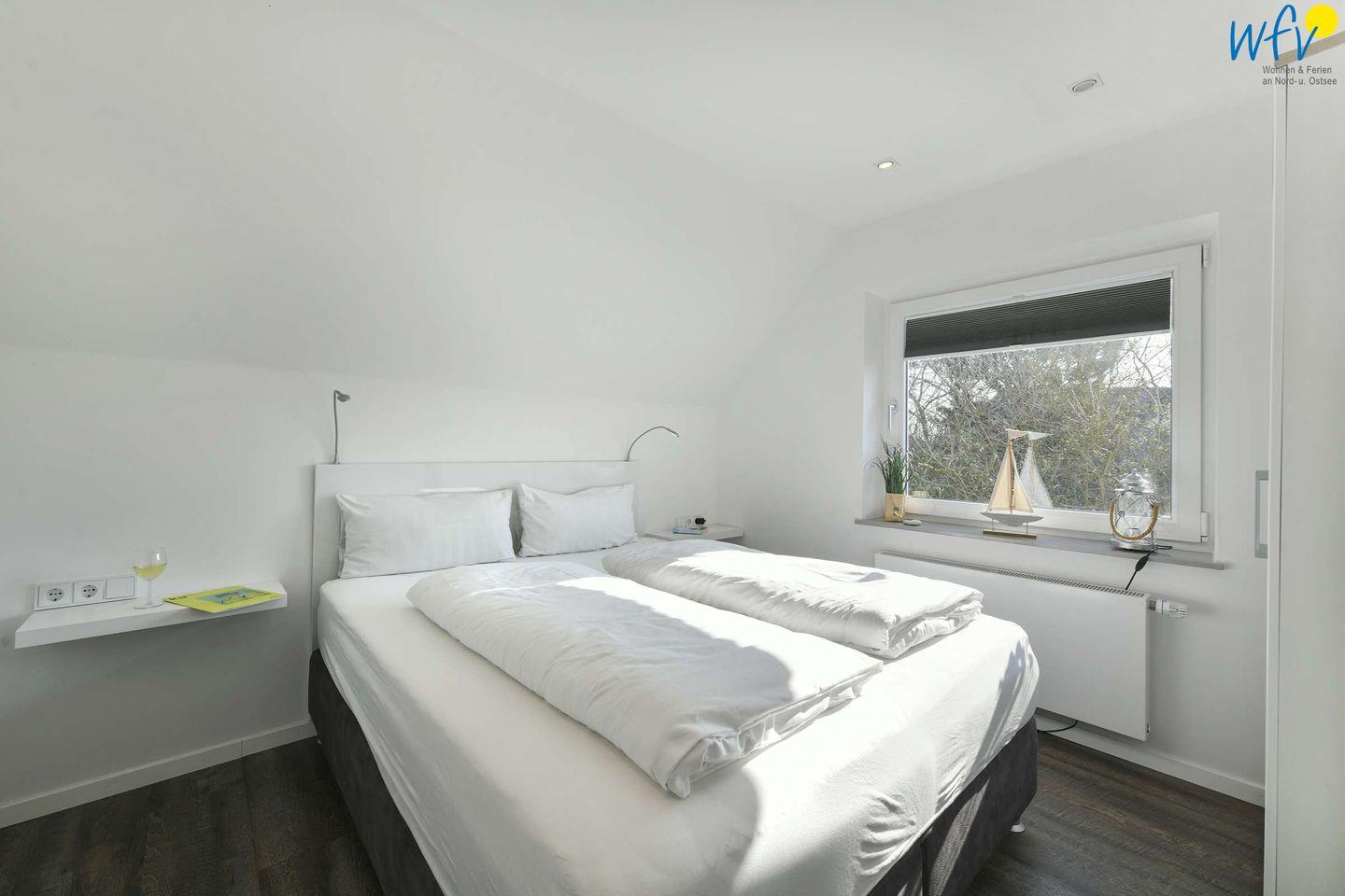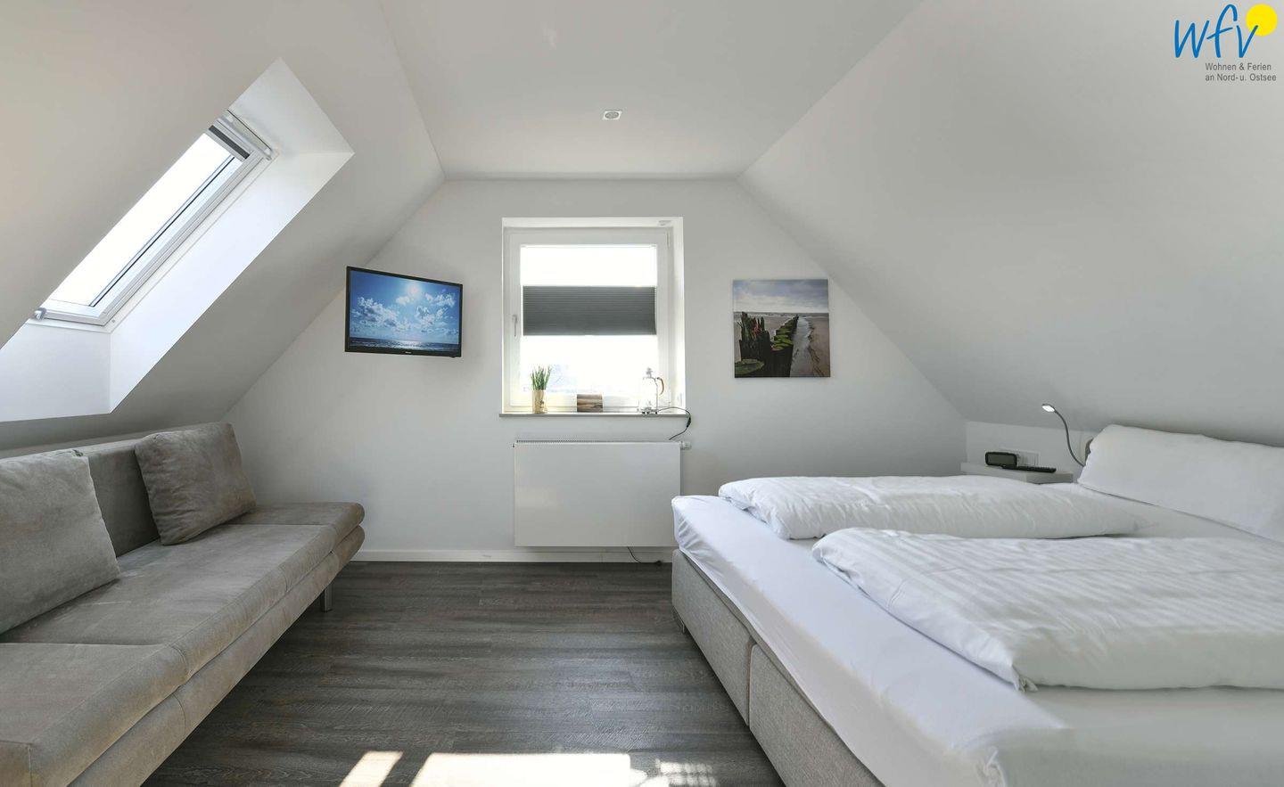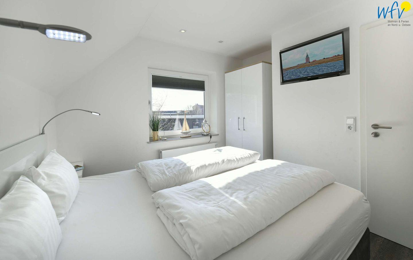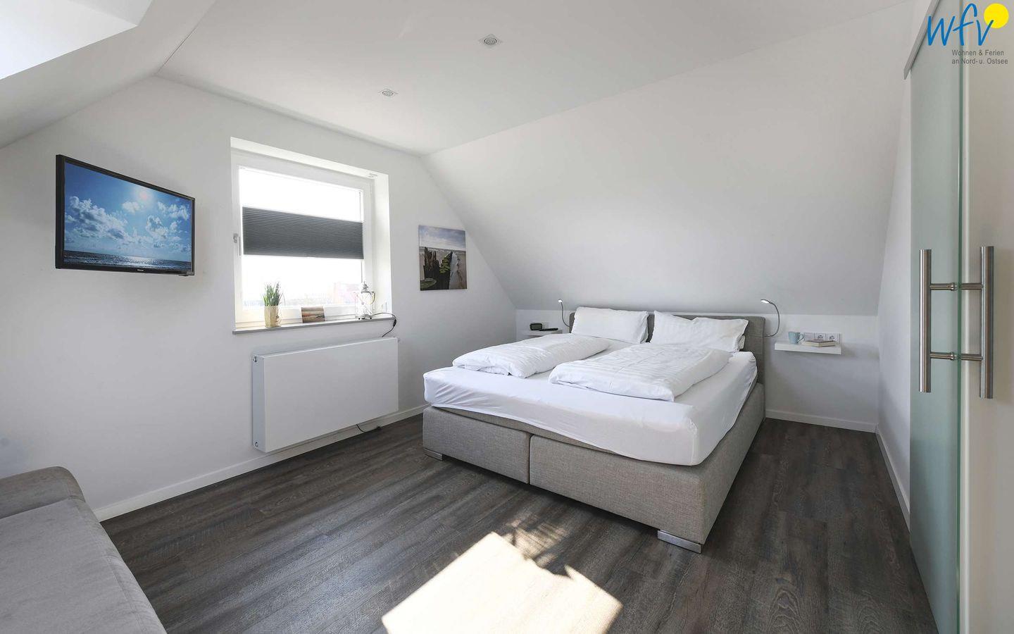 Die zwei separaten Schlafzimmer der Wangerooge Ferienwohnung sind jeweils mit einem komfortablen Boxspringbett (1,70m ) ausgestattet. Das Schlafzimmer im Obergeschoss verfügt über einen Kleiderschrank, das Schlafzimmer im Dachgeschoss über einen Ankleidebereich. In beiden Zimmern hängt jeweils ein modernes TV.