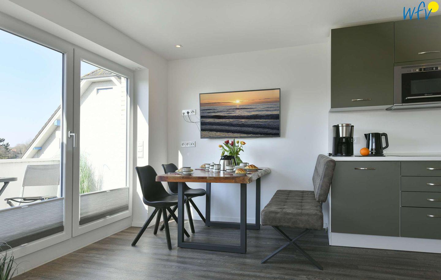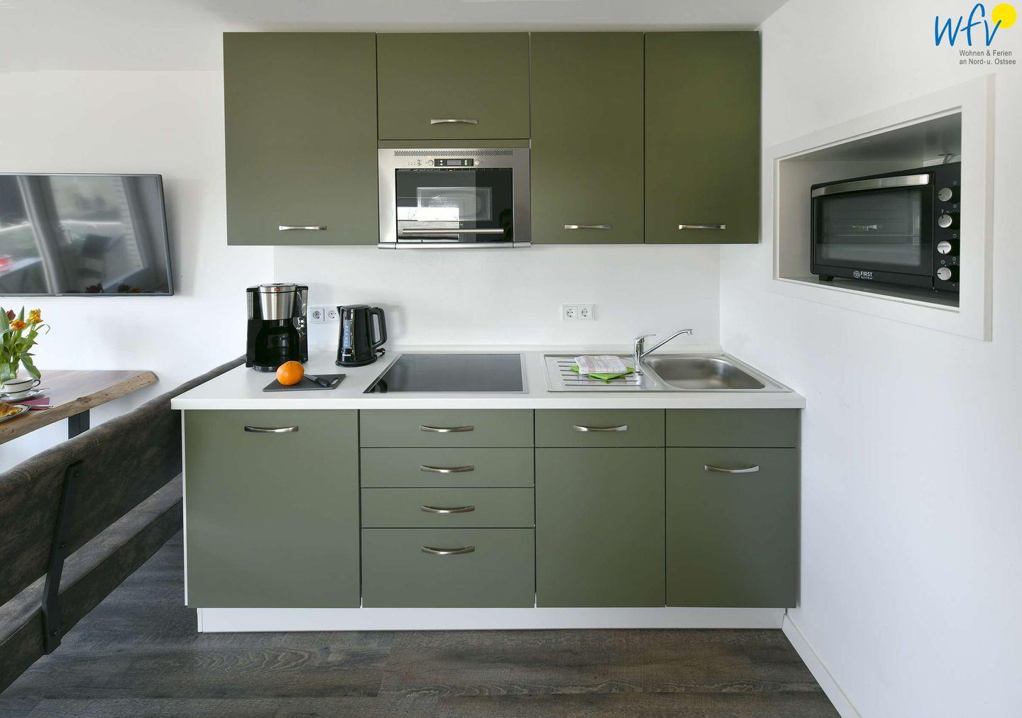 Damit Sie sich in Ihrem Urlaub auf Wangerooge angenehm selbst verpflegen können, ist in dem Wohnraum der Ferienwohnung eine sehr moderne Einbauküche integriert - u.a. mit Ceranherd, Spülmaschine, Mikrowelle und Grill-Backkombination sowie Kaffeemaschine, Milchaufschäumer, Wasserkocher und Toaster.
