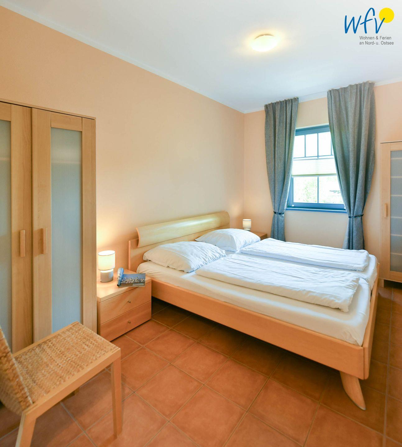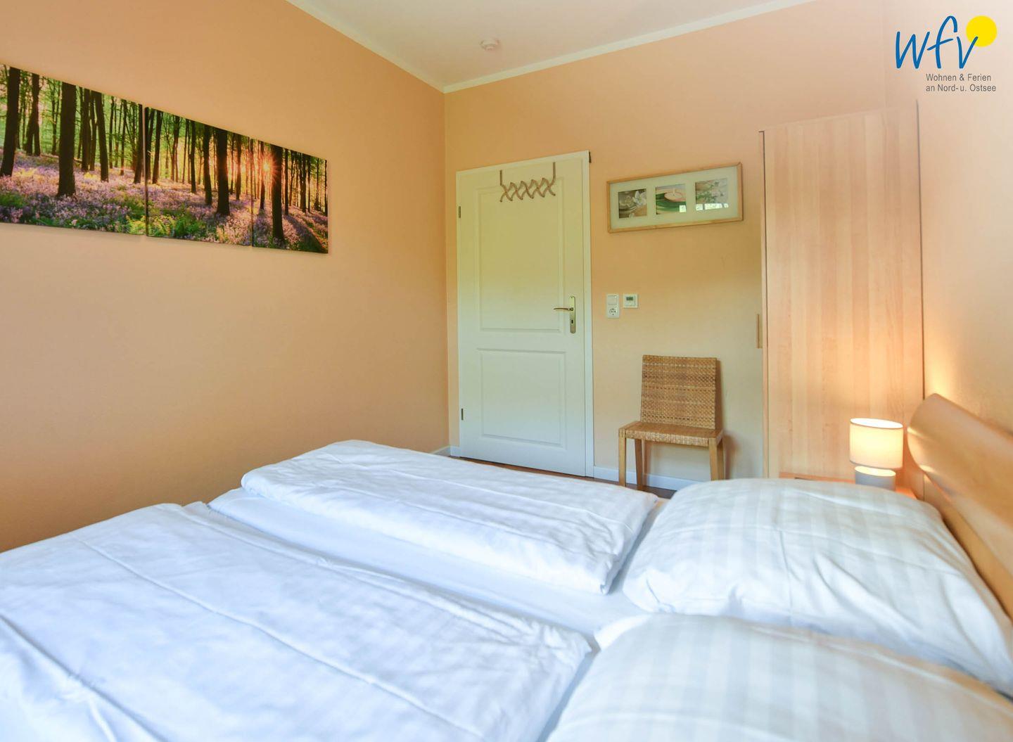Schlafmöglichkeiten bestehen in der Ferienwohnung durch zwei separate Schlafzimmer. Eines der Zimmer ist mit einem komfortablen Boxspringbett (1,80 m) und einem breiten Kleiderschrank ausgestattet. Das andere mit einem Doppelbett (1,70 m) und einer Schrankwand.