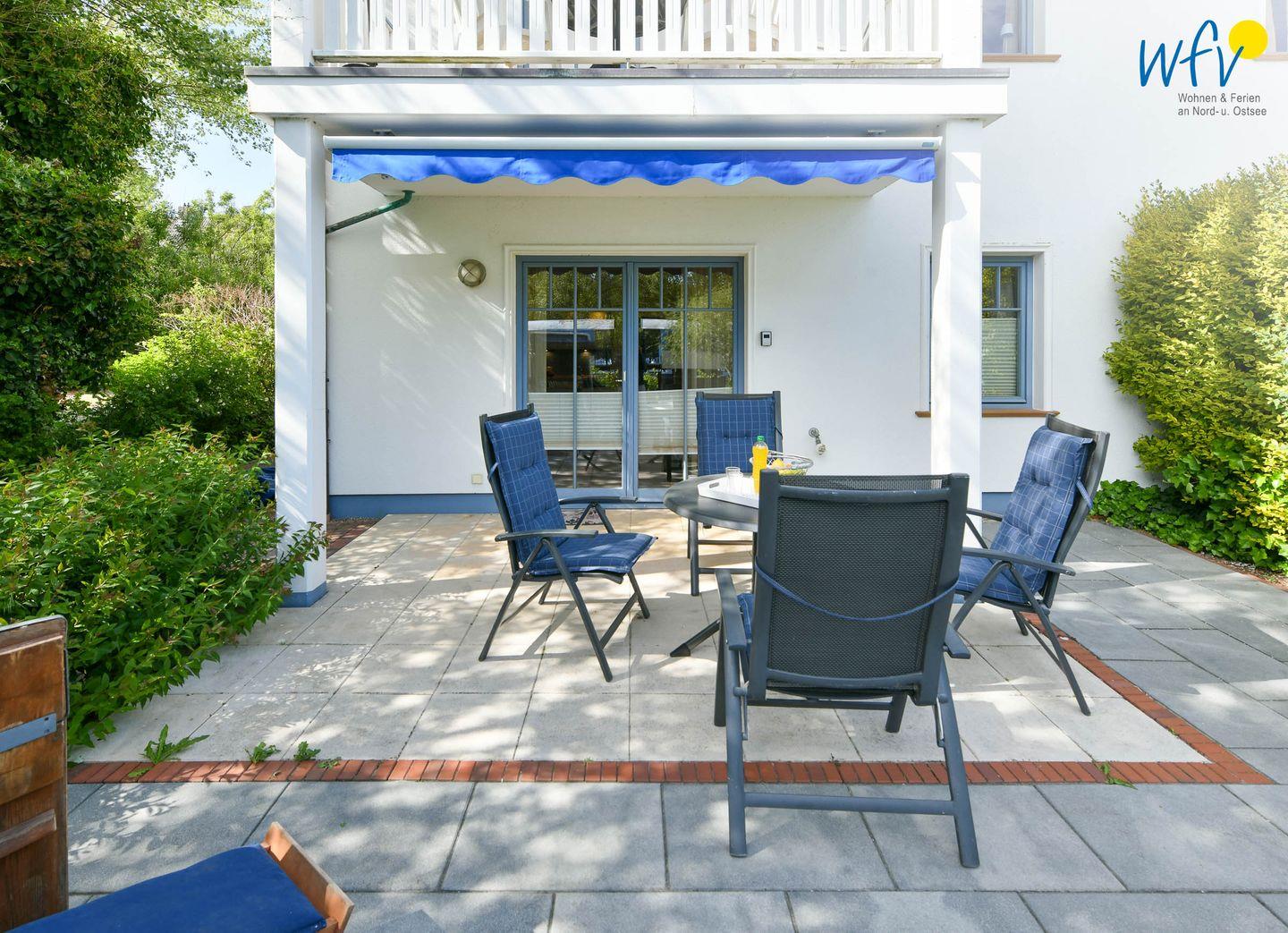 Das Highlight der Wangerooger Ferienwohnung ist die große Terrasse! Hier können Sie wunderbar am Esstisch zusammensitzen, gemeinsame Mahlzeiten einnehmen oder den Urlaubstag bei einem guten Glas Wein ausklingen lassen. Zum ausgiebigen Relaxen ist außerdem ein bequemer Strandkorb vorhanden - ideal, um wärmende Sonnenstrahlen und frische Nordseeluft zu genießen! Die Terrasse kann teilweise mit einer Markise überdacht werden, sodass es auch an heißen Tagen sehr angenehm ist.