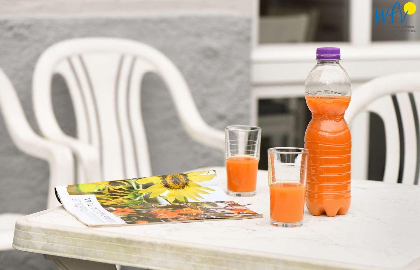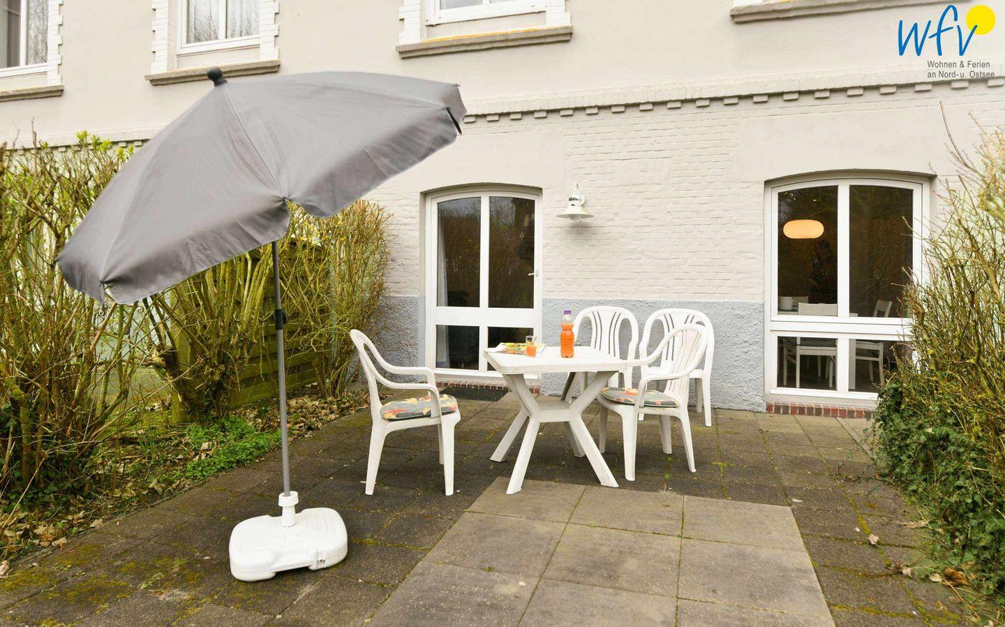 Gemütliche Gartenmöbel laden auf der Terrasse zum Entspannen ein. Sonne und wohltuende Nordseeluft machen den Urlaub auf Wangerooge zum Genuss!