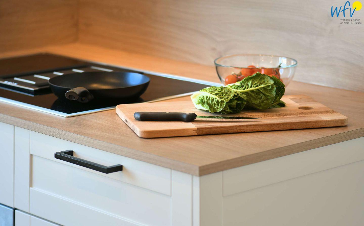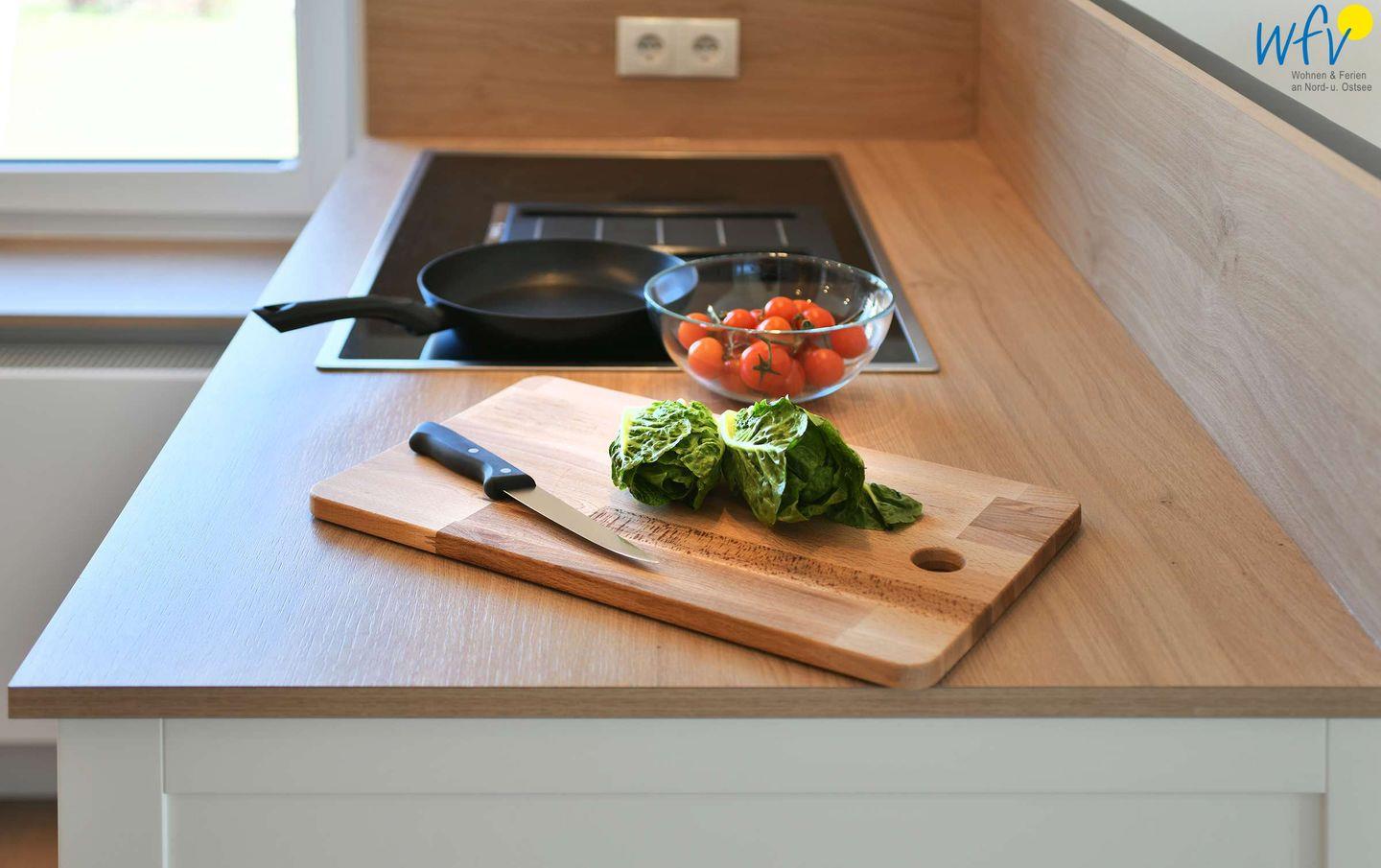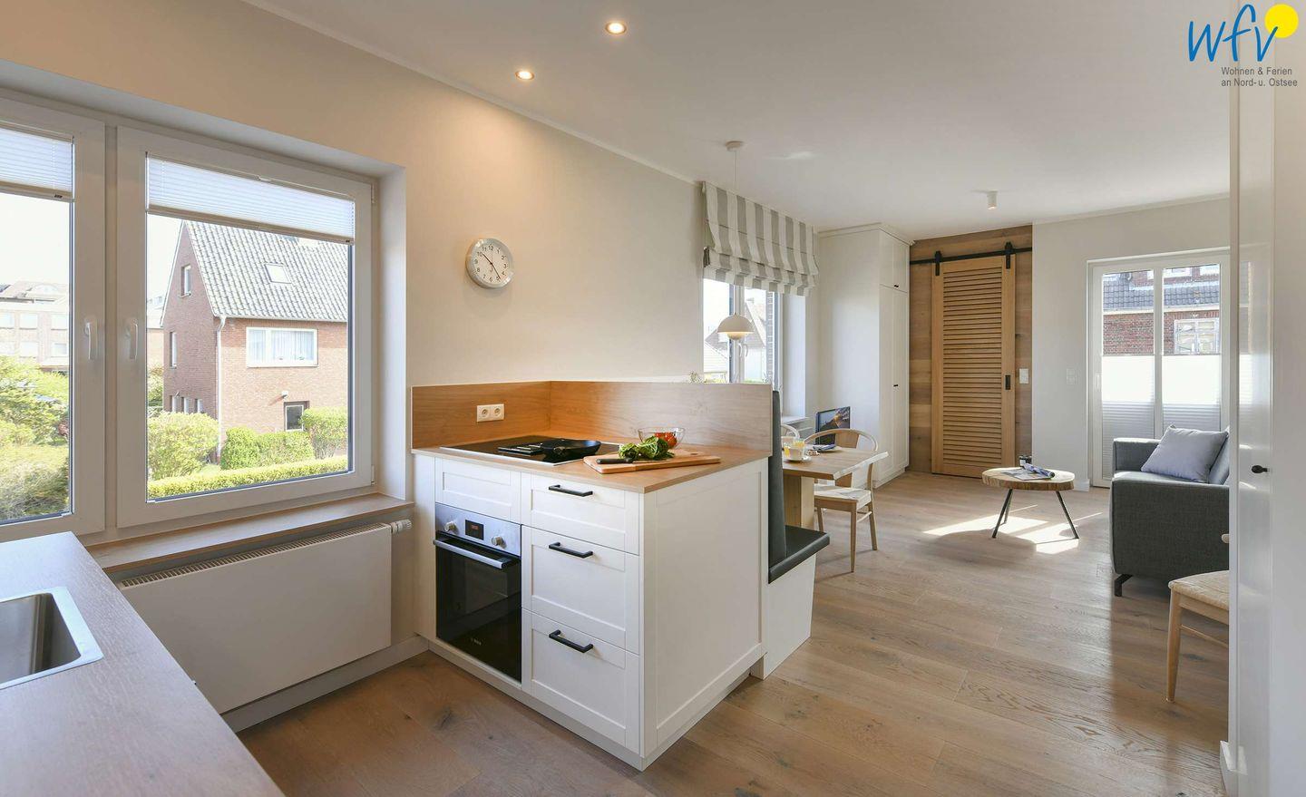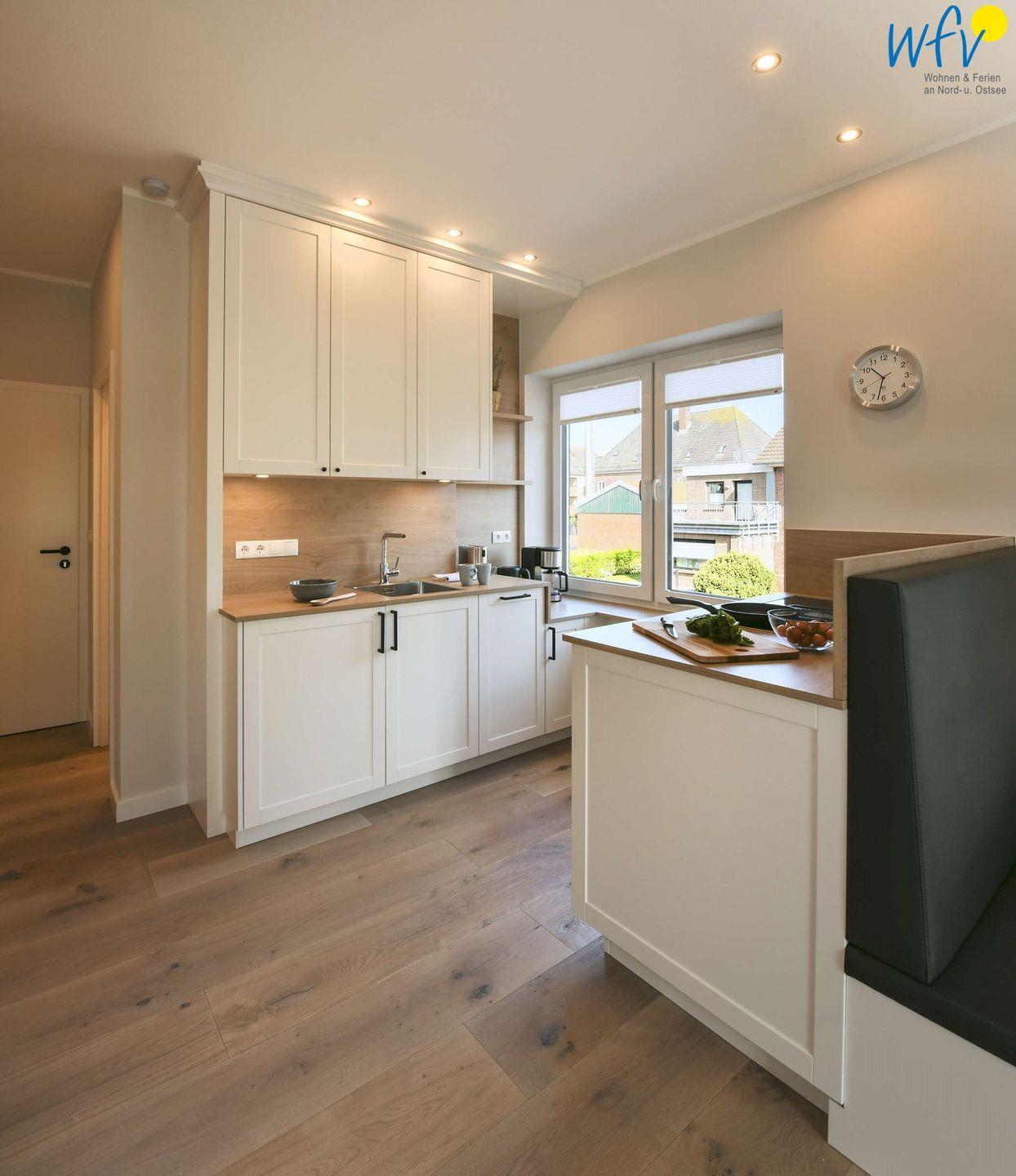 Damit Sie sich in Ihrem Urlaub auf Wangerooge bequem selbst verpflegen können, verfügt die Ferienwohnung über eine moderne Einbauküche (u.a. mit Herd/Backofen, Kühlschrank, Geschirrspüler sowie Kaffeemaschine, Wasserkocher und Toaster). Ein kleiner Essplatz mit schönem Blick nach draußen gehört ebenfalls zur Einrichtung.