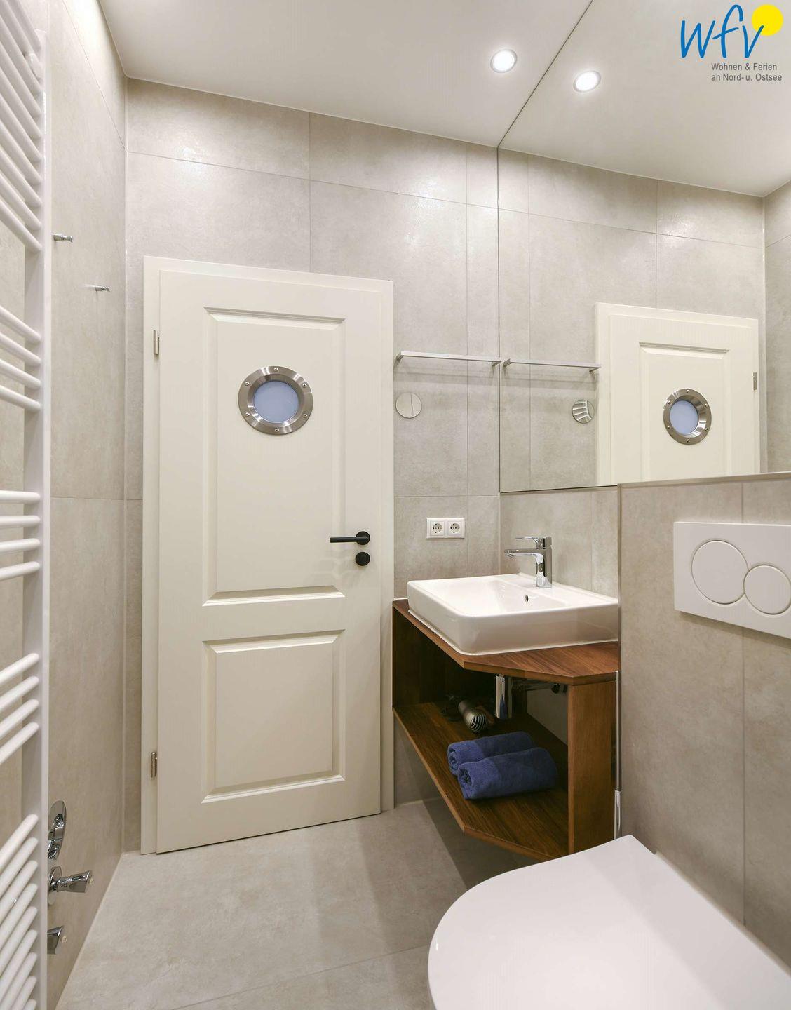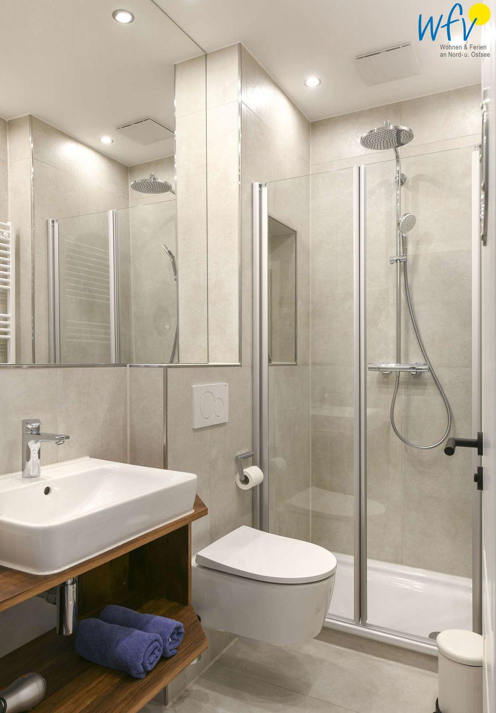 Das moderne Badezimmer ist im stilvollen Design gehalten - mit großem Spiegel, Waschtisch, WC, Handtuchheizung und Glasdusche. Ein Fön gehört zum festen Inventar.