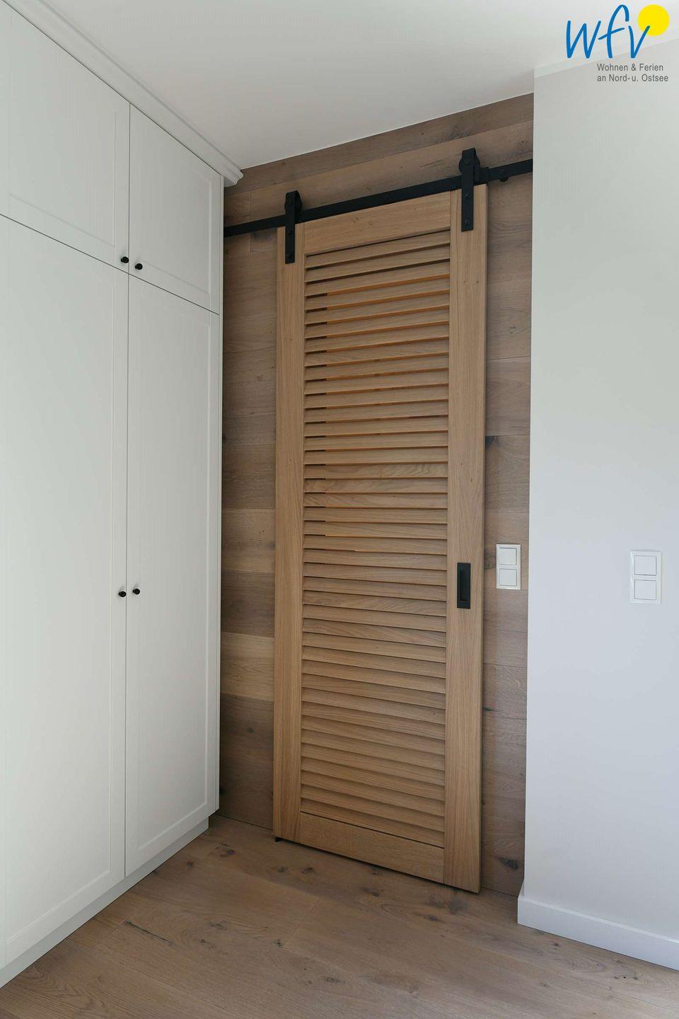 Ein besonderes Erlebnis erwartet Sie in der Schlafnische des Appartements auf Wangerooge, die sich in dem ursprünglichen Schlauchturm befindet. Eine moderne Einrichtung trifft hier auf historischen Charme: Von Ihrem komfortablen Bett aus können Sie bis in die Höhen des Schlauchturms schauen! (Das Doppelbett besitzt zwei einzelne Matratzen; je 90 cm x 2,00 cm.) Die Schlafnische ist vom Wohnraum durch eine hochwertige Schiebetür getrennt.