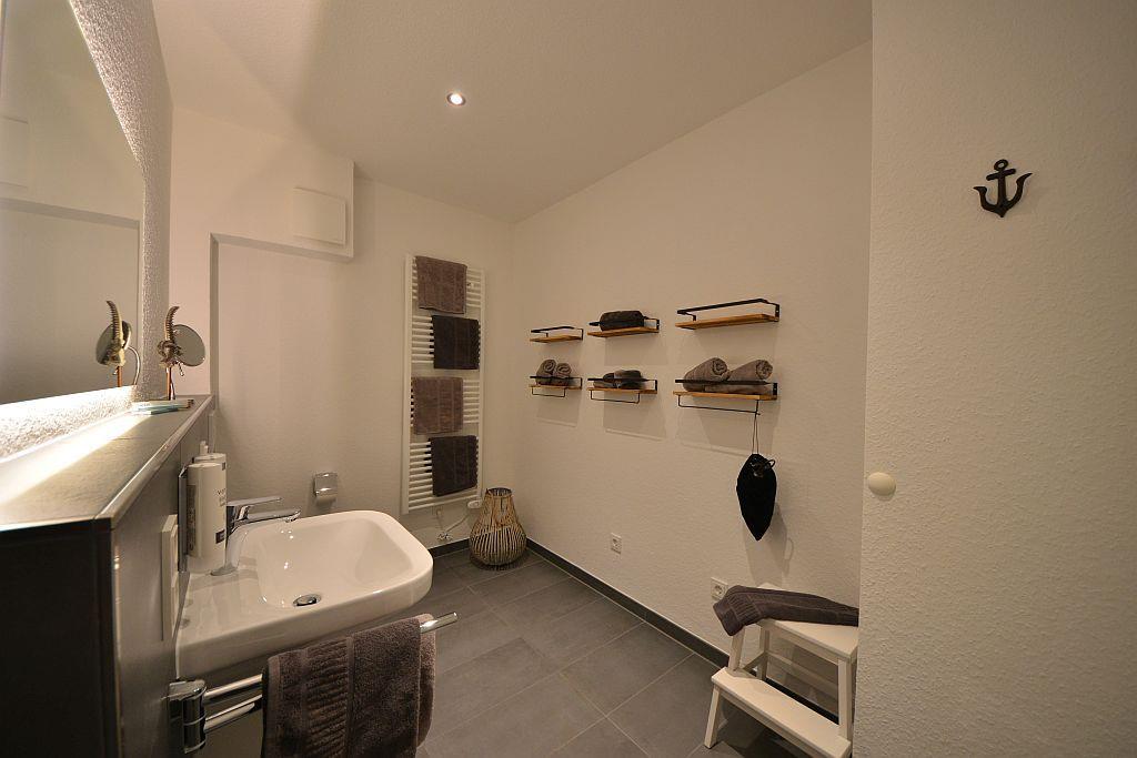 Das moderne Badezimmer besticht mit seiner geräumigen ebenerdigen Regendusche. Hier finden Sie das Kosmetikpaket der Marke ADA-Cosmetics mit Handseife und Shampoo. Auch an einen Föhn wurde für Sie gedacht. Selbstverständlich sind bei der Anreise die Betten frisch bezogen und die Handtücher liegen für Sie bereit.