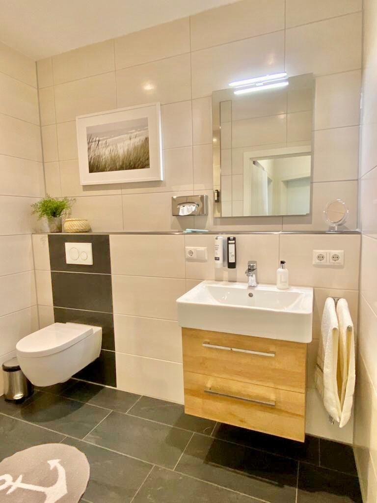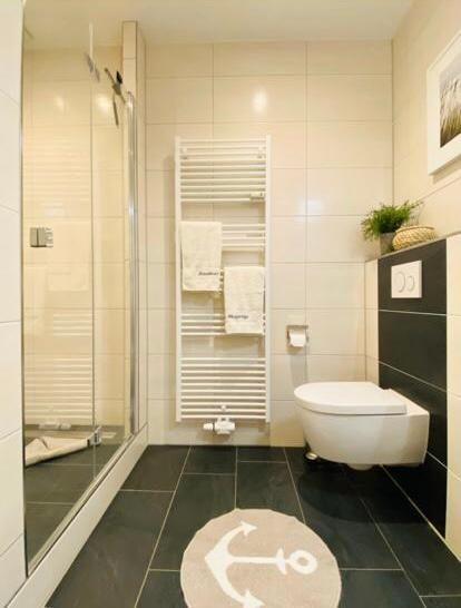 Der Sanitärbereich im "De Düün Twee" ist mit einer ebenerdigen begehbaren Dusche und Fußbodenheizung ausgestattet.