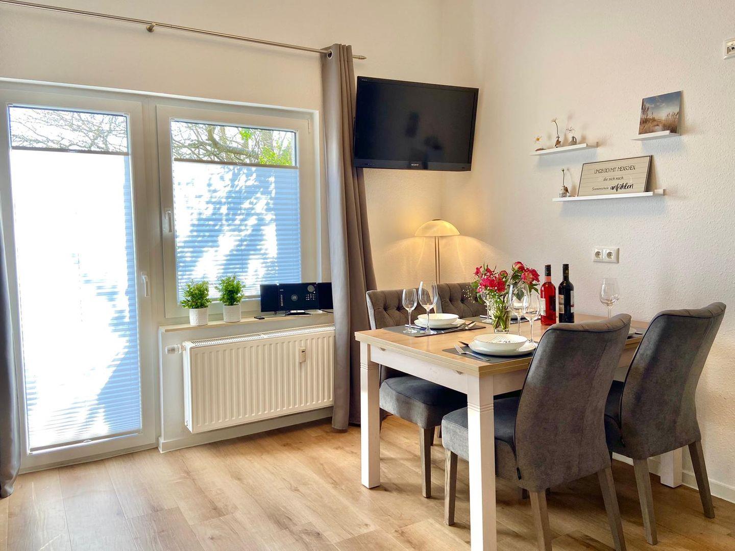 Zur Ausstattung Ihrer Ferienwohnung gehört eine große Küchenzeile mit Kaffeevollautomat, Kaffeemaschine, einem Wasserkocher, Backofen, Geschirrspüler und Gefrierschrank. Neben dem Küchenbereich können Sie mit vier Personen am Esstisch speisen. Wenn Sie im Freien essen möchten, bietet sich dafür der möblierte Balkon an.