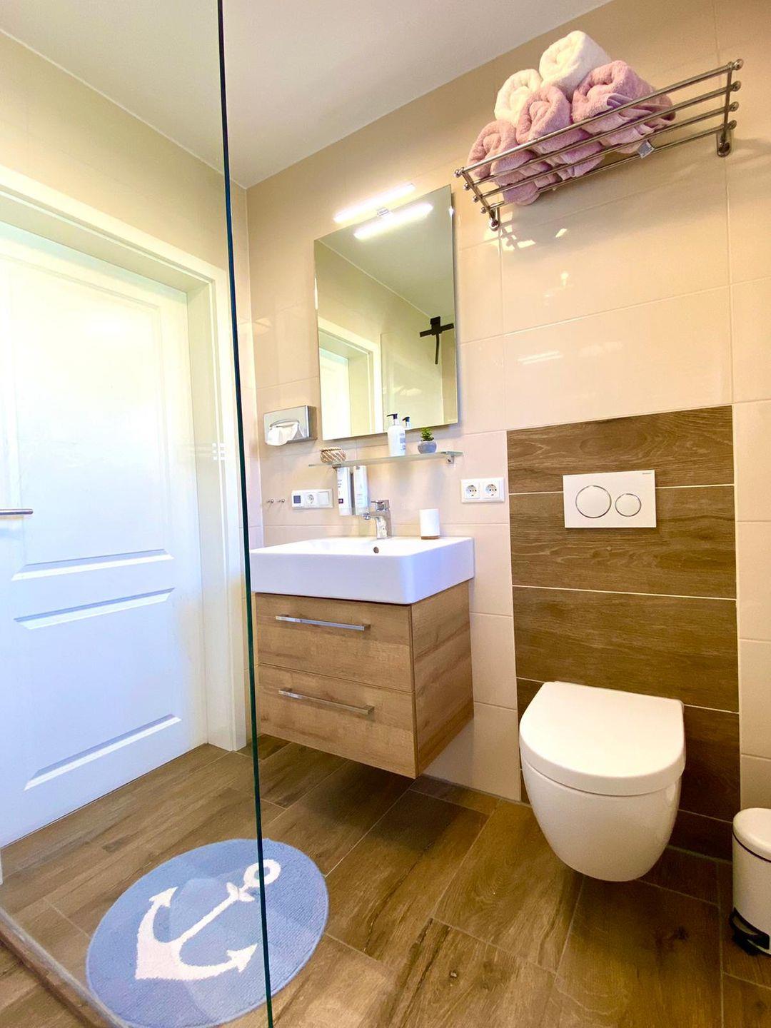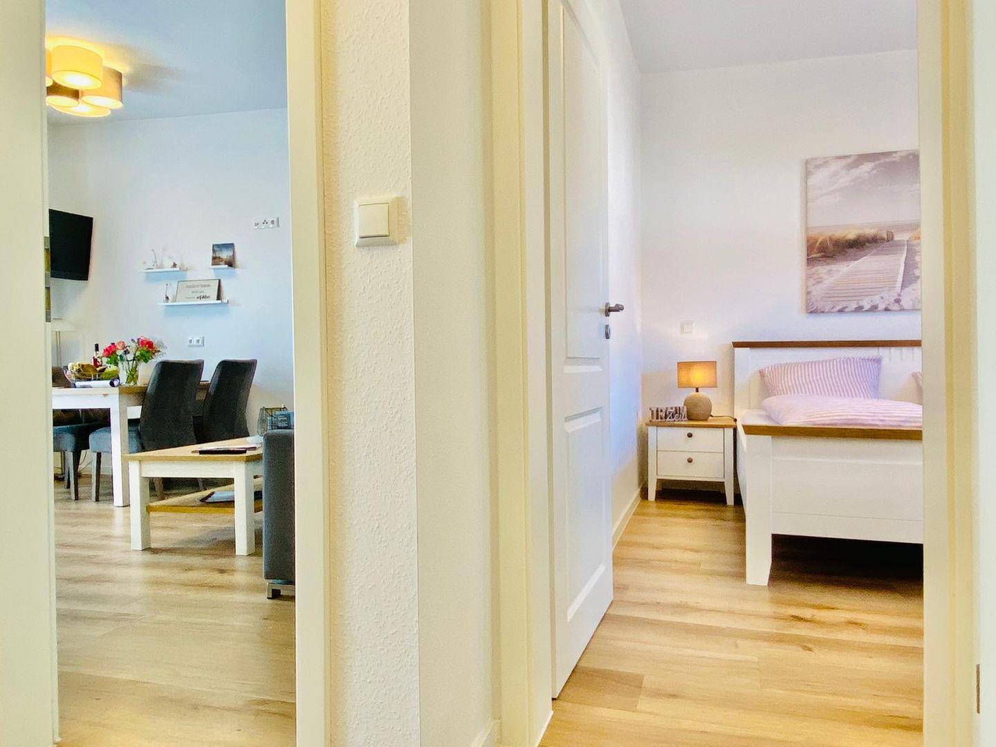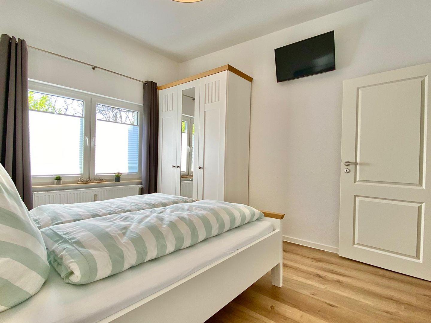 Des Weiteren hat die Wohnung zwei Schlafzimmer mit jeweils einem Doppelbett (200 x 200 cm). In den Schlafzimmern sind außerdem ein Flachbild-TV, Nachttische und Kleiderschrank vorhanden. Der Sanitärbereich in "De Düün Veer" ist mit einer ebenerdigen begehbaren Dusche und mit Fußbodenheizung ausgestattet.
