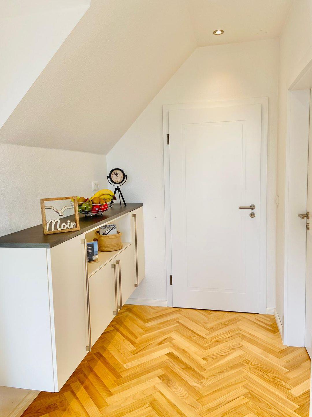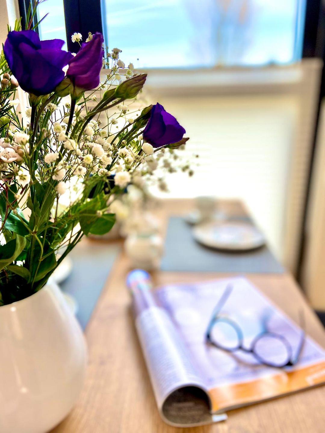 In der modern und geschmackvoll eingerichteten Ferienwohnung erwartet Sie ein einladendes Wohnambiente, das durch einen offenen Küchenbereich und ein stilvolles Wohnzimmer gekennzeichnet ist. Die hochwertige Küche ist mit allen notwendigen Utensilien ausgestattet, einschließlich eines Cerankochfeldes, Backofens, Kühlschranks, Geschirrspülers, Wasserkochers, einem Kaffeevollautomaten und einer Kaffeemaschine, sodass Sie sich selbst ein köstliches Frühstück oder ein Abendessen zubereiten können. Der angrenzende Essbereich mit einem Esstisch lädt zu gemeinsamen Mahlzeiten ein.