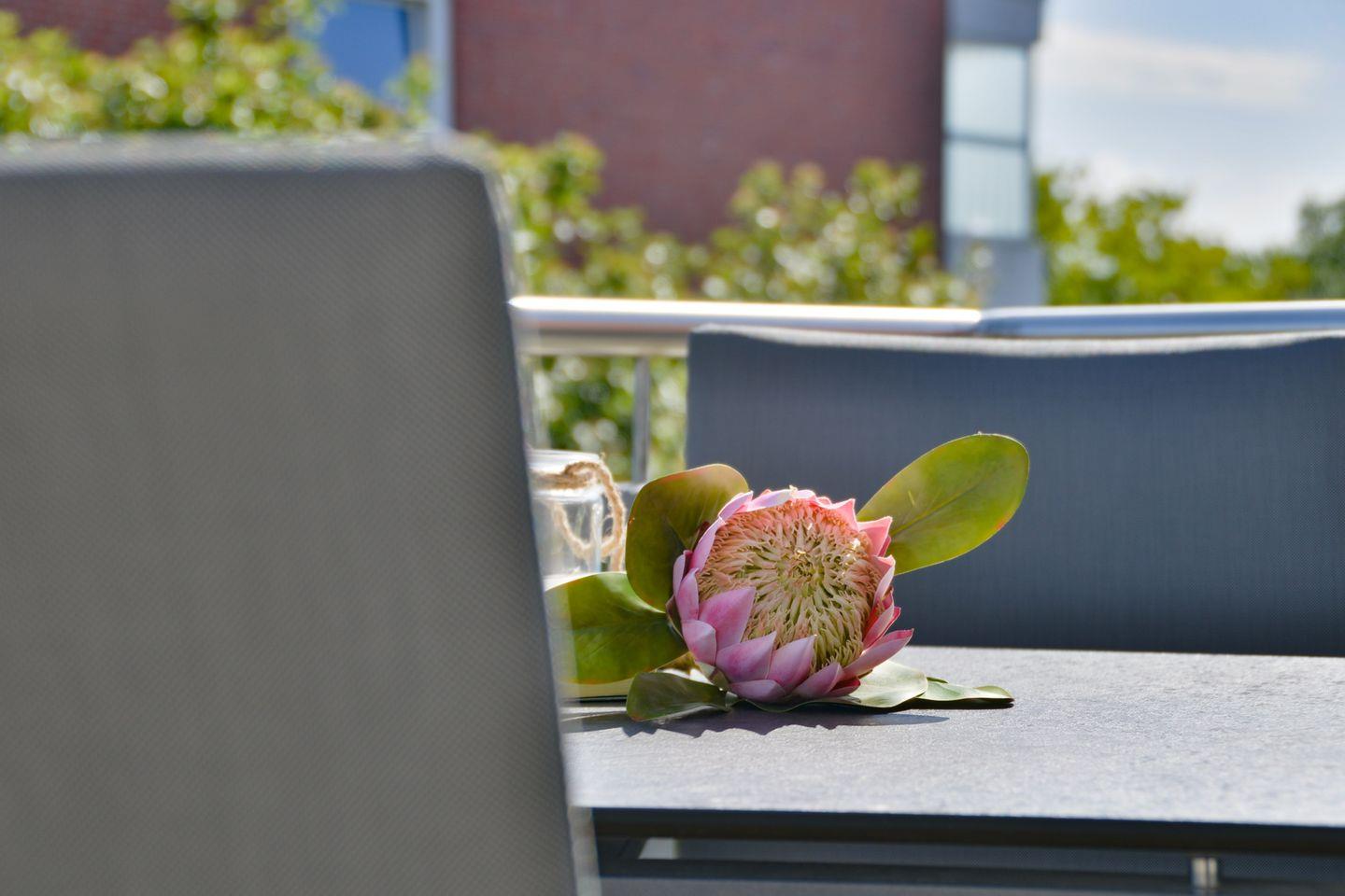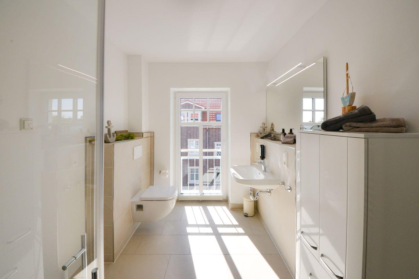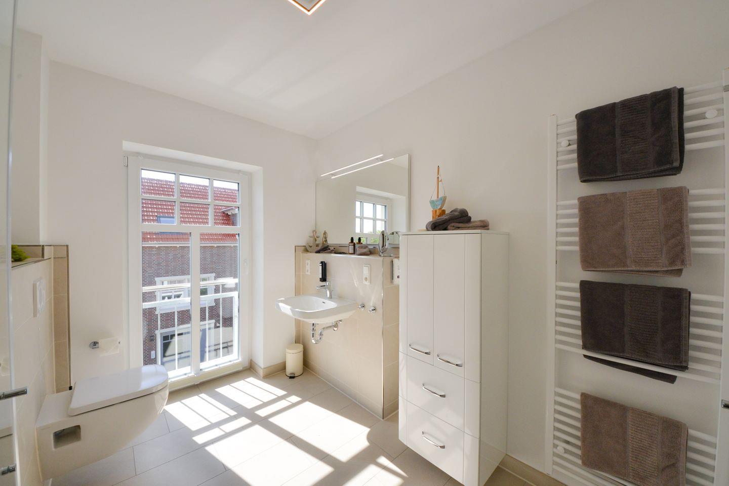 Das Tageslichtbad ist ausgestattet mit einer ebenerdigen Dusche. Zur Ausstattung gehört selbstverständlich ein großer beleuchteter Spiegel über dem Waschbecken, ein Föhn, ein Schminkspiegel und eine komplette Kosmetikserie. Sie brauchen weder Handwaschseife noch Duschgel oder Shampoo mitbringen. Dieses haben wir alles für Sie vorbereitet. Der Vollständigkeit halber gehören natürlich auch flauschige Duschtücher und Handtücher aus Biobaumwolle.