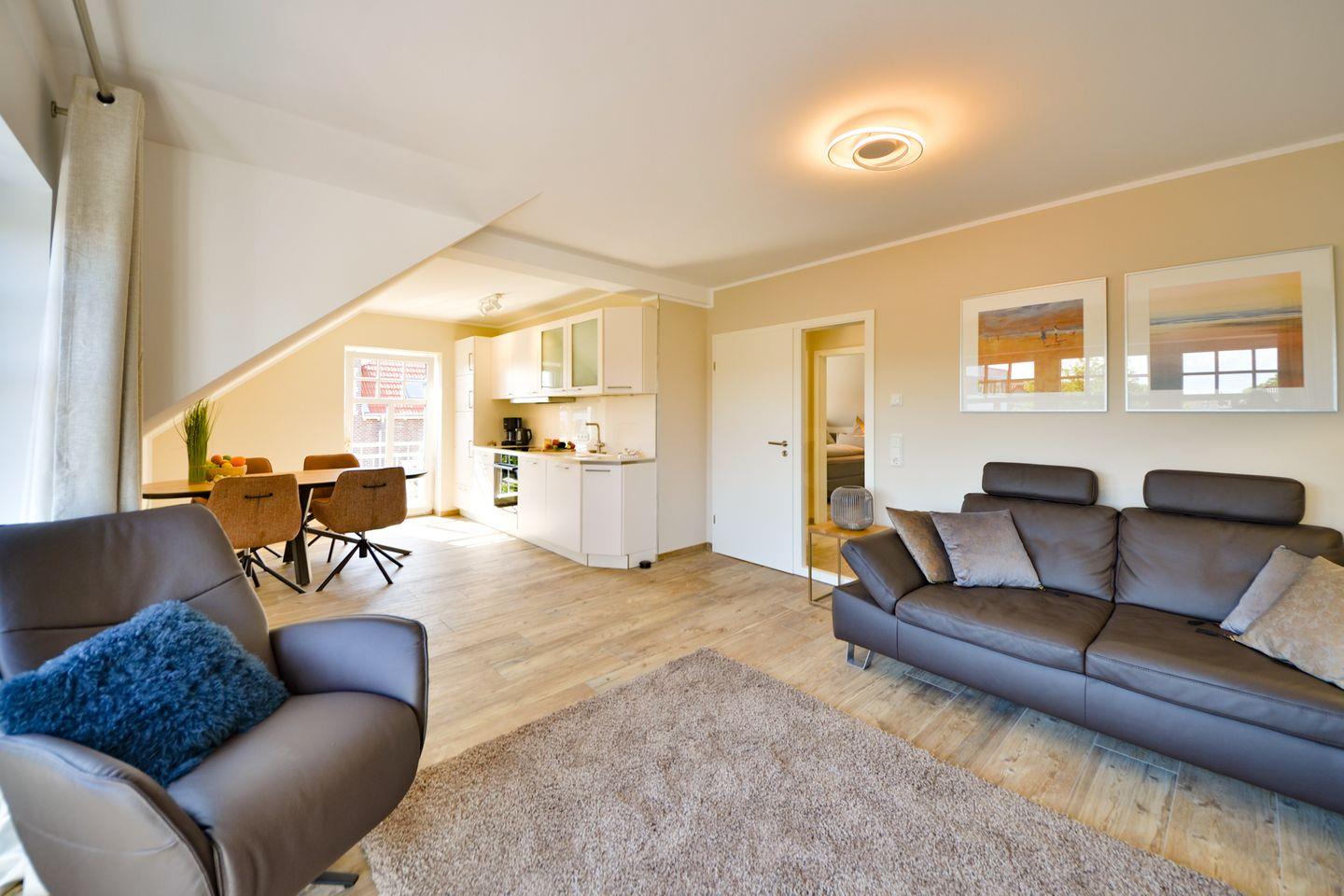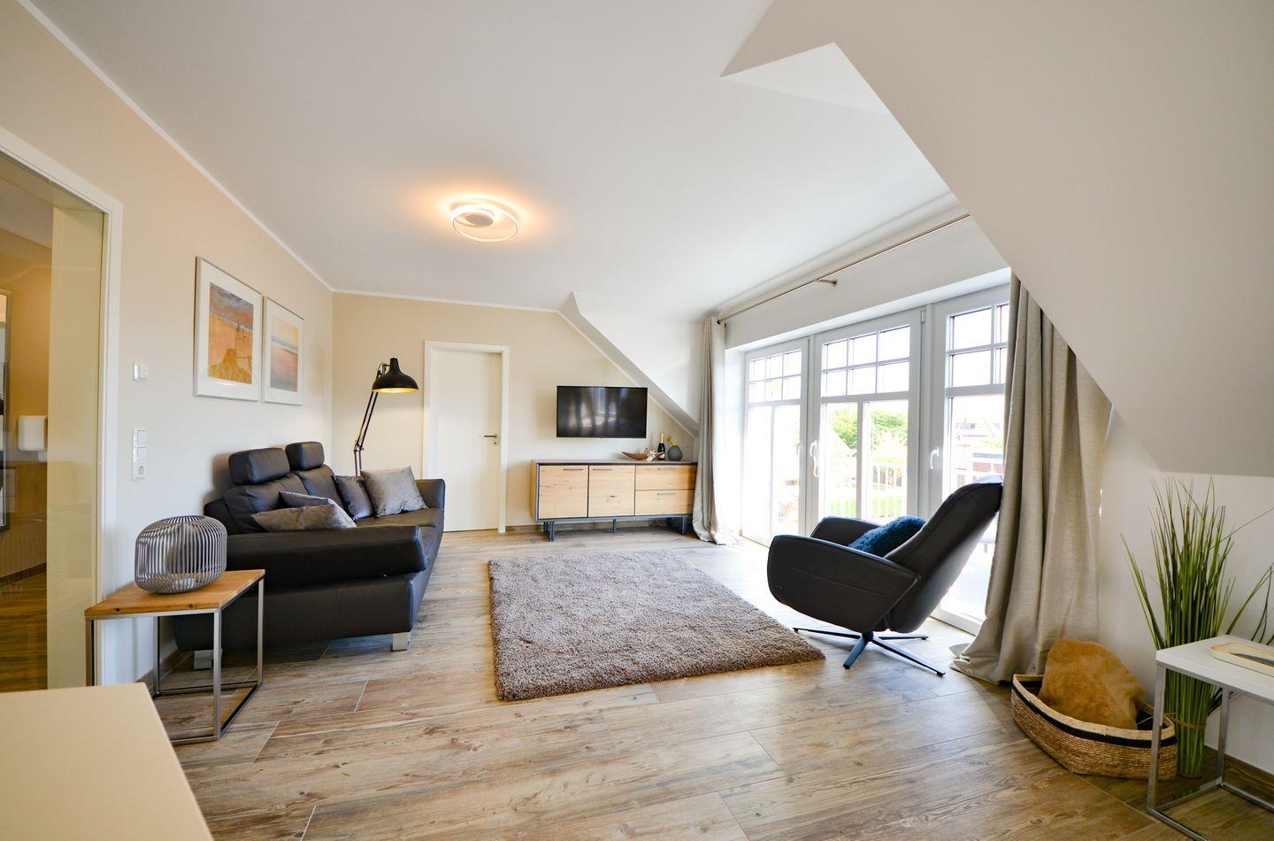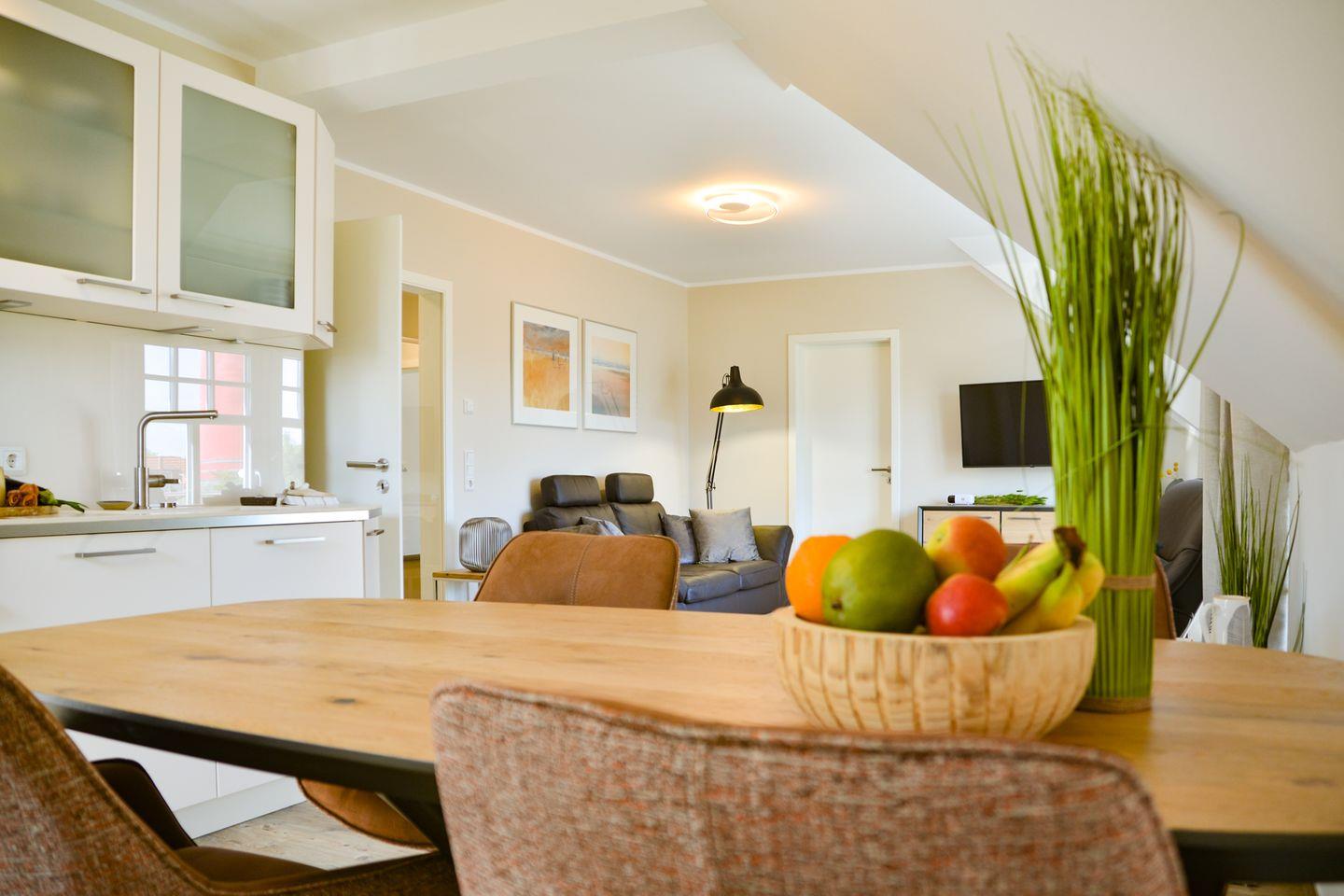 Der offene Wohn- und Essbereich besticht durch große bodentiefe Fenster zum Südbalkon. Hier entspannt man gerne auf der Couch und genießt einen leckeren Wein beim Blick auf den alten Leuchtturm. Aber auch die Technik lässt sich sehen. Ein 50 Zoll Fernseher lenkt Sie bei schlechtem Wetter schnell von Sturm und Regen ab.