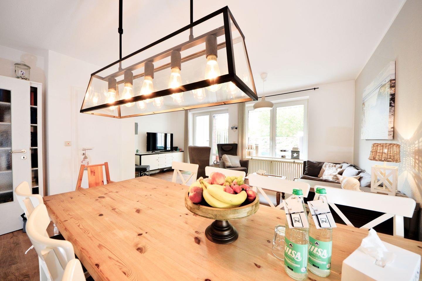 Direkt nach dem Betreten des kleinen gemütlichen Flures offenbart sich Ihnen der Blick in das geräumige Ess- und Wohnzimmer. Hier erwartet Sie ein großer Esstisch, an dem alle acht Personen und ein Kleinkind Platz finden. Als kleines Willkommensgeschenk stellen wir Ihnen Mineralwasser bereit.
