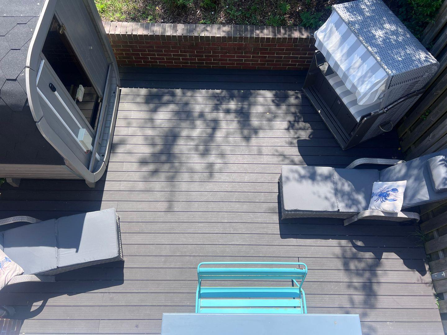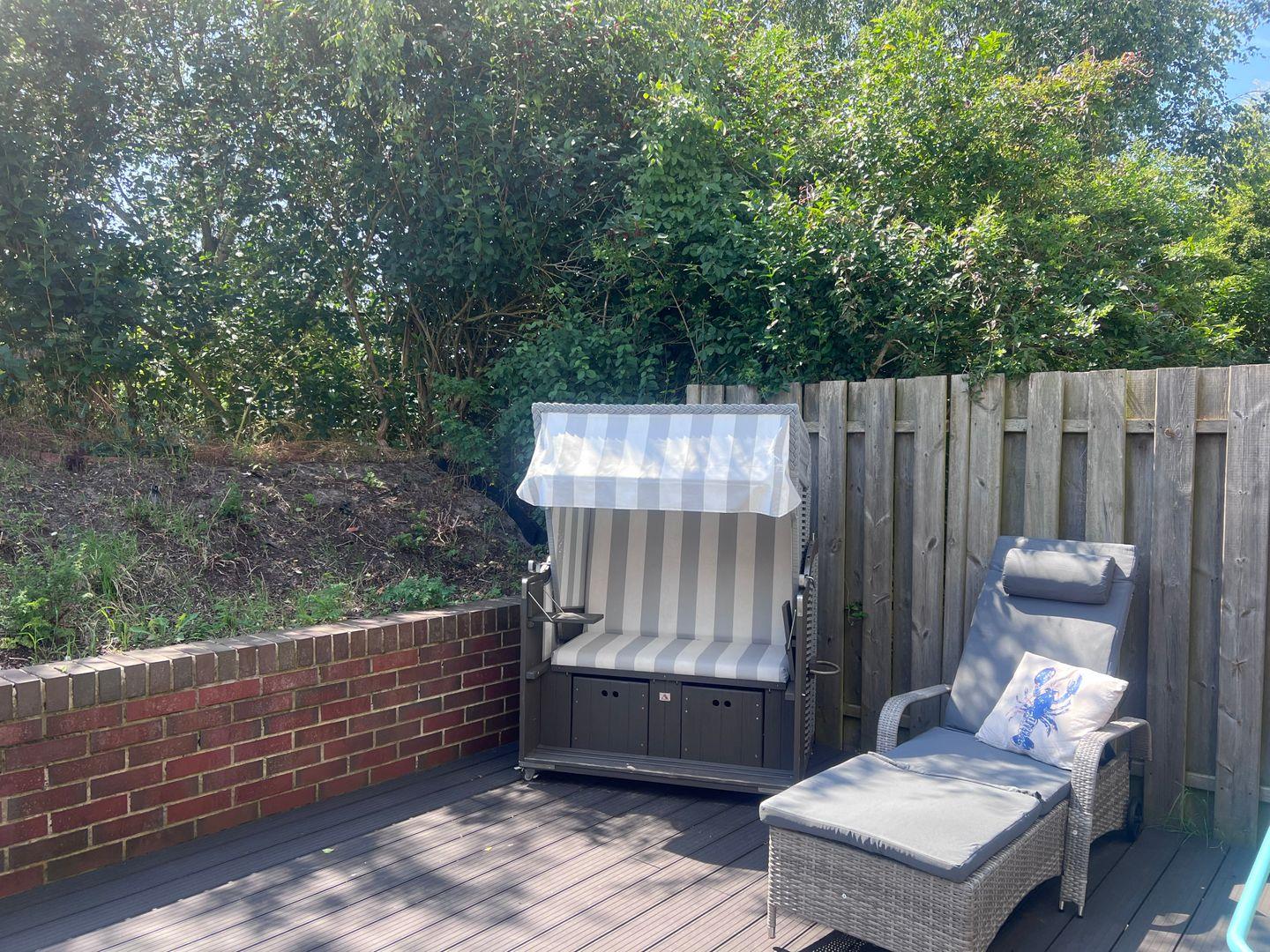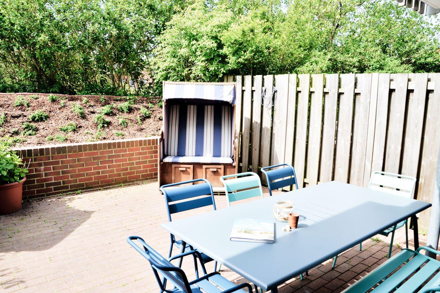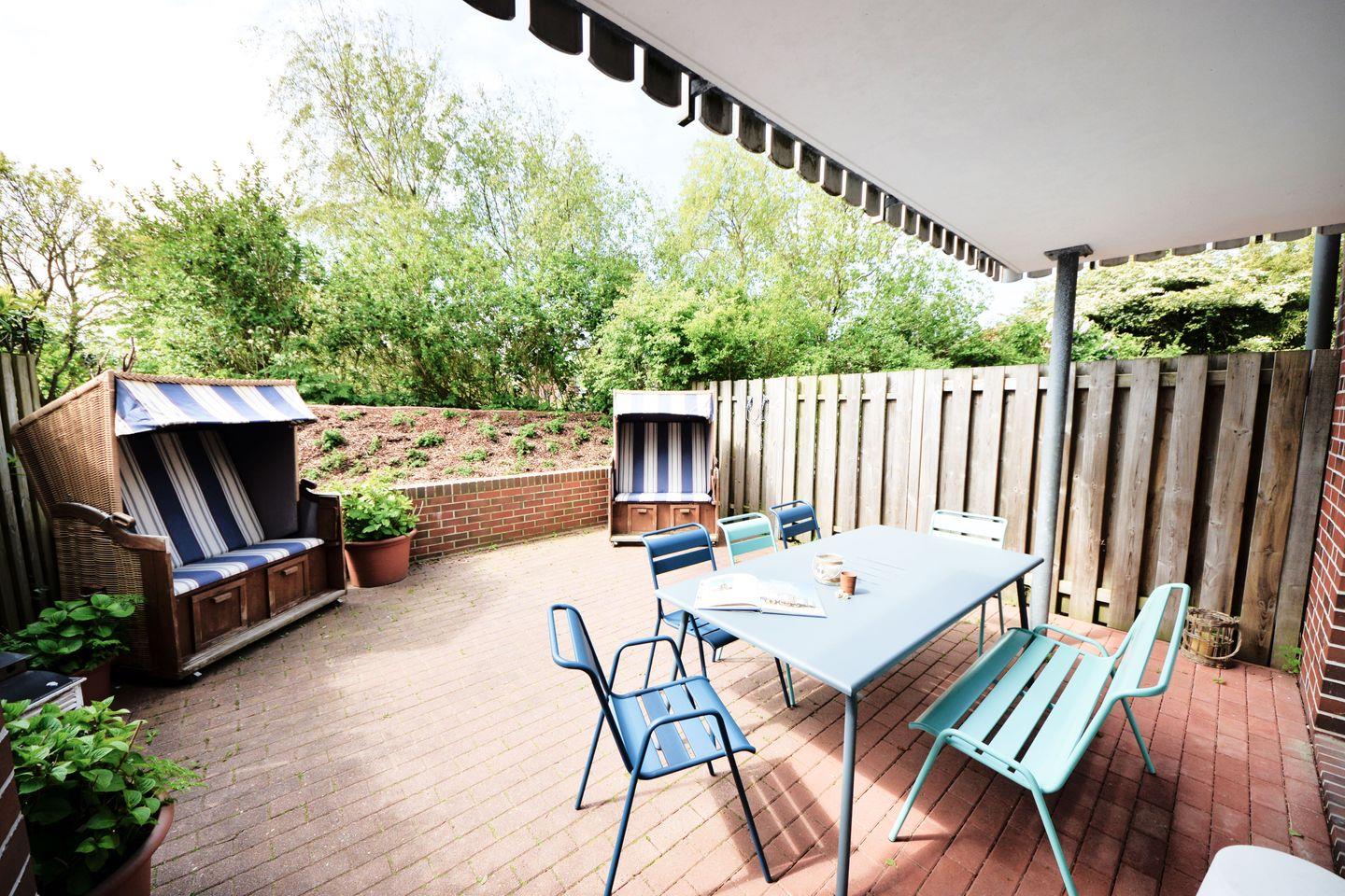 Im Wohnzimmer befindet sich auch die gemütliche Couchecke in Kombination mit zwei komfortablen Fernsehsesseln. Hier können Sie es sich abends entspannt zusammen vor dem Flachbildfernseher gemütlich machen. Vom Wohnzimmer aus erhalten Sie Zugang zur gemütlichen Außenterrasse mit Sitzecke und zwei Strandkörben.