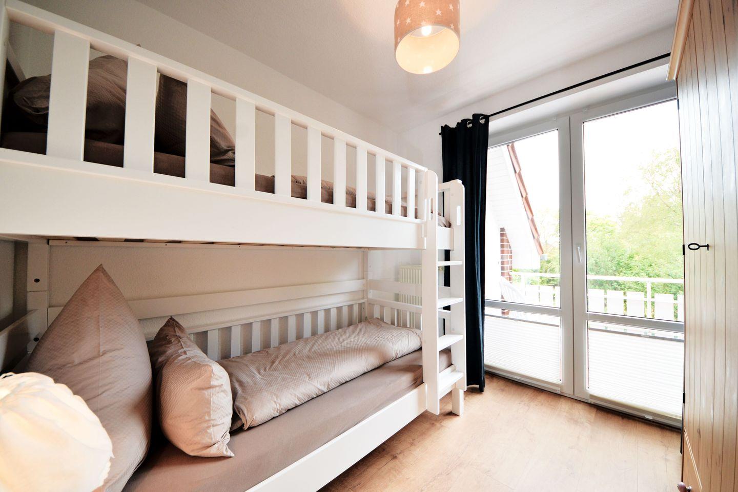 Auch das Schlafzimmer 3 hat einen Zugang zum Balkon. Hier steht ein komfortables Etagenbett, ideal für Kinder und Jugendliche. Im 4. Schlafzimmer mit Dachschräge stehen zwei weitere gemütliche Einzelbetten. Alle Betten werden vor Ihrer Ankunft mit hochwertiger Bio-Baumwollbettwäsche bezogen.