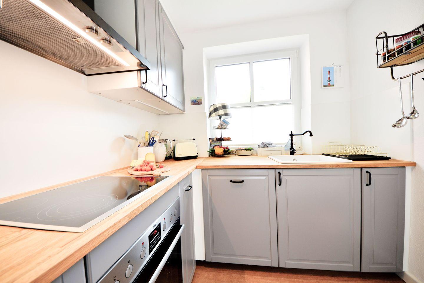 Die Küche im altskandinavischen Design ist voll ausgestattet. Sie bietet Ihnen genug Platz und Möglichkeiten, sich komplett selbst zu versorgen. Hier finden Sie eine Geschirrspülmaschine, Backofen, Kaffeemaschine, Toaster, Wasserkocher und vieles mehr.