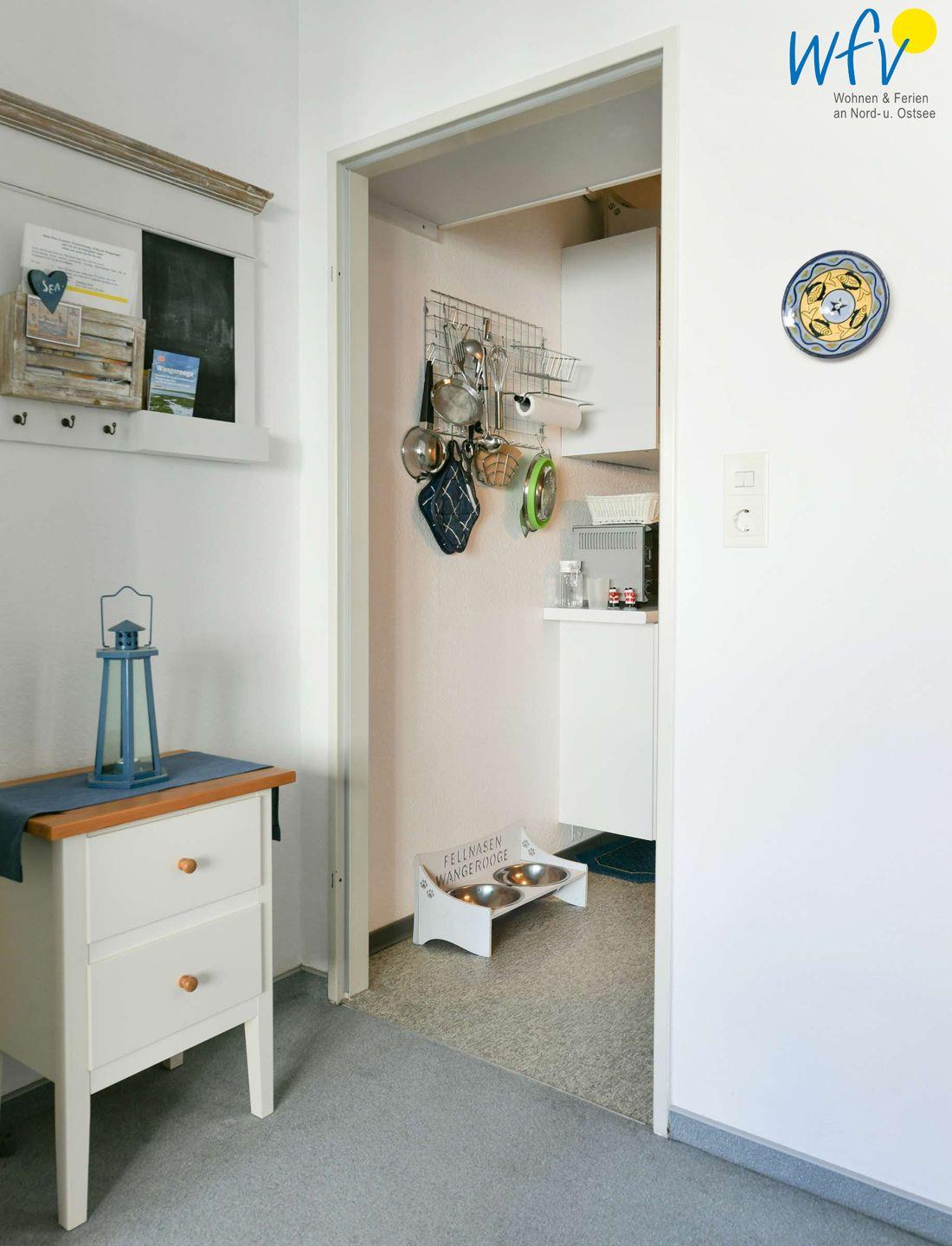 Für den Snack zwischendurch oder kleine Mahlzeiten verfügt die Ferienwohnung auf Wangerooge über eine Kochnische - u.a. mit Herd, Backofen, Mikrowelle und diversen Kleingeräten. Ein Esstisch mit bequemer Sitzbank gehört ebenfalls zur Einrichtung.