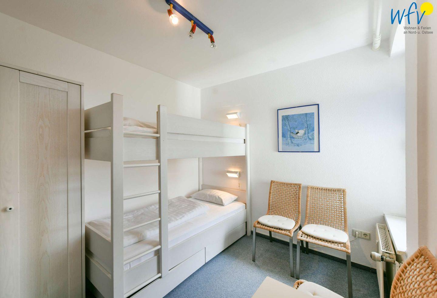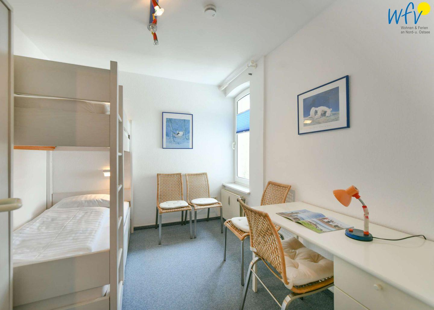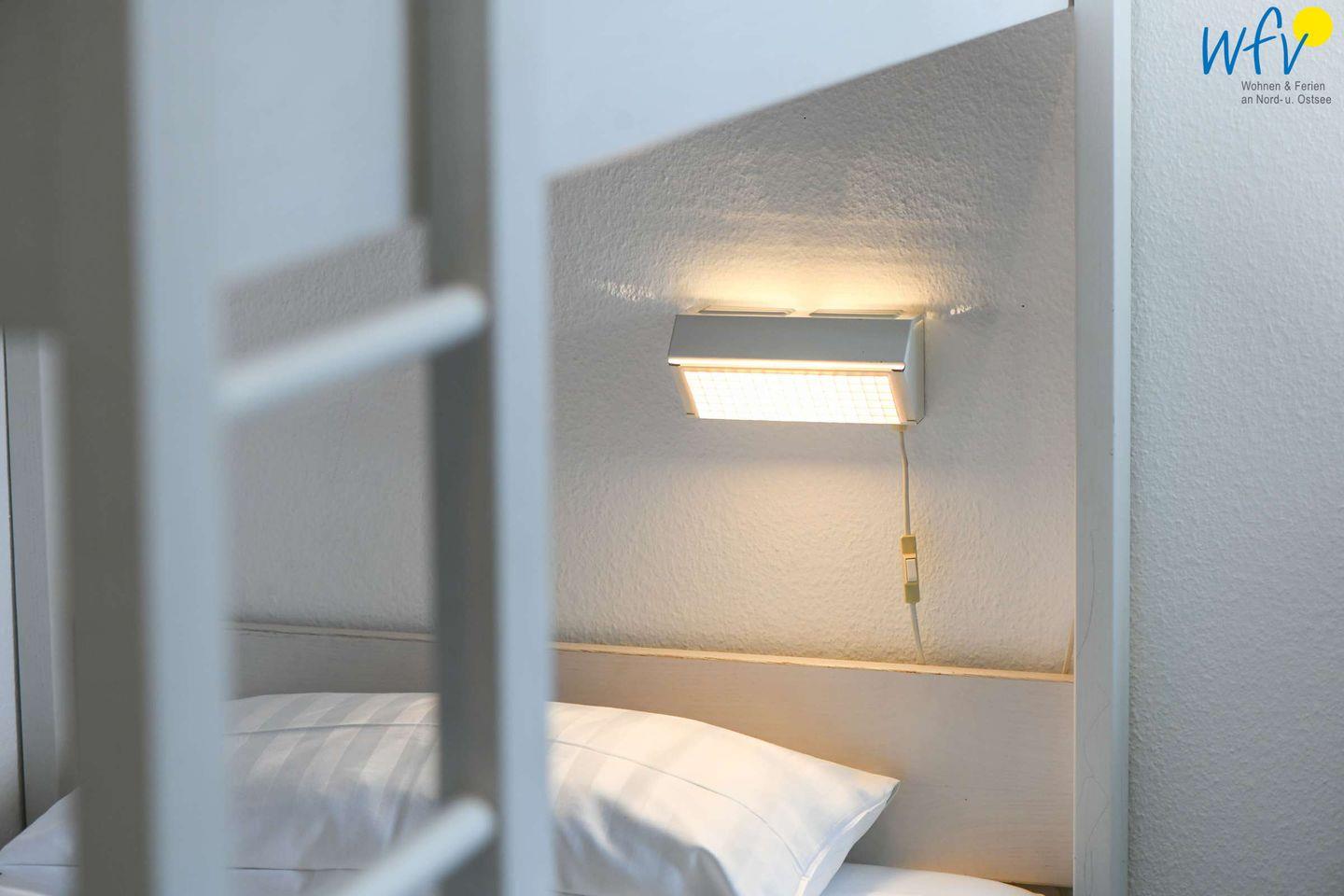 Drei separate Schlafzimmer ermöglichen Ihnen bei einem Urlaub mit mehreren Personen sehr angenehme Aufteilungsmöglichkeiten. Im unteren Bereich befindet sich ein Kinderschlafzimmer mit Etagenbett und kleinem Schreibtisch, im oberen Wohnbereich liegen zwei weitere Schlafzimmer - jeweils mit Doppelbett.