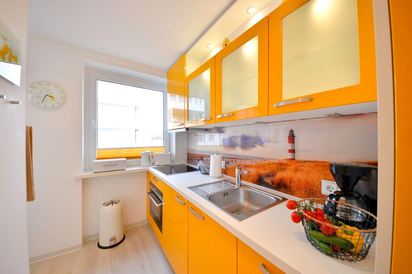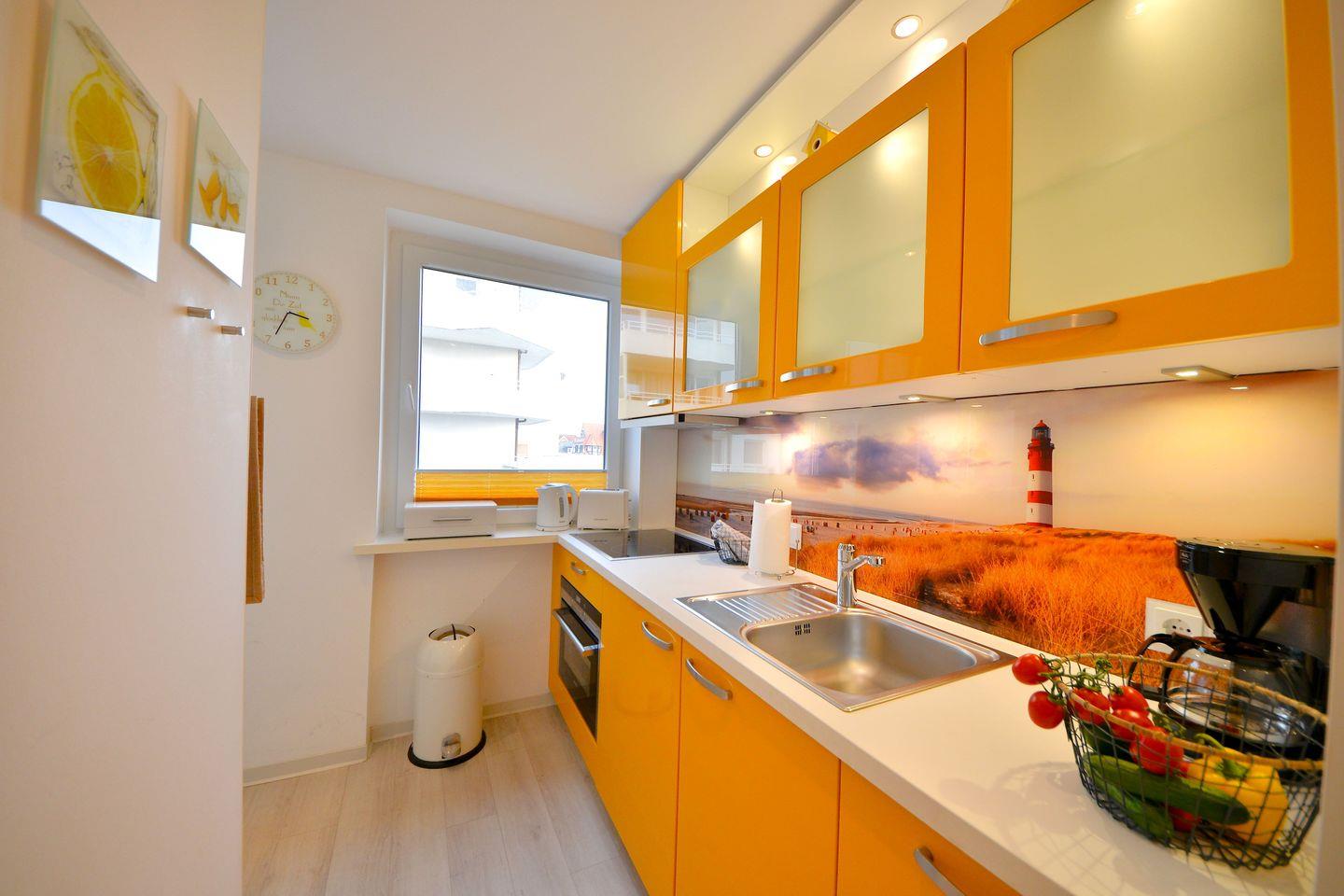 Die moderne Küche ist voll ausgestattet. Sie bietet Ihnen die Gelegenheit, sich nach allen Wünschen selbstständig zu versorgen. Die Küche verfügt über Geschirrspülmaschine, Wasserkocher, Mikrowelle, Toaster, Teekanne, Kaffeemaschine und vieles mehr.
