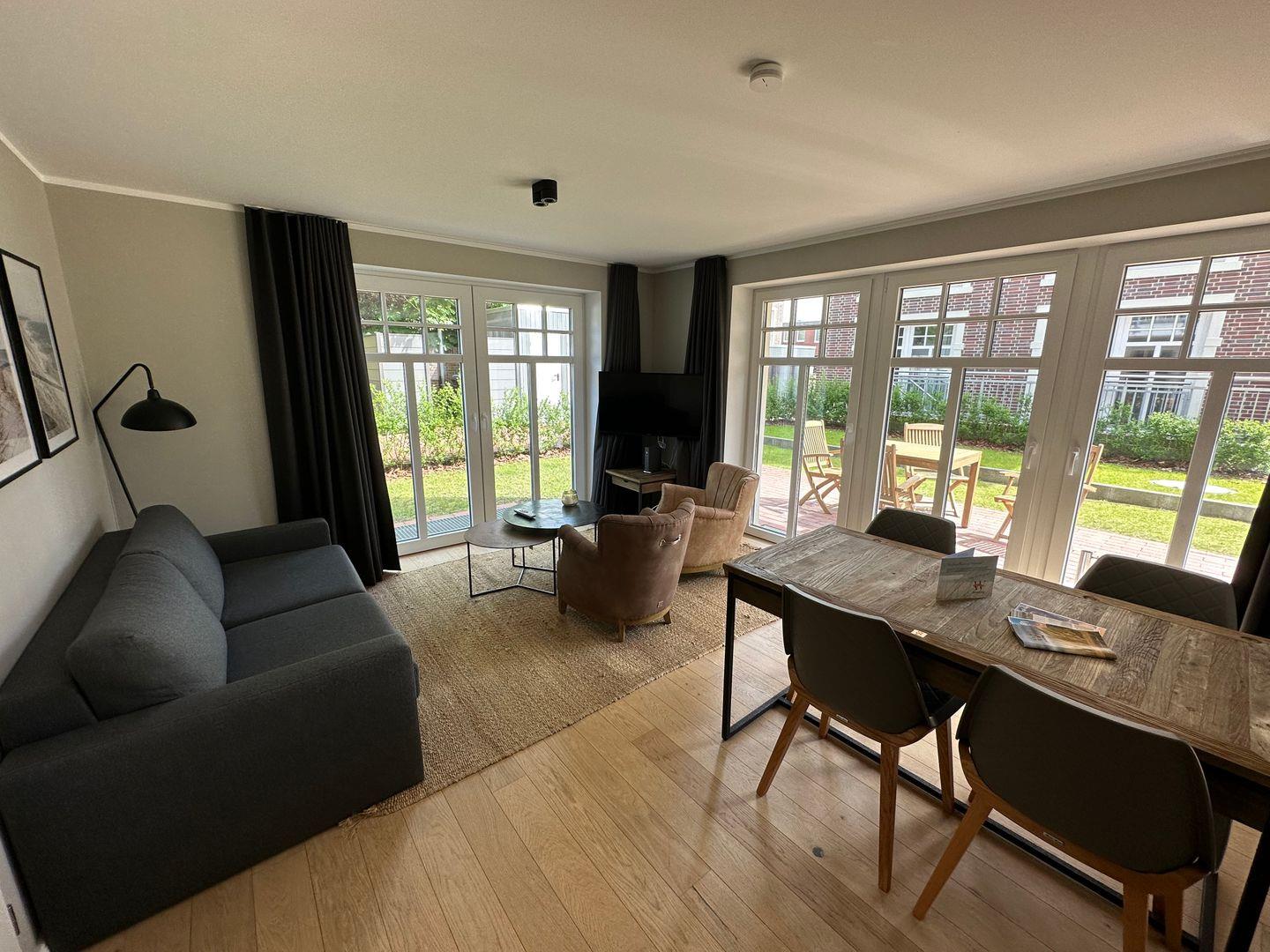 Der Wohnbereich mit bodentiefen Fenstern, Schlafcouch (für 2 Personen) und der gemütlichen Einrichtung sorgt für Wohlfühlatmosphäre.