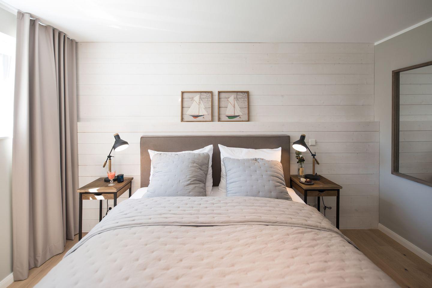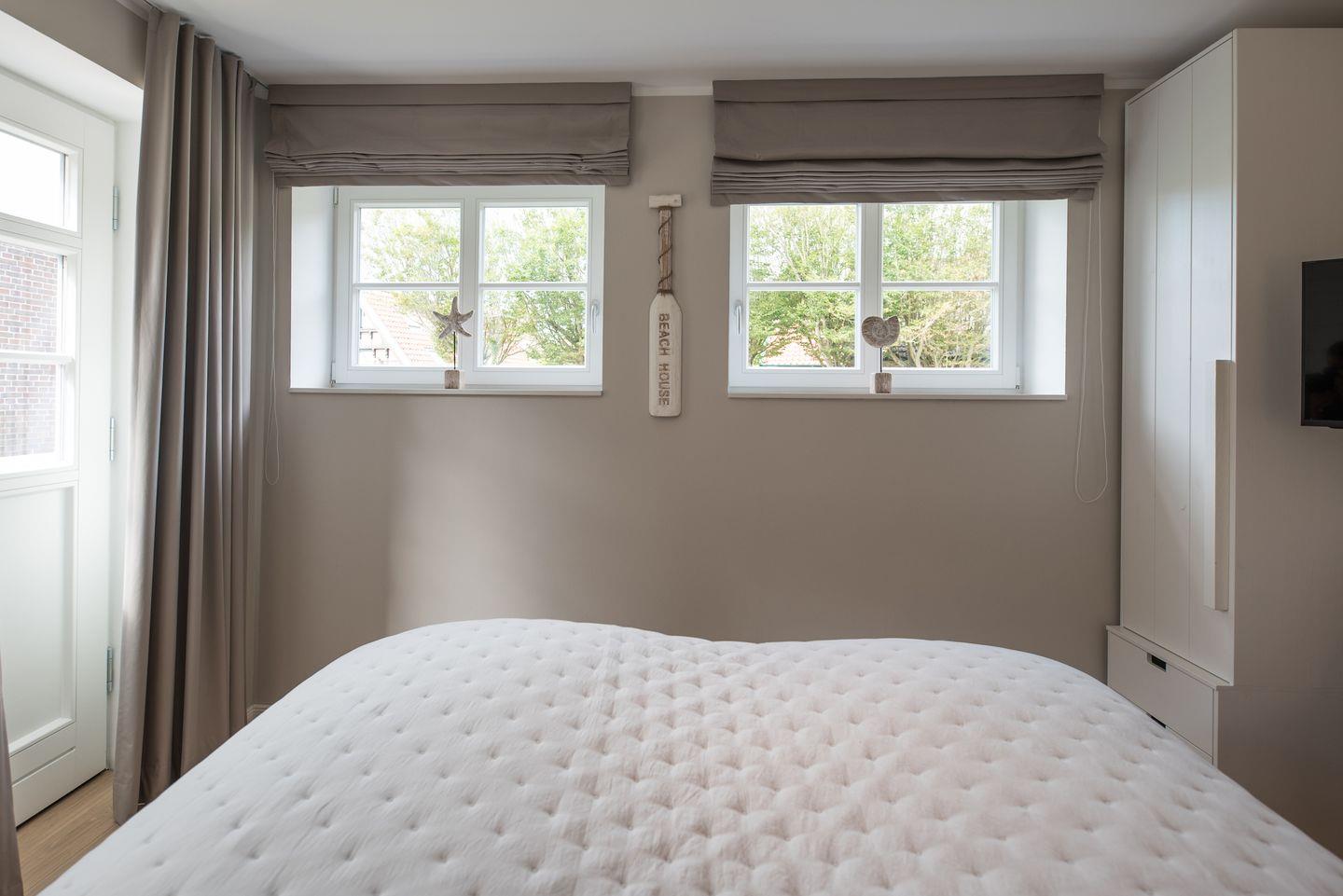 Vom Wohnraum aus erreichen Sie zwei Schlafzimmer mit komfortablen Boxspring-Doppelbetten und Flat-Screen Fernsehern. Zusätzlich enthält die Wohnung ein vollwertiges, modernes Badezimmer, sowie einen Abstellraum mit Waschmaschine und Trockner. In dieser Nichtraucher Ferienwohnung sind keine Haustiere gestattet.