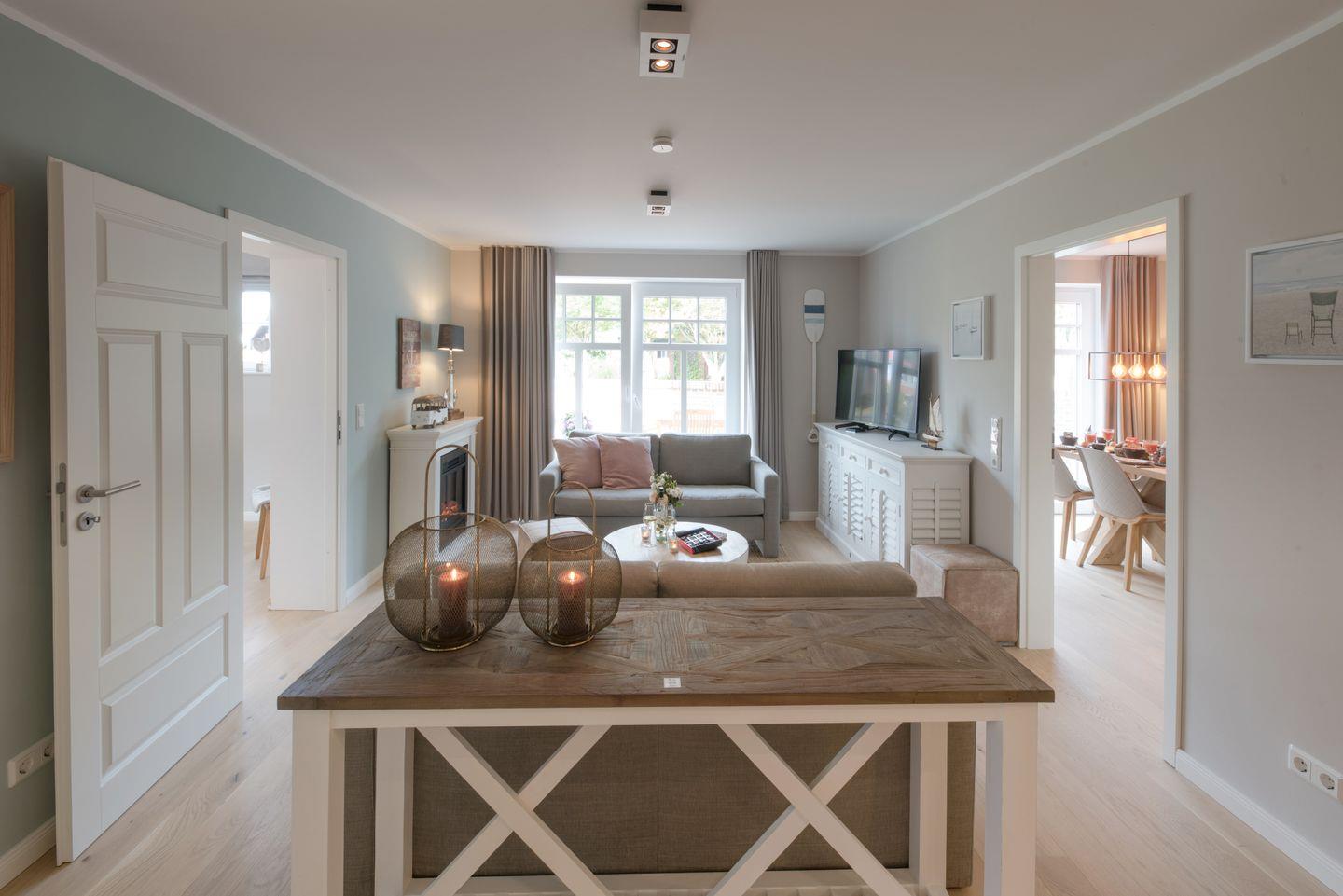 Die moderne und gemütliche Ferienwohnung im Erdgeschoß bietet Raum für bis zu 6 Personen. Der großzügige und sonnendurchflutete Wohnraum ist mit einer gemütlichen Sofaecke (Schlafsofa), Flat-Screen Fernseher und einem gemütlichen Kaminofen ausgestattet. Genießen Sie die Wangerooger Sonne im eigenen großen Garten mit zwei separaten Terrassen, der zum Verweilen und Spielen einlädt. Die separate und luxuriösen Küche ist voll ausgestattet und bietet am großen Esstisch Platz für 6 Personen.