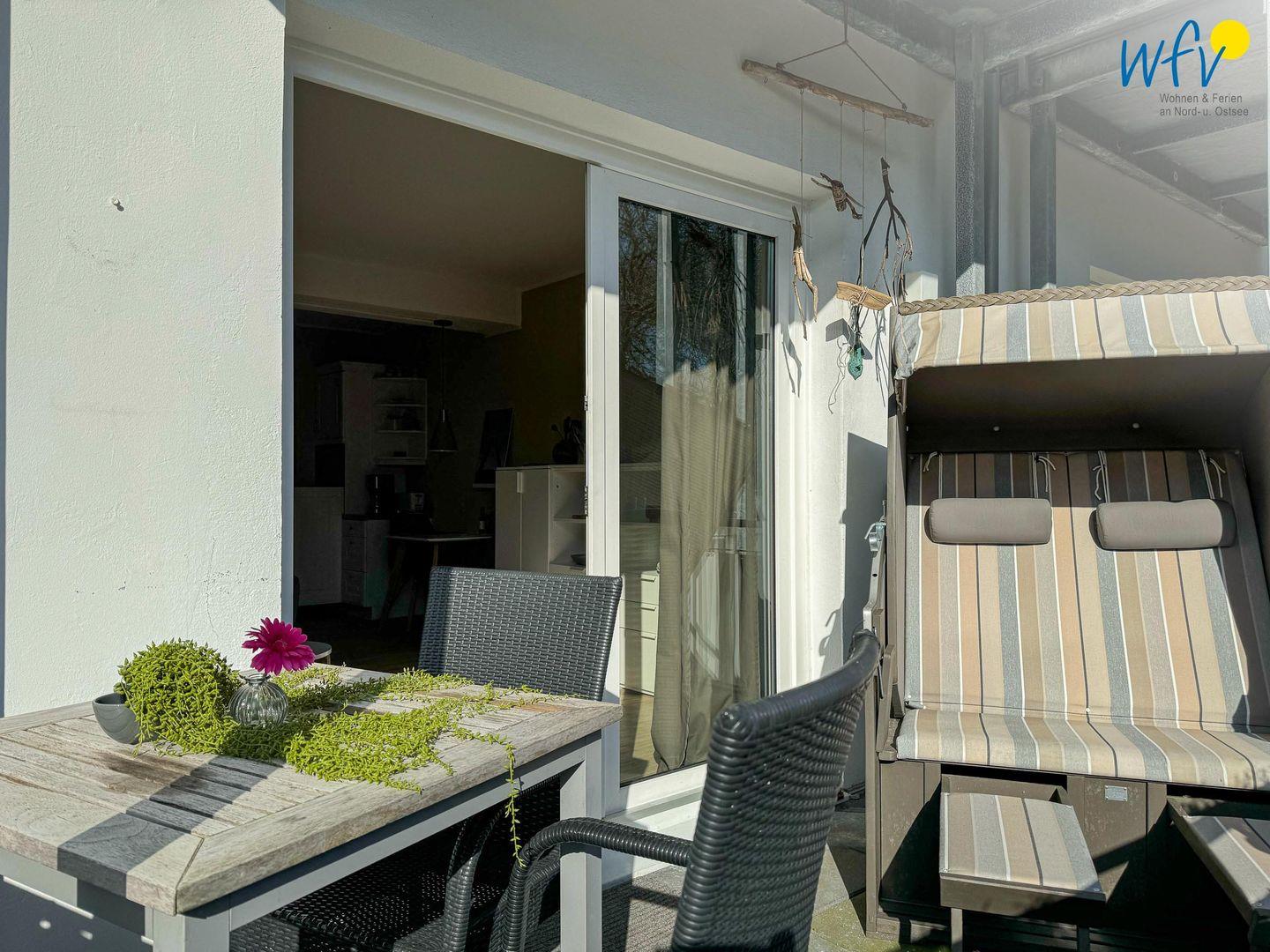 Sonne und frische Nordseeluft können Sie auf dem Balkon der Wangerooger Ferienwohnung genießen. Hier im Gartenstuhl ein gutes Buch zu lesen oder zu zweit beisammen zu sitzen und zu klönen, entfacht pures Urlaubsgefühl. Um das Haus herum ist zusätzlich ein kleiner Gemeinschaftsgarten angelegt.