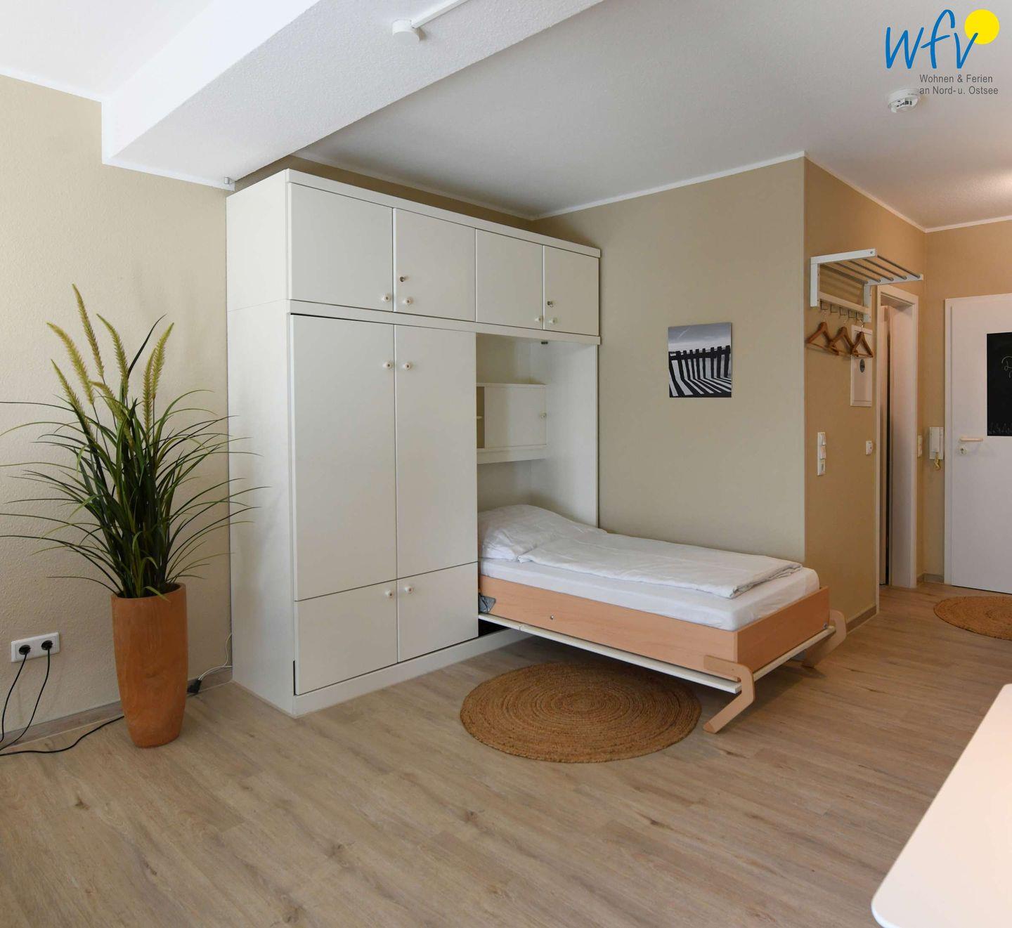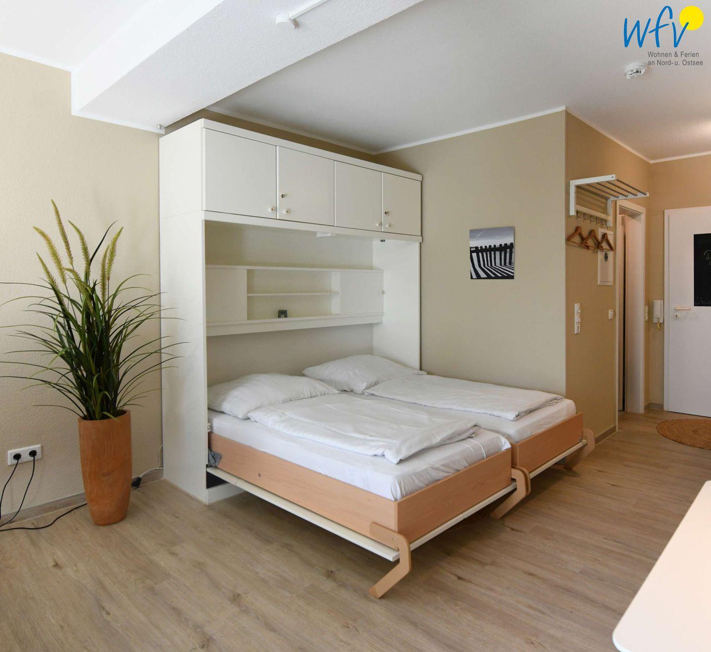 Zum ausgiebigen Ausschlafen in Ihrem Urlaub lässt sich das Schrankbett im Wohnraum zu einem bequemen Doppelbett umfunktionieren.