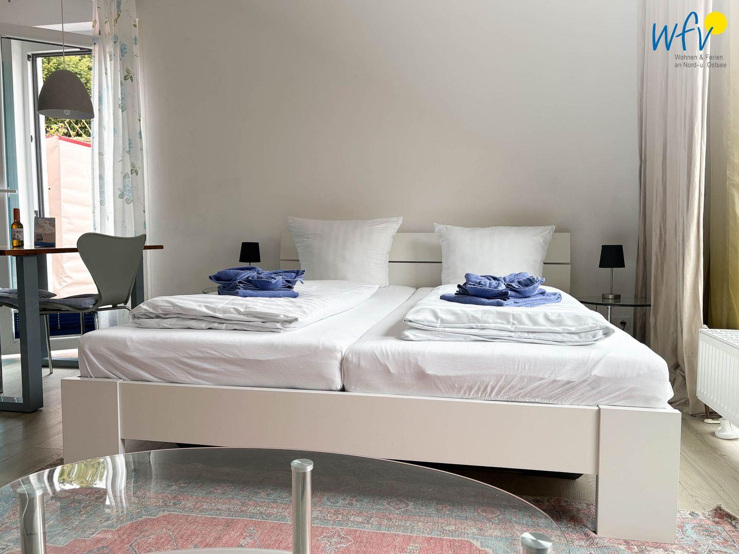 Herrlich ausschlafen können Sie in dem komfortablen Doppelbett (2 x 90 cm x 200 cm) der Ferienwohnung. Für Ihre Urlaubsgarderobe ist Platz im geräumigen Kleiderschrank.