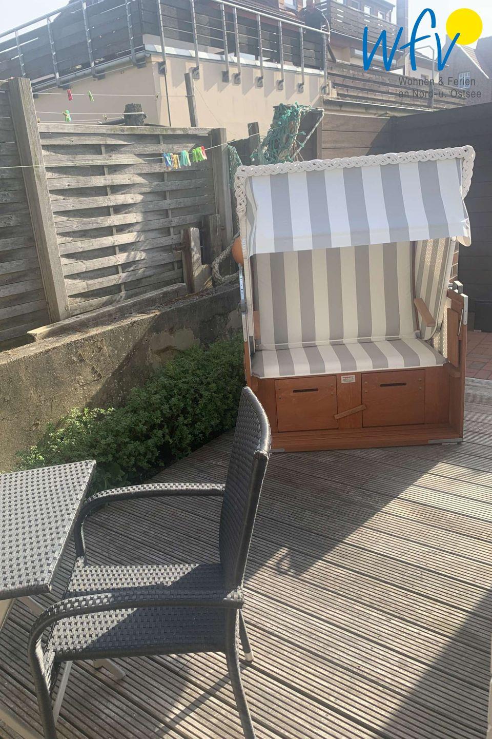 Auf 28 m² Wohnfläche ist das 1-Raum-Appartement optimal aufgeteilt und bietet Platz für zwei Personen. Bodentiefe Fenster mit zwei direkten Zugängen zur Süd-Ost-Terrasse und Nord-West-Terrasse durchfluten die Wohnung großzügig mit Sonne und Tageslicht. Auf den Terrassen wartet auf Sie ein bequemes Lounge Set sowie ein Esstisch mit Stühlen, eine Kippliege und ein Strandkorb.