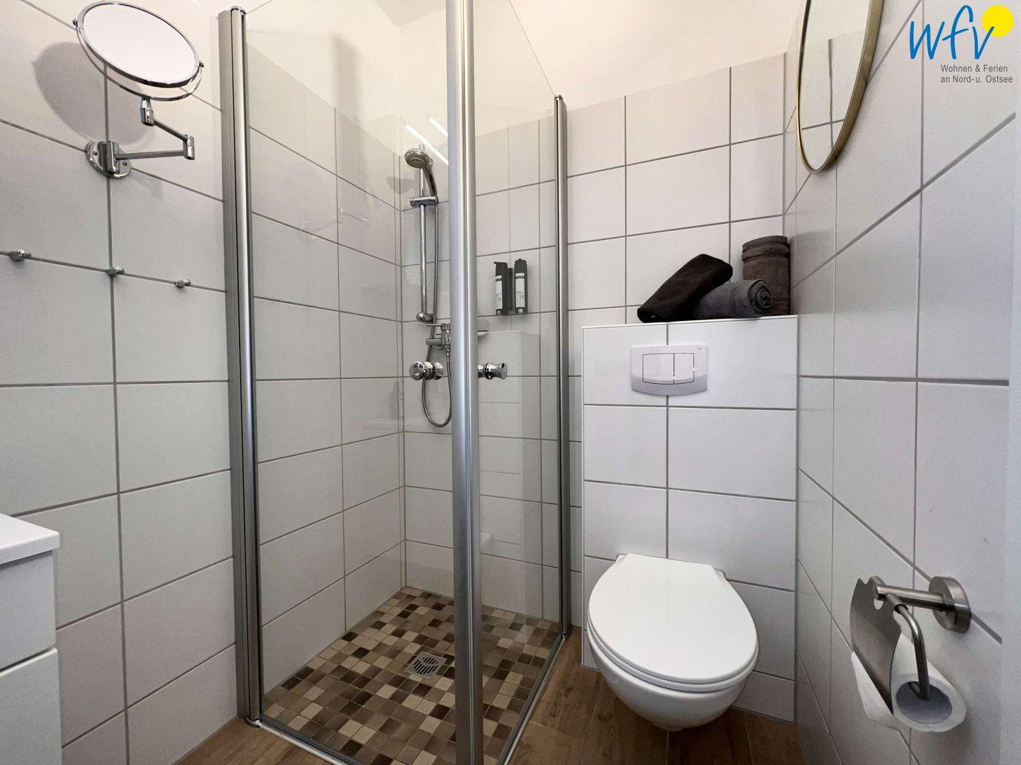 Das gepflegte Tageslichtbad verfügt über eine bodengleiche Dusche sowie über ein Waschbecken und ein WC.