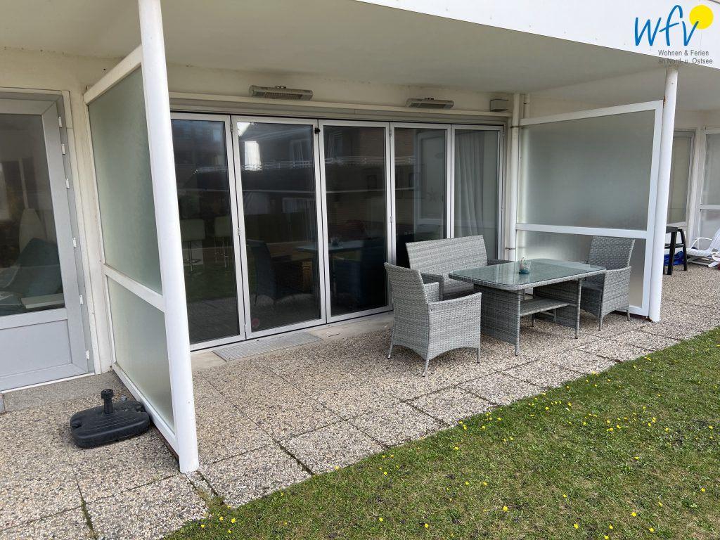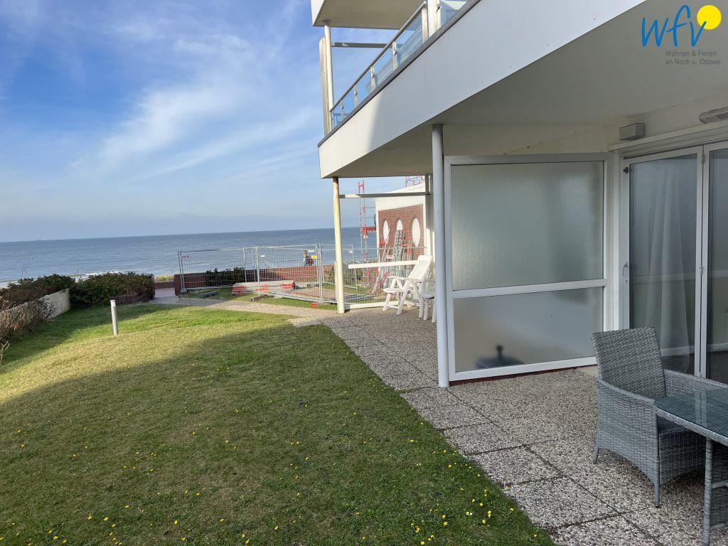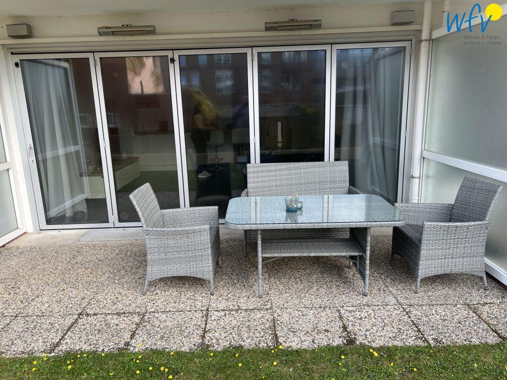 Wohltuende Nordseeluft können Sie in vollen Zügen auf der hübsch möblierten Terrasse der Ferienwohnung genießen! Vom angrenzenden Gartengrundstück haben Sie einen schönen Blick auf das Meer (seitlich).