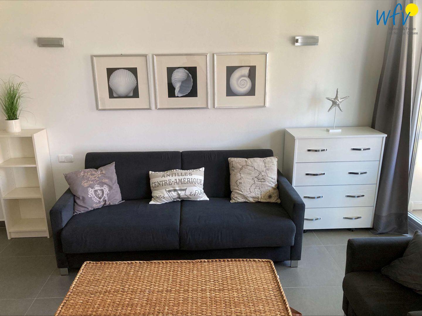 Schlafmöglichkeiten bestehen auf der komfortablen Schlafcouch (1,80 x 2,00). Eine dritte Person findet auf einem klappbaren Schrank-Zustellbett Platz (0,8 x 2,00).