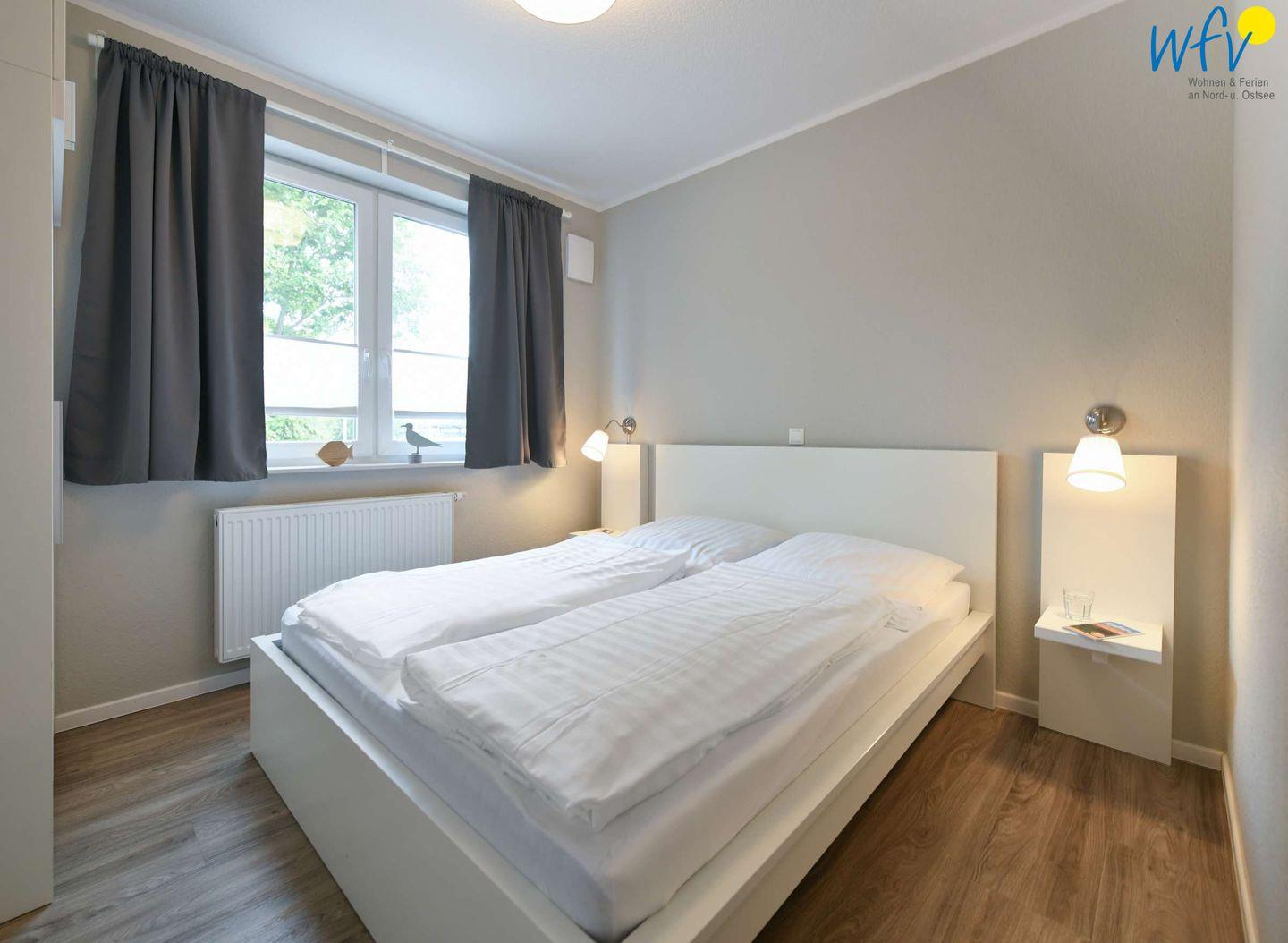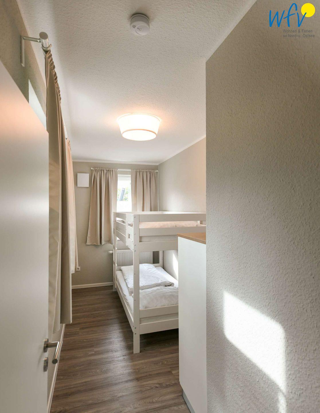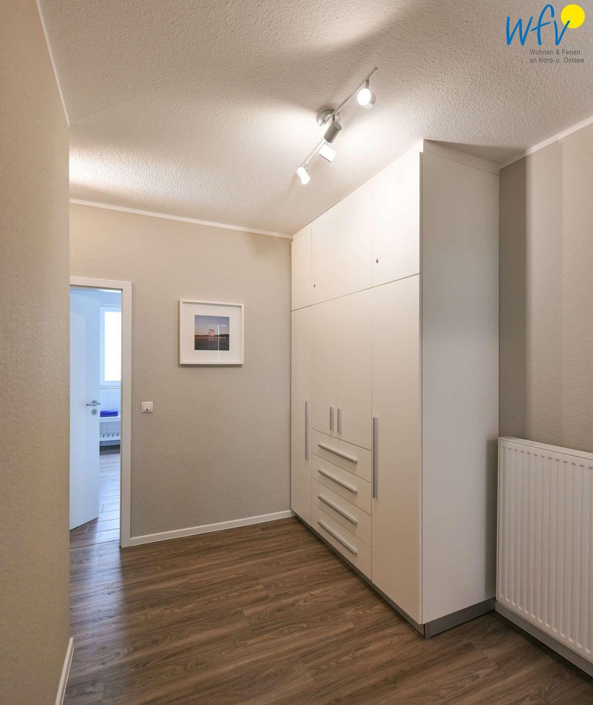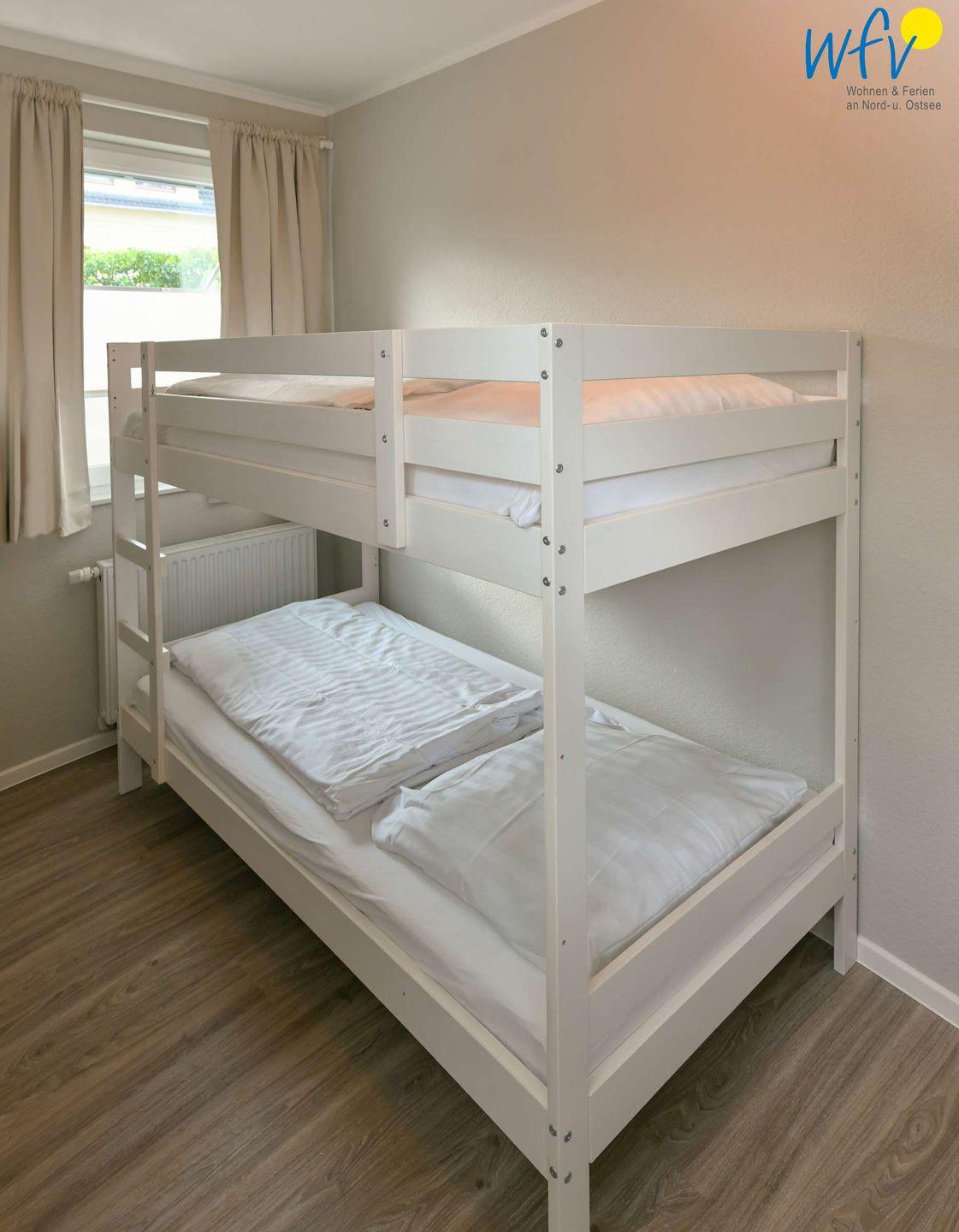 Die drei separaten Schlafzimmer der Ferienwohnung befinden sich sowohl im Erdgeschoss, als auch im Souterrain. Zwei der Zimmer sind jeweils mit einem Doppelbett eingerichtet (EG 1,60 m x 2 m; Sout 1,80 m x 2 m), für unsere kleinen Gäste befindet sich im dritten Schlafzimmer (Sout) ein Etagenbett. Die weitläufige Diele mit Einbauschrank bietet Platz für Ihre Urlaubsgarderobe.