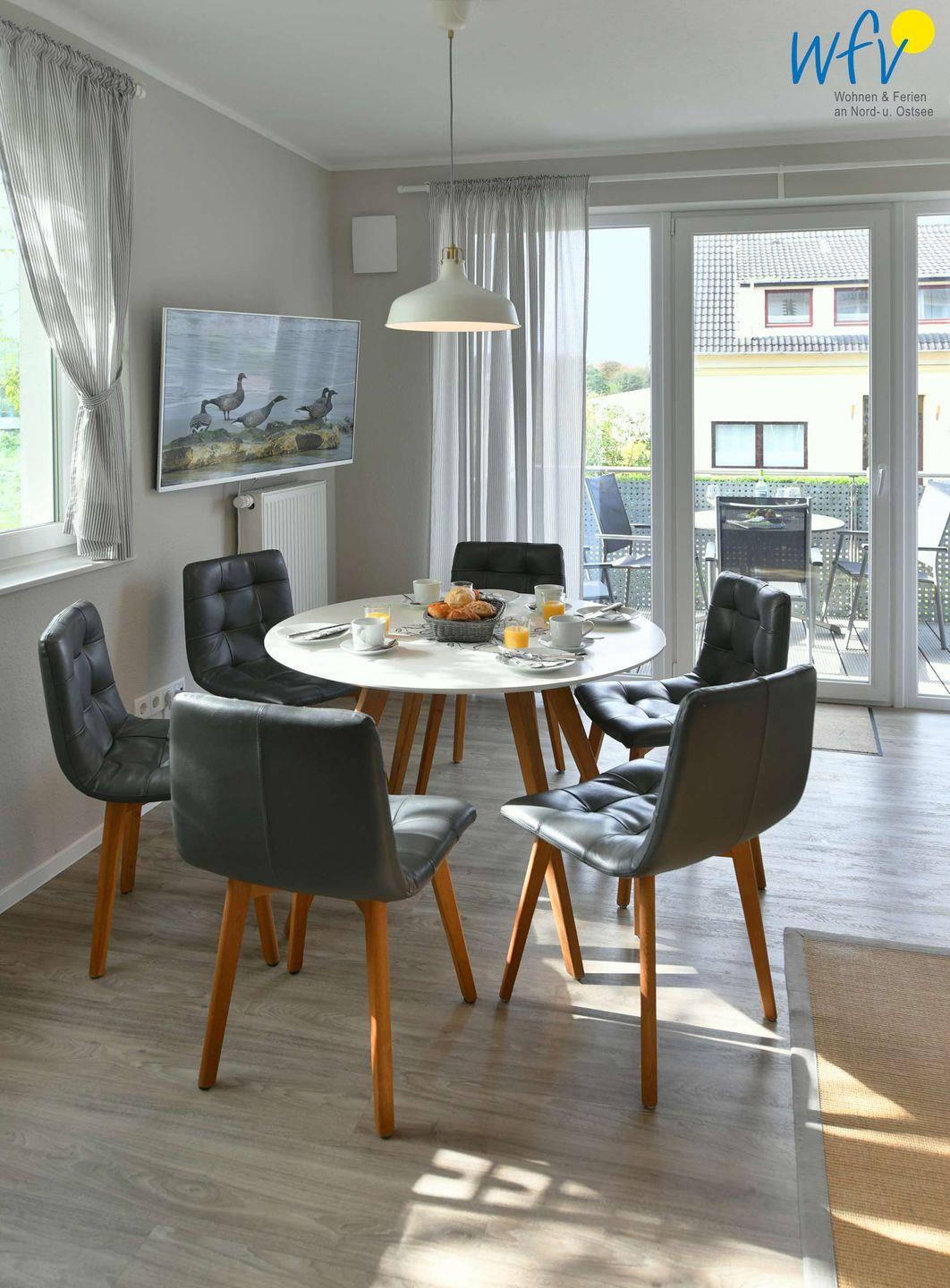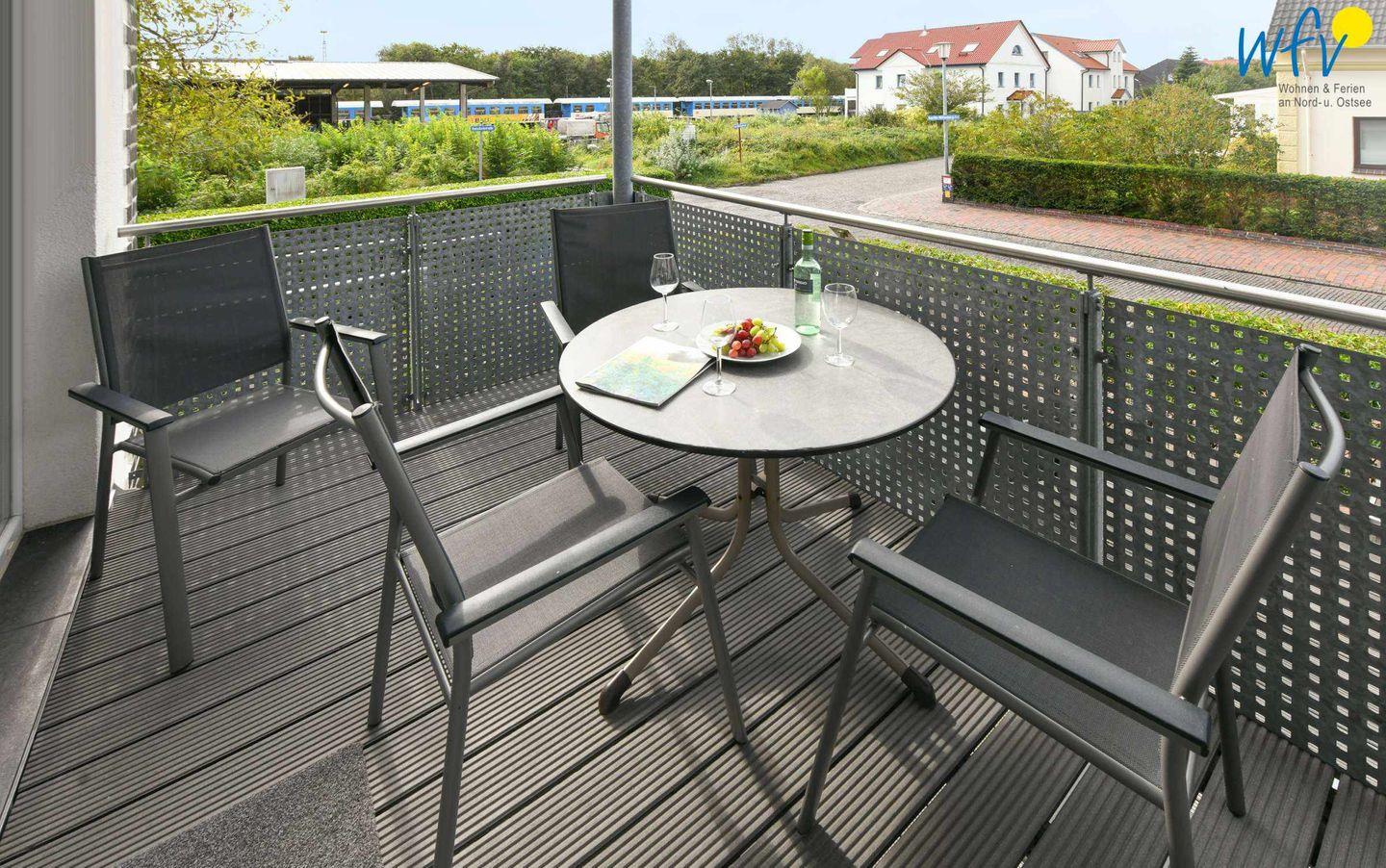 Herrlich erholen können Sie sich außerdem bei Sonne und wohltuender Nordseeluft: Über den möblierten Balkon gelangen Sie auf das große Sonnendeck mit grüner Umrahmung. Hier warten bereits die Gartenliegen auf Sie!