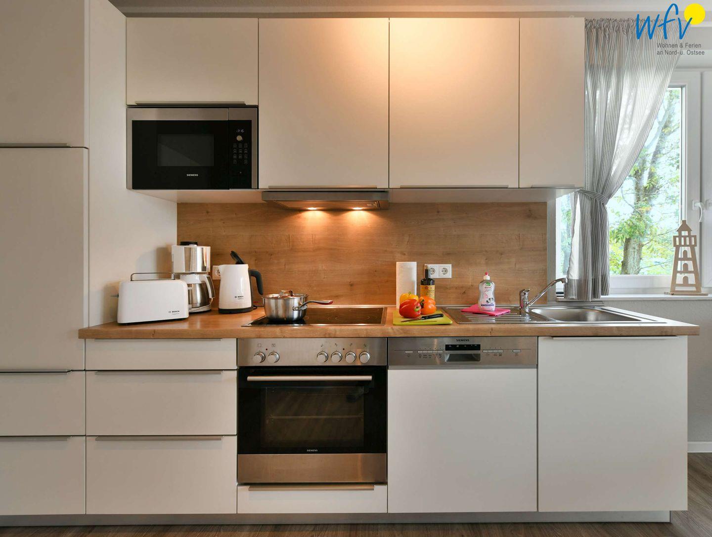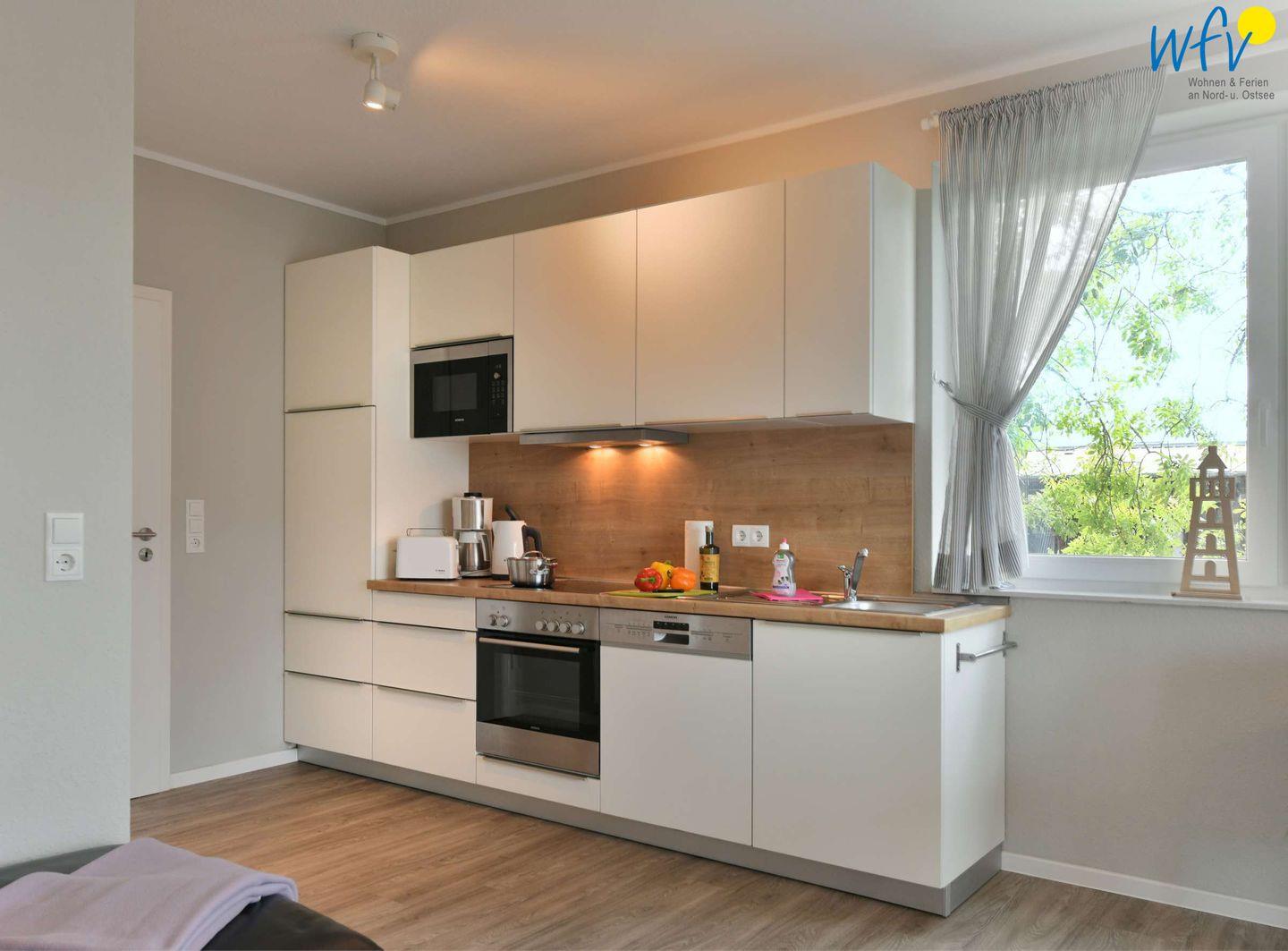Für die bequeme Selbstverpflegung ist die moderne Einbauküche bestens ausgestattet. Während auf dem Ceranherd der frische Fisch in der Pfanne brutzelt, bräunen im Backofen die Rosmarinkartoffeln. Den Abwasch erledigt anschließend die Spülmaschine.