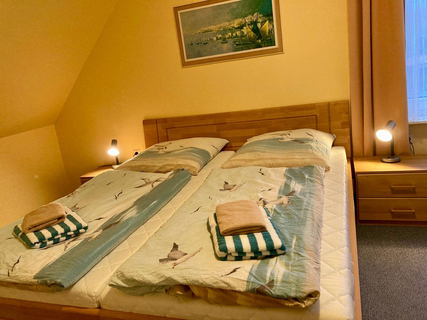 Der helle Wohn-Essbereich verfügt über ein großes Sofa, Tv und einer Sitzecke. Die angrenzende Küchenzeile beinhaltet alles, was man für eine bequeme Selbstverpflegung benötigt. Eines der Schlafzimmer verfügt über ein Doppelbett und das zweite Schlafzimmer über 2 Einzelbetten. Das großzügige Badezimmer mit Dusche hat sogar ein Fenster.