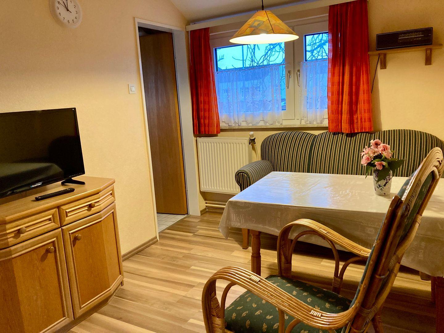 Sie besteht aus einem Schlafzimmer und 1 Wohnraum mit Küchenzeile, Sat-TV, Radio, sowie Bad mit Dusche und WC und einer kl Küchenzeile