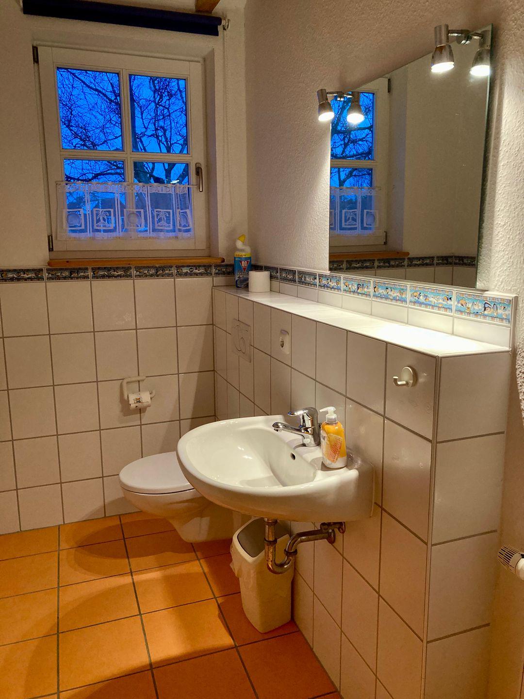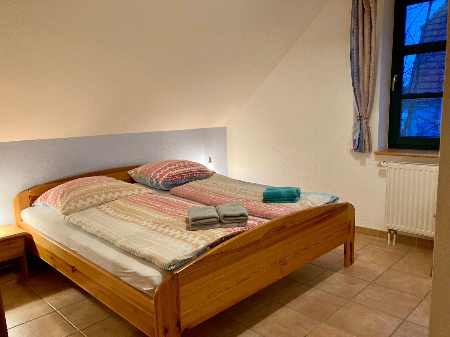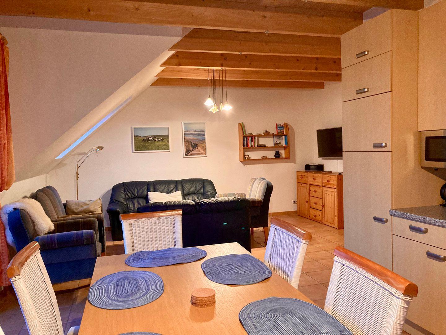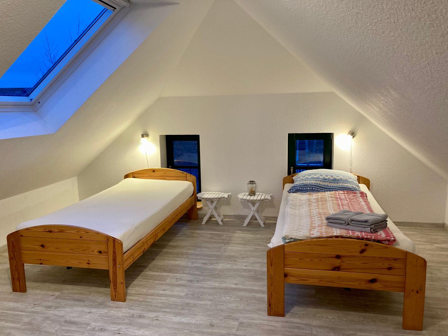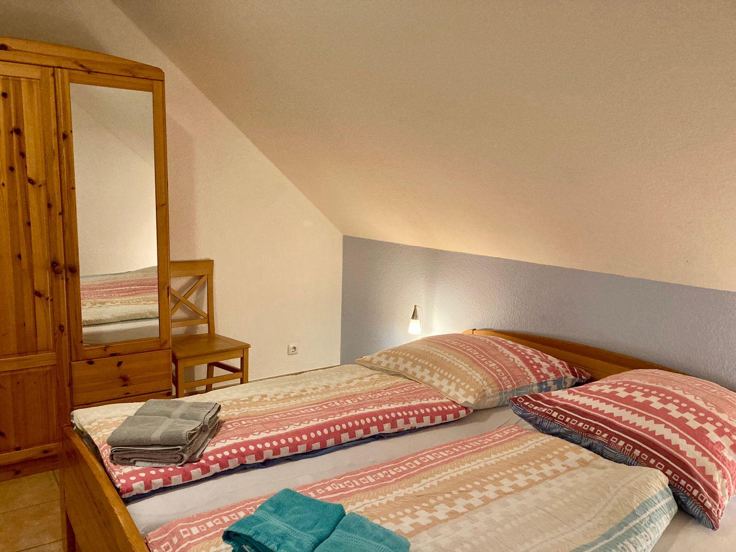 Im unteren Bereich der Wohnung (1. Etage) befindet sich der Wohn-Essbereich, das Gäste WC, das Badezimmer und 2 Schlafzimmer. Unter dem Dach ist dann noch das dritte große Schlafzimmer mit 2 Einzelbetten