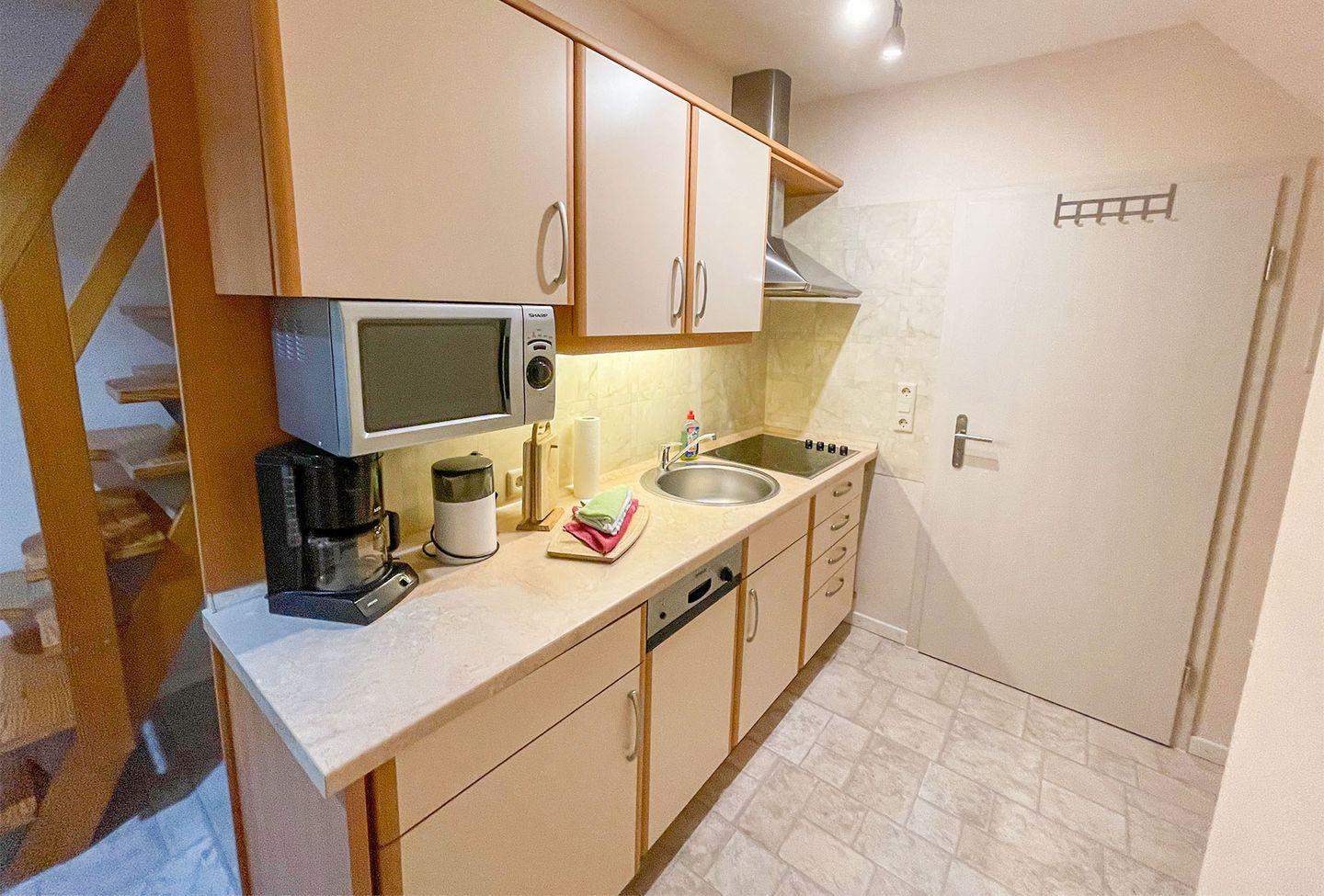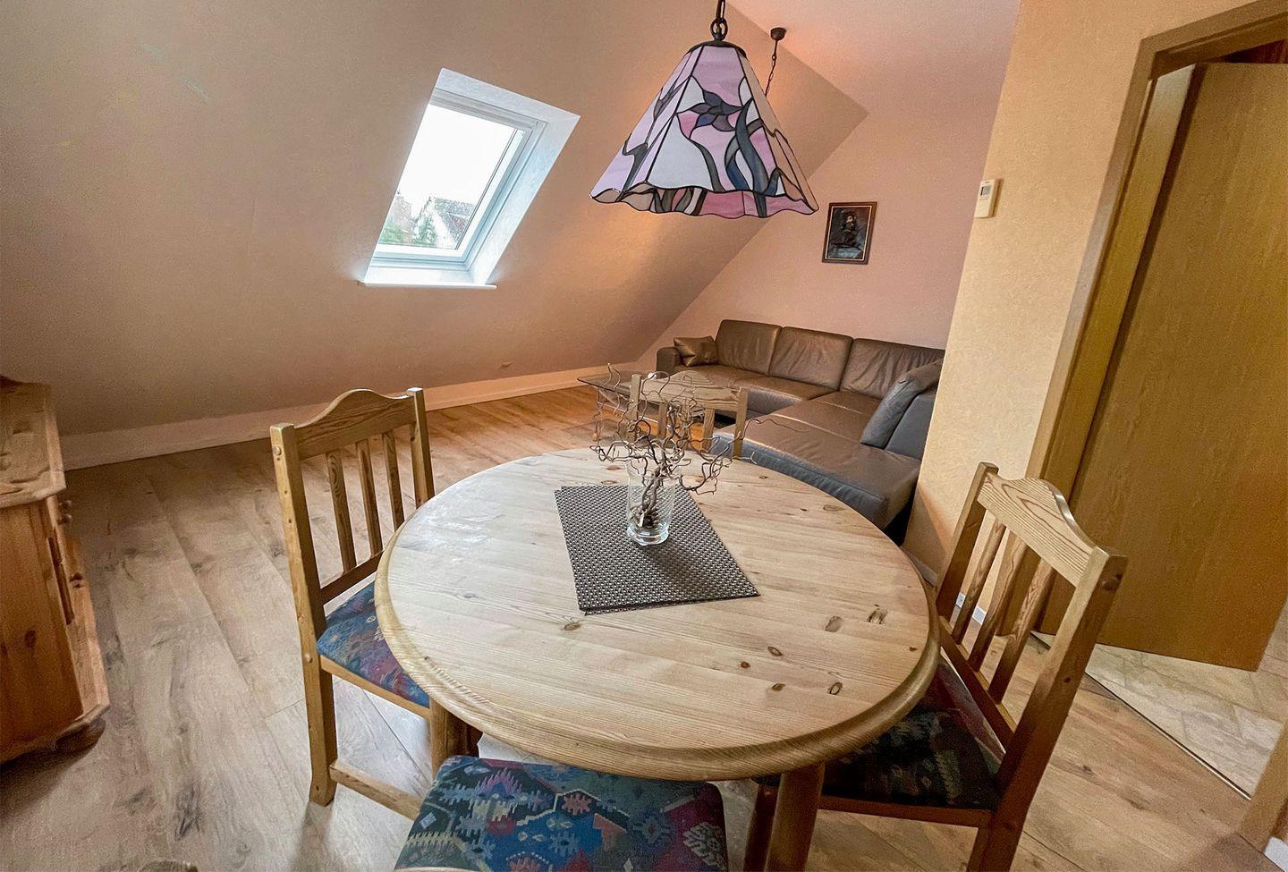 Ferienwohnung mit 2 Schlafräumen, Wohnraum mit Ess- und Sitzecke, Du/WC. Kochzeile, Geschirrspüler, Mikrowelle, TV, Radio. kostenloser WLANzugang. Gartennutzung