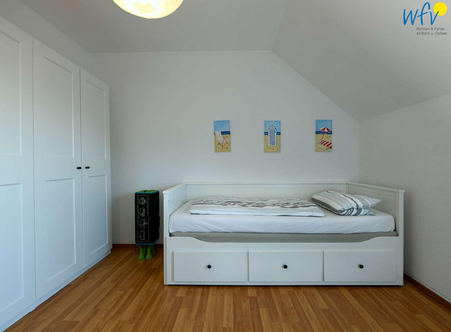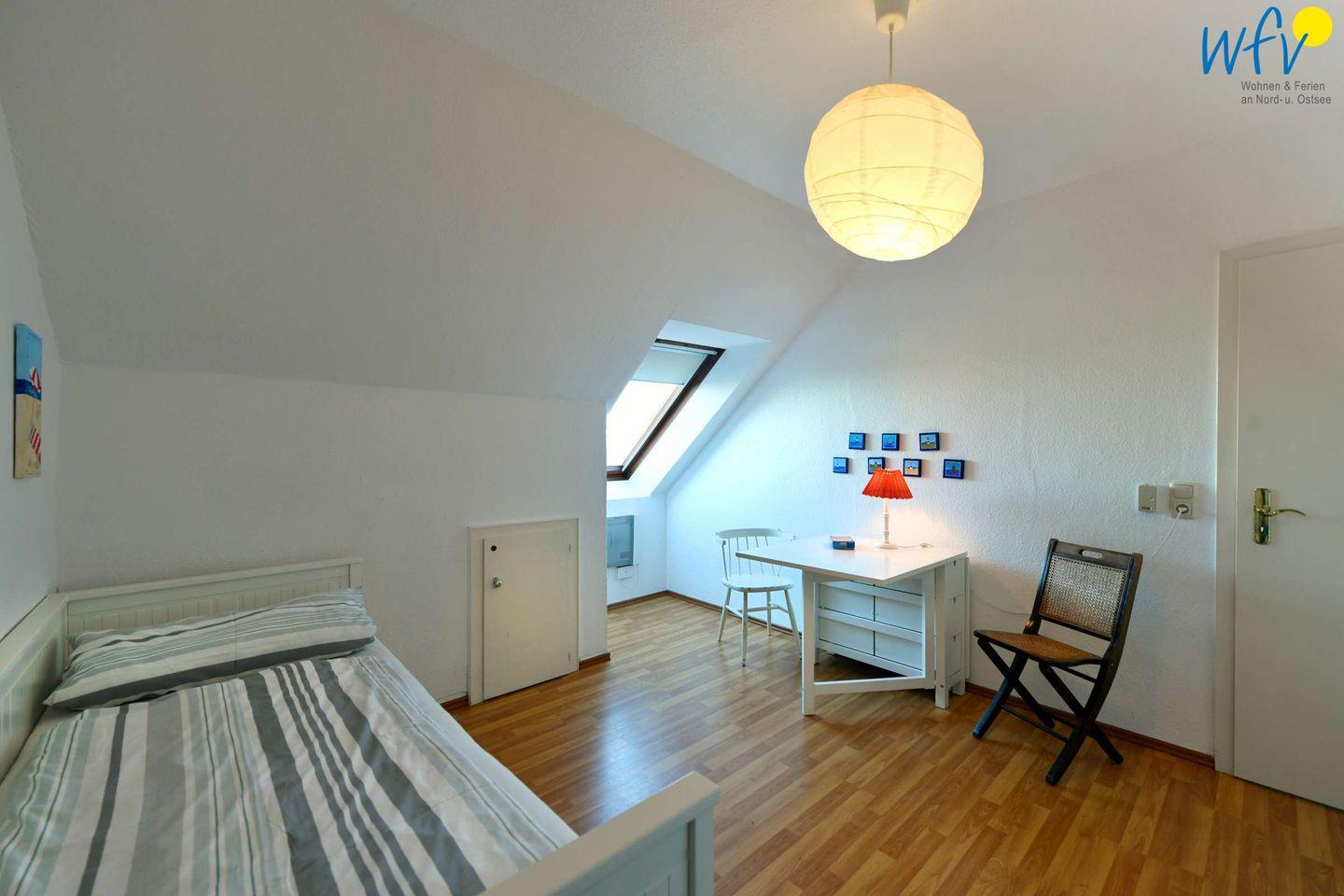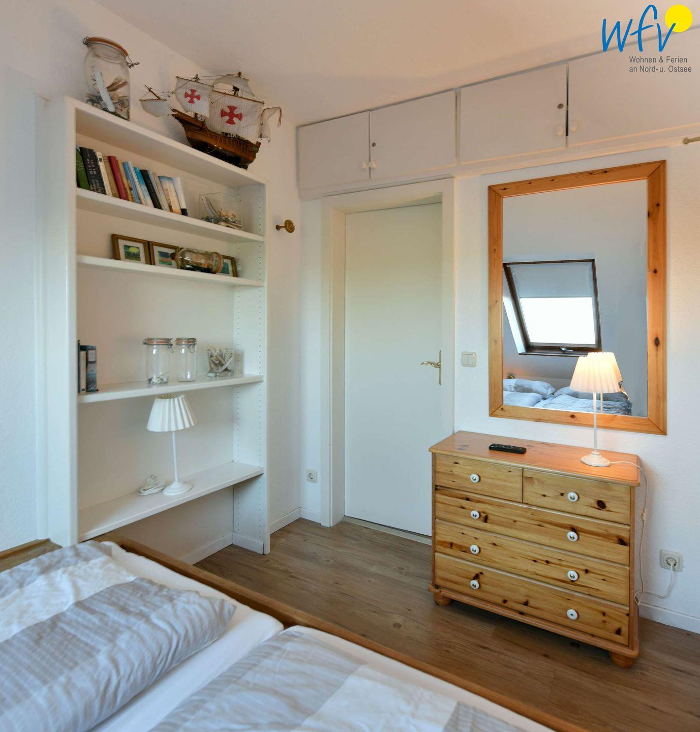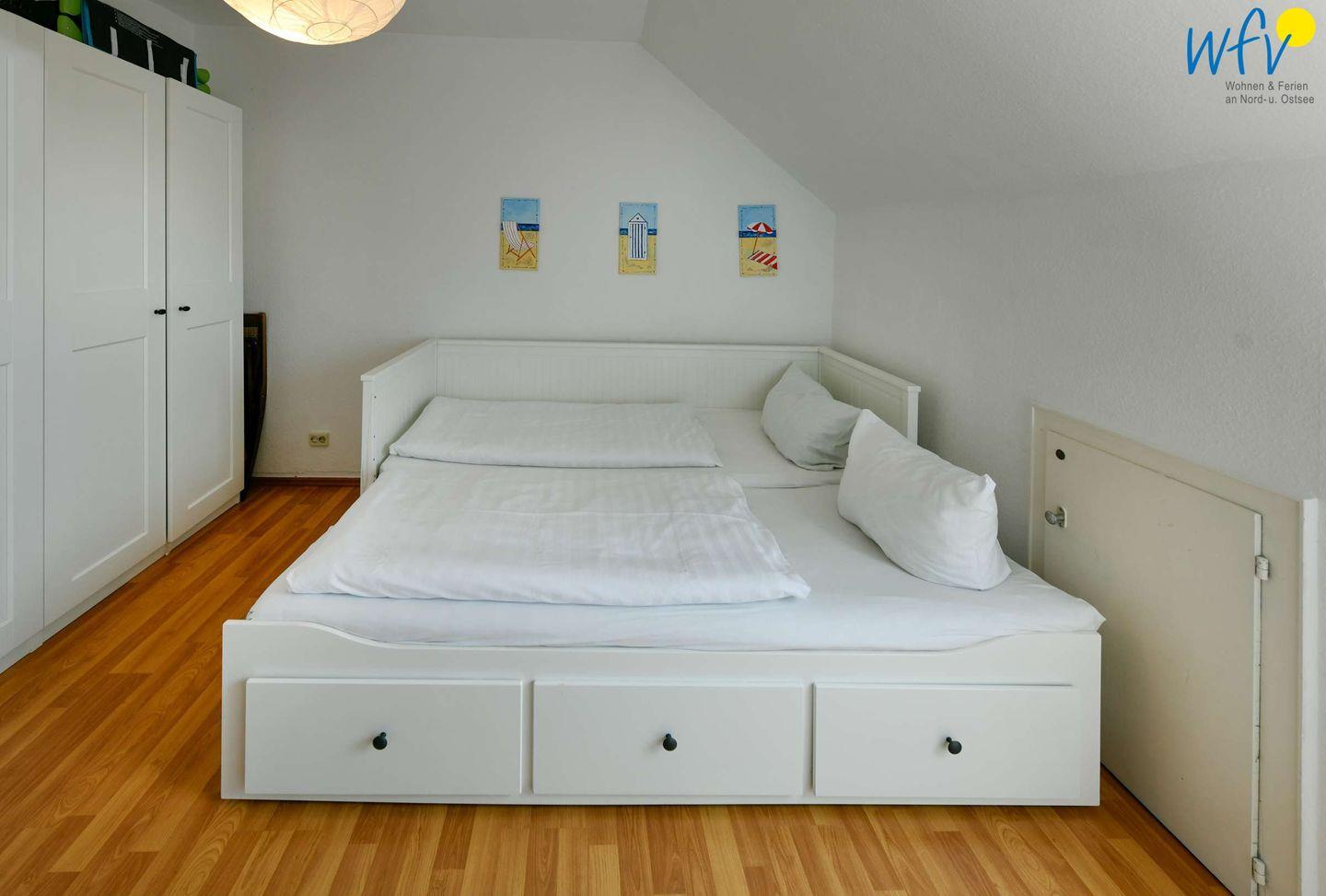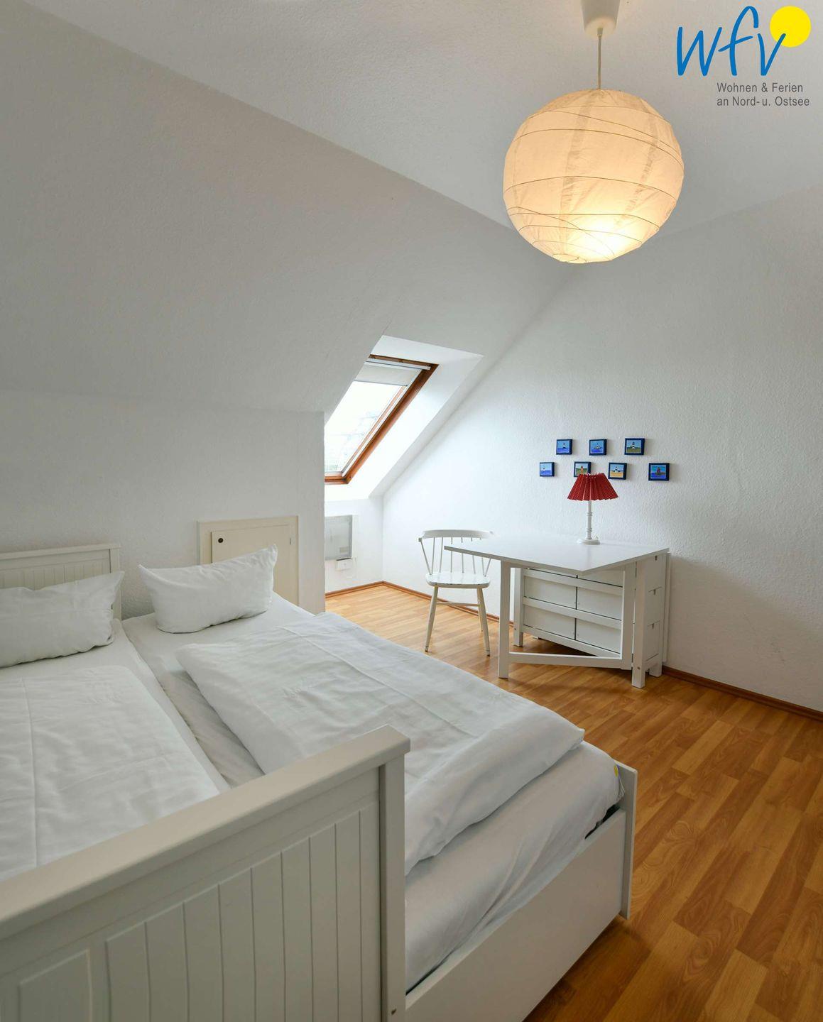 Durch zwei separate Schlafzimmer bestehen in der Ferienwohnung angenehme Rückzugsmöglichkeiten. Eines der Zimmer ist mit einem großen Doppelbett (190 x 180 cm) ausgestattet, das andere mit einem kleinen Doppelbett (200 x 160 cm) und einem Schreibtisch. Ein Babybett gehört zum festen Inventar der Wohnung. Beide Räume verwöhnen Sie beim Aufwachen mit Meerblick - ein herrlich entspannter Start in den Urlaubstag!