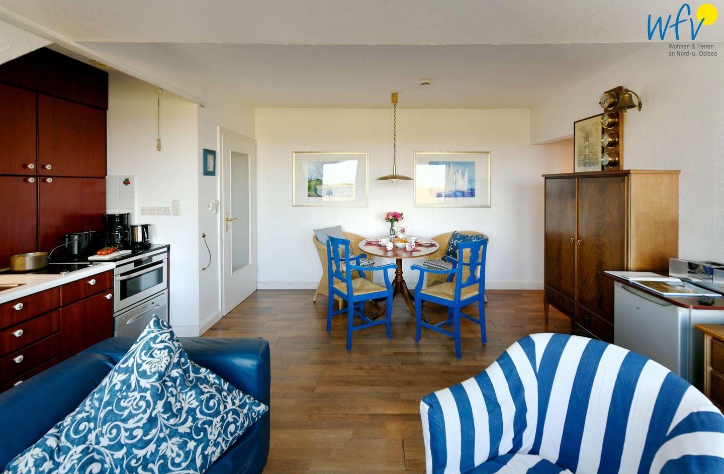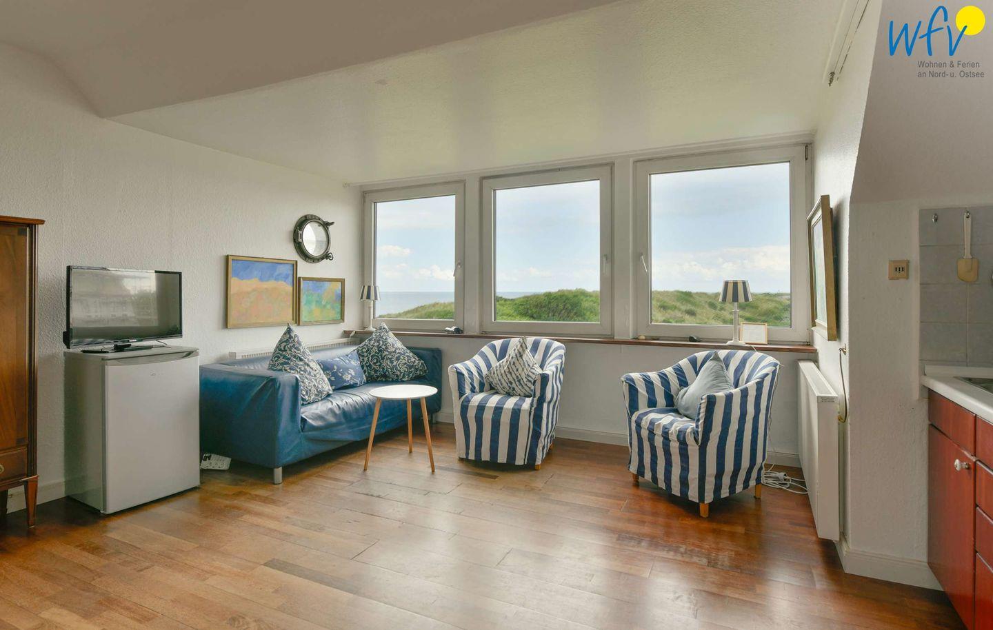 Die Nordsee sehen Sie bei uns von allen Zimmern aus! Selbst unter der Dusche können Sie auf das Meer schauen (ab Körpergröße 170 cm). Besonders der großzügige Wohnraum mit breiter Fensterfront und direktem Meerblick ist ein herrlicher Platz zum Träumen! In der gemütlichen Sitzecke mit schönem Lichteinfall werden Sie sich rundum entspannen können. Zum Filme schauen und Musik hören ist ein modernes TV und ein CD-Player vorhanden.