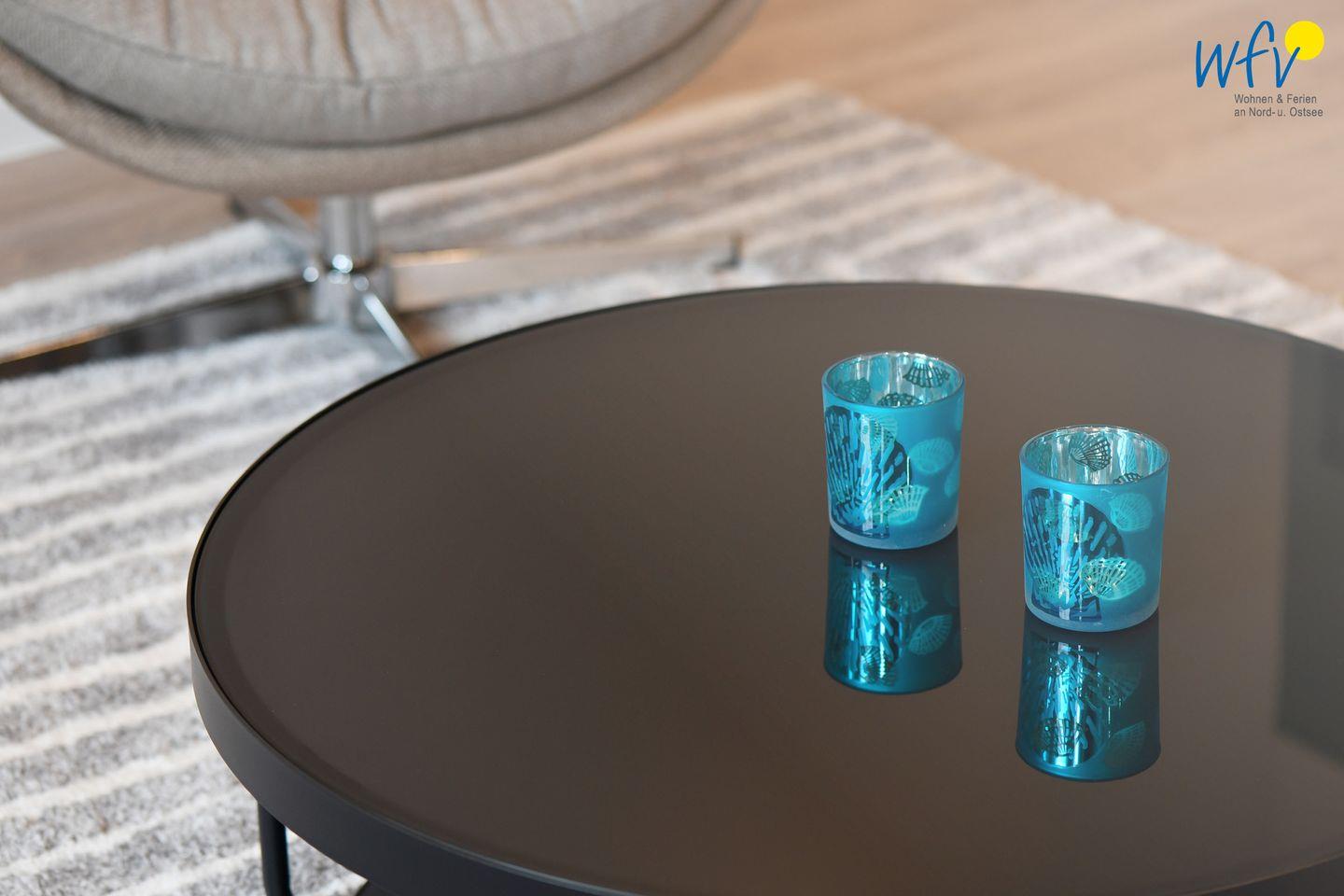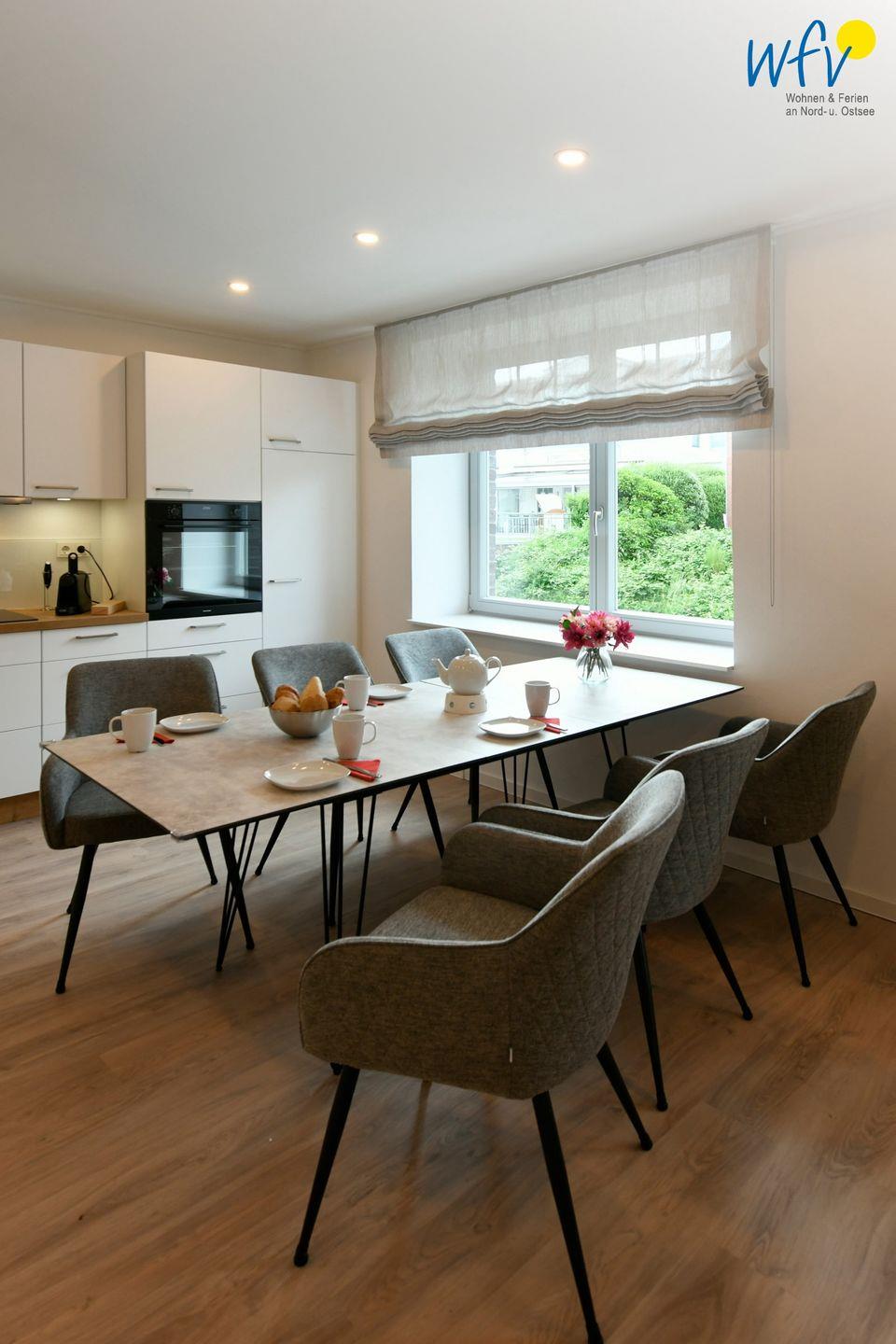 Nach dem Strandtag oder der Fahrradtour lädt der Wohnraum mit Couch, Relaxsesseln und modernem TV zu entspannten Stunden ein. An dem großen Esstisch haben Sie viel Platz für gemeinsame Mahlzeiten oder lustige Spieleabende.