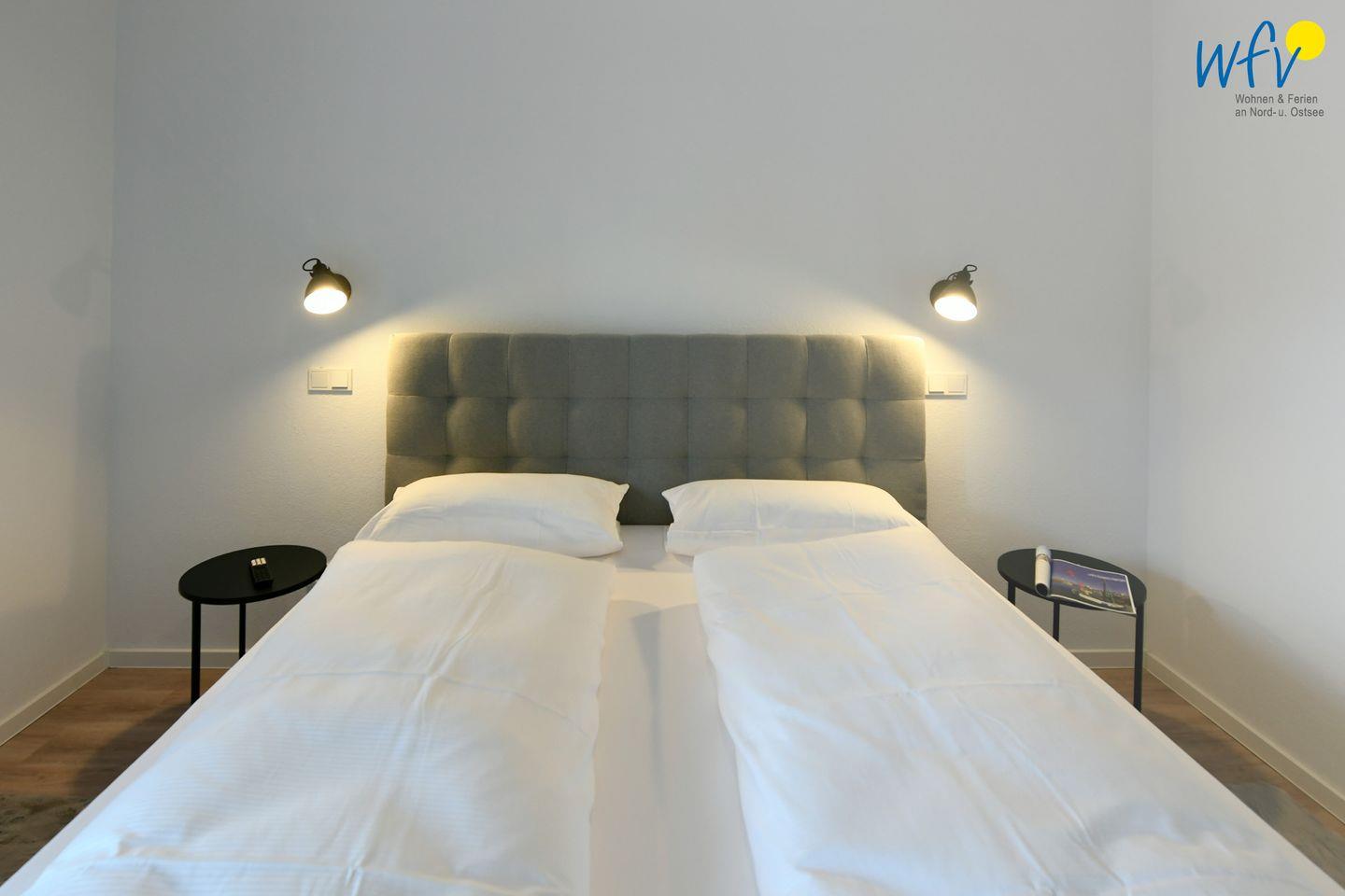 Zwei separate Schlafzimmer bieten Ihnen angenehme Rückzugsmöglichkeiten. Sie sind mit einem komfortablen Doppelbett (180 x 200 cm) bzw. drei Einzelbetten (einem Einzelbett (90 x 200 cm) und einem Einzelbett mit Auszug (80 x 190 cm)) ausgestattet.