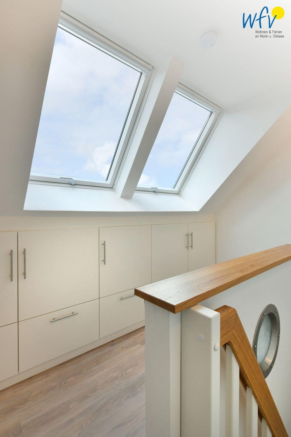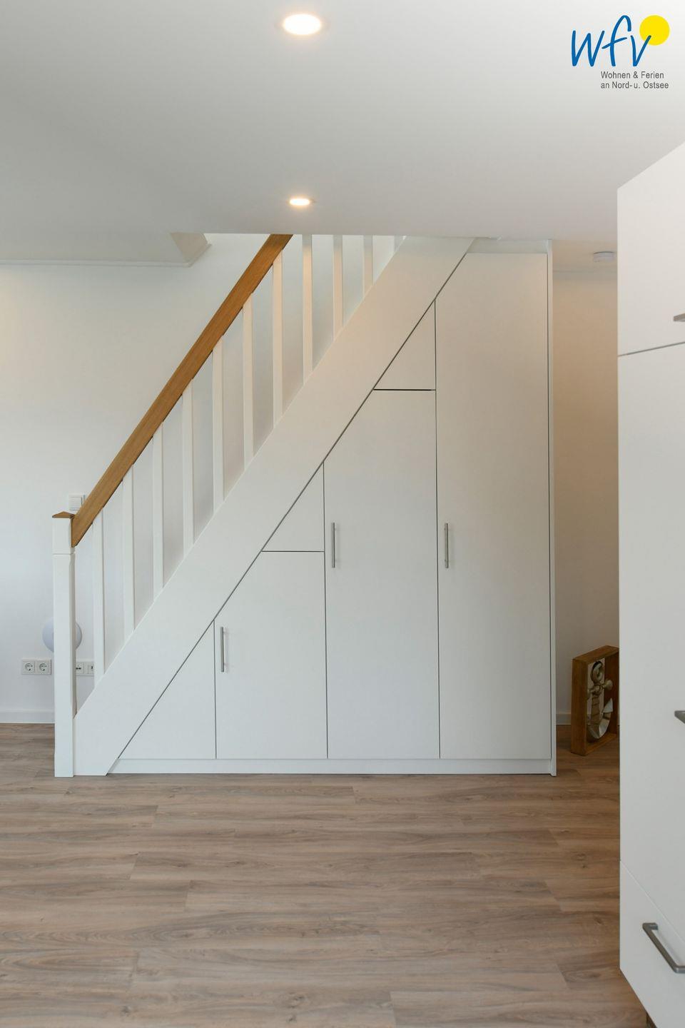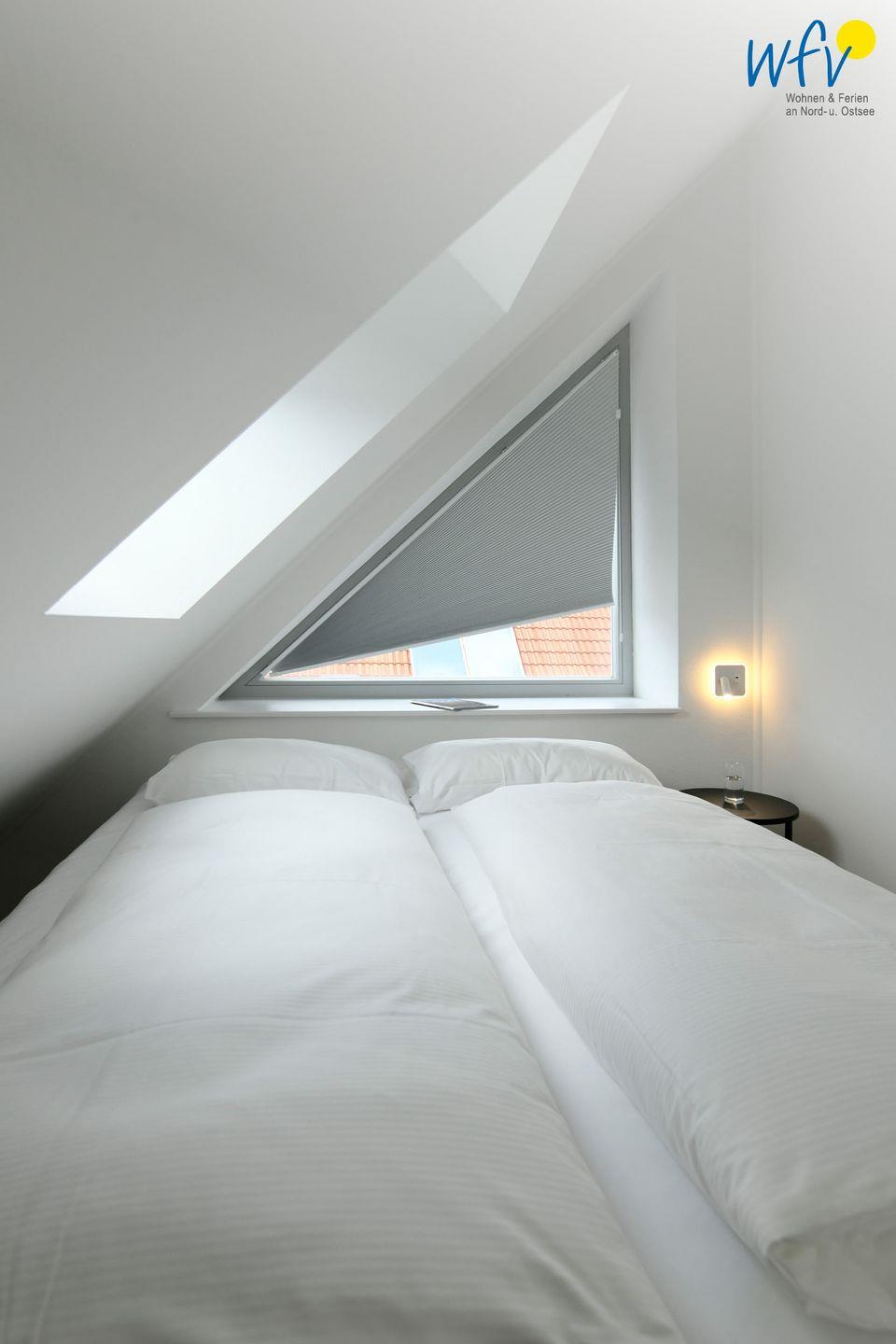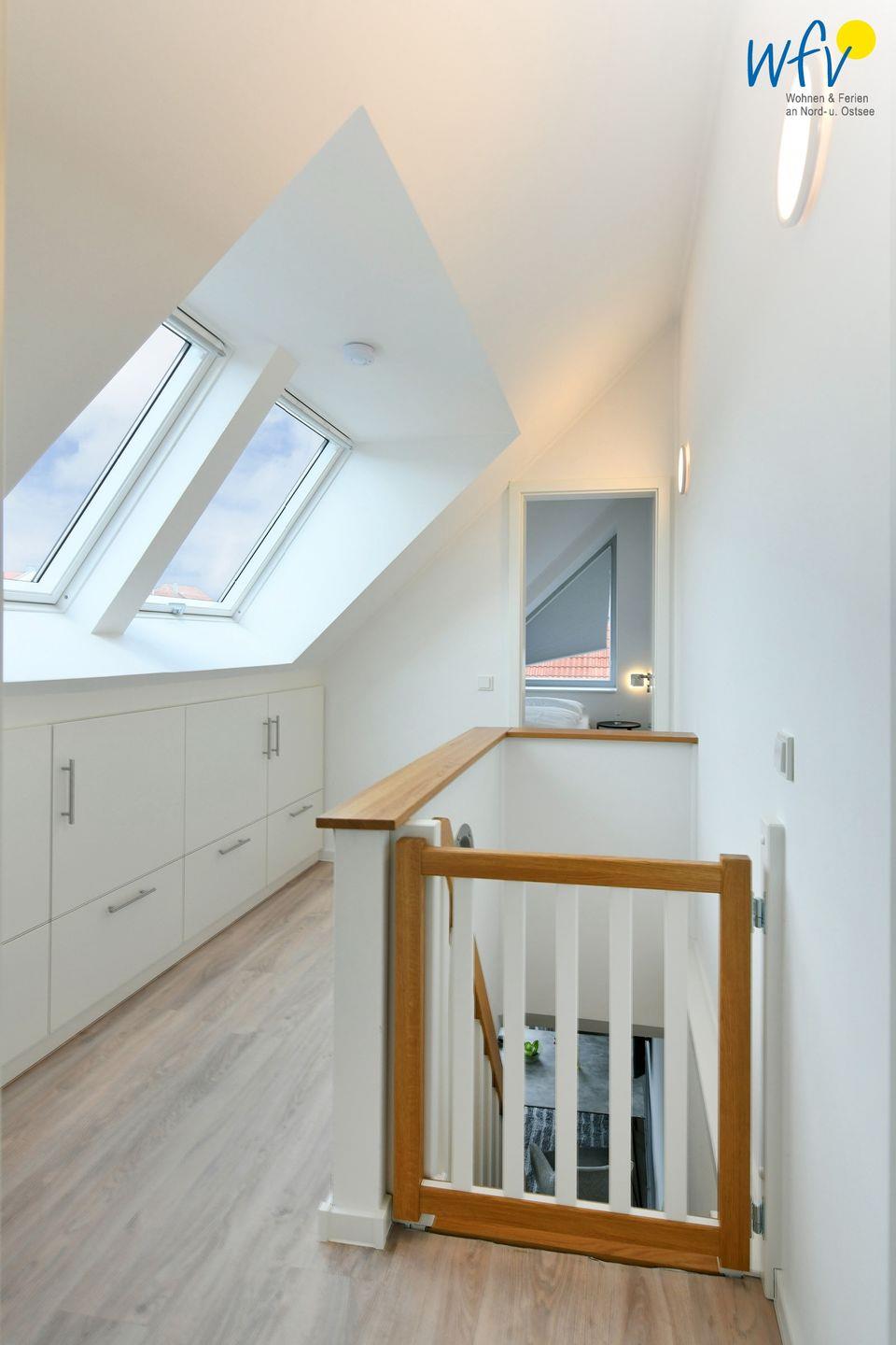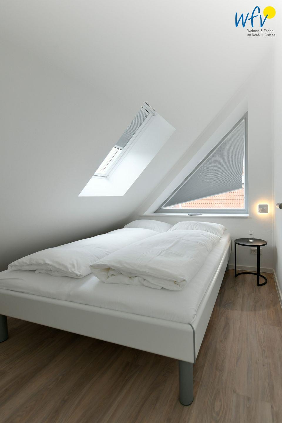 Angenehme Rückzugsmöglichkeiten bieten Ihnen zwei separate Schlafzimmer im Spitzboden. Sie sind jeweils mit einem komfortablen Doppelbett ausgestattet. Für Ihre Urlaubsgarderobe befindet sich im Flur zwischen den Schlafzimmern ein geräumiger Kleiderschrank. Aufhängevorrichtungen mit Bügeln gibt es in den Einbauschränken unter der Treppe. Auf der bequemen Schlafcouch im Wohnzimmer können zwei weitere Personen schlafen.