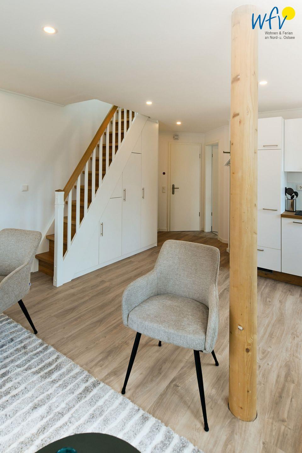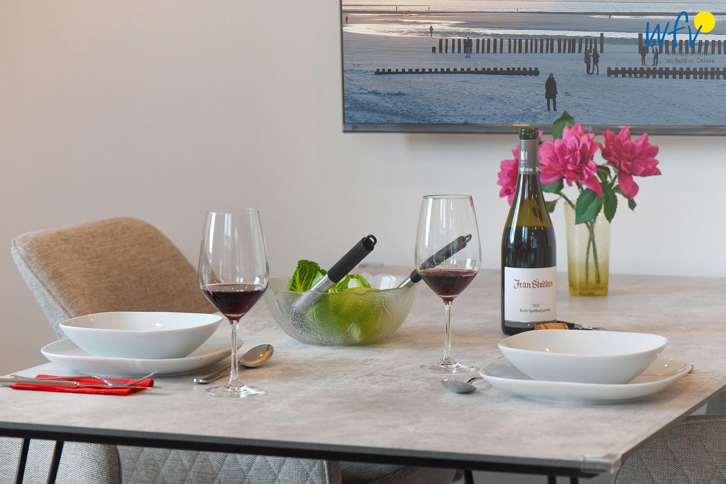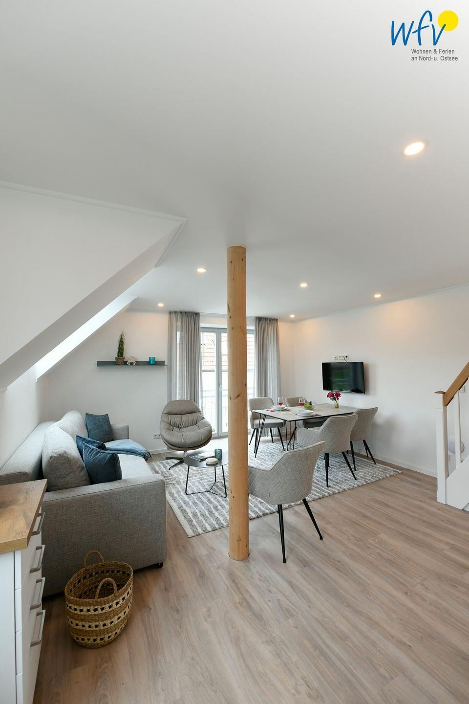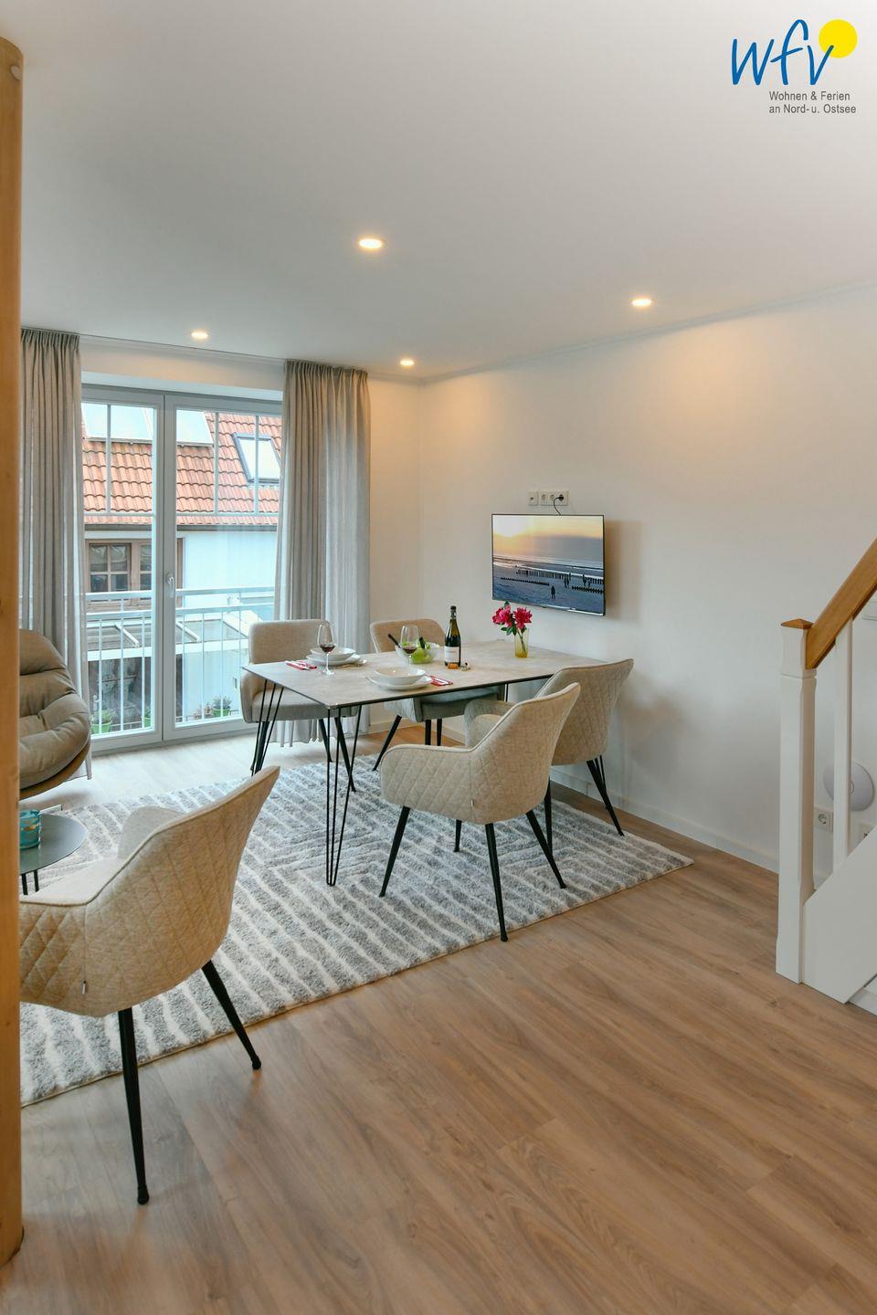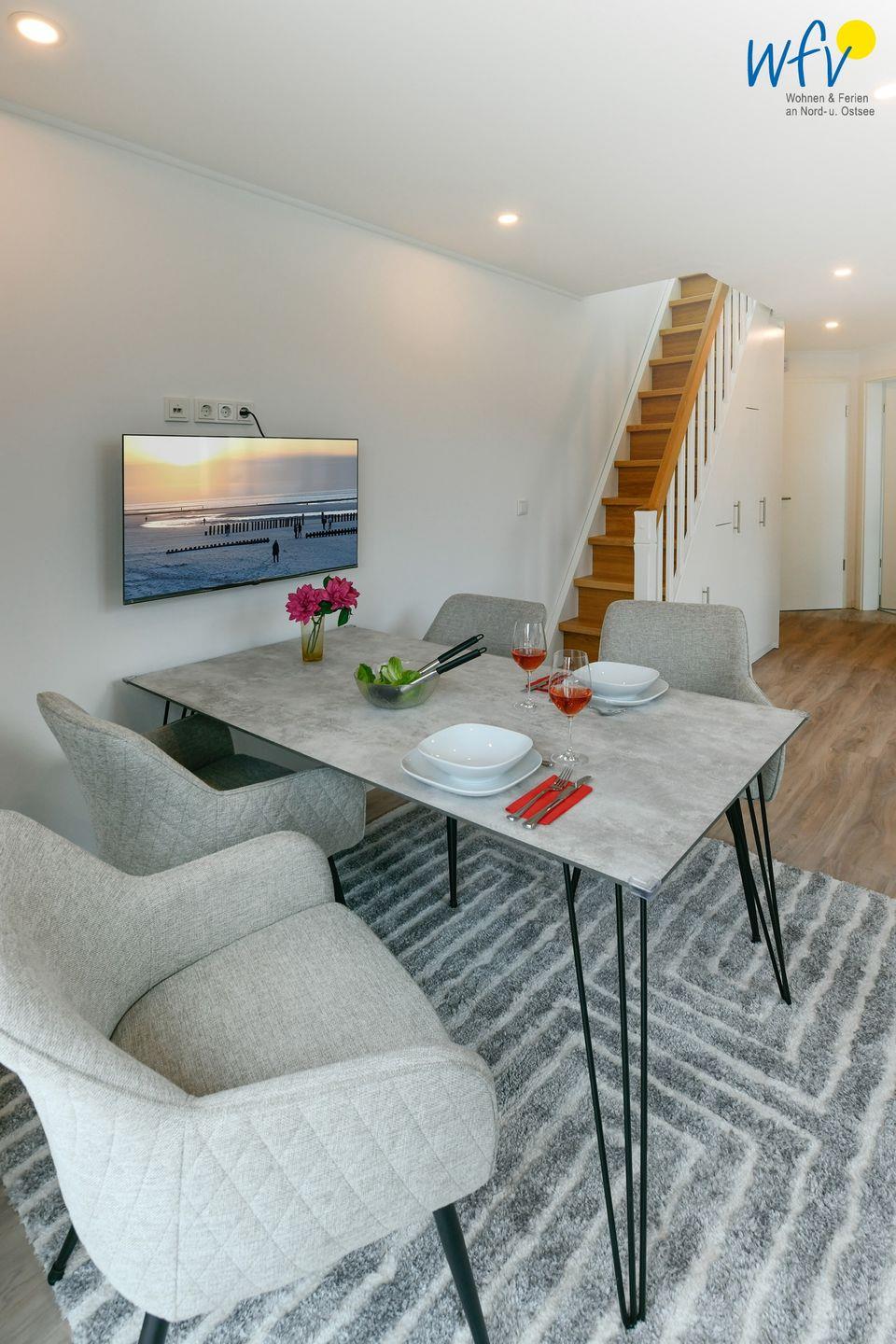 Nach dem Strandtag oder der Fahrradtour lädt der Wohnraum mit Couch, Relaxsessel und modernem TV zu entspannten Stunden ein. Am Esstisch haben Sie Platz für gemeinsame Mahlzeiten oder lustige Spieleabende.