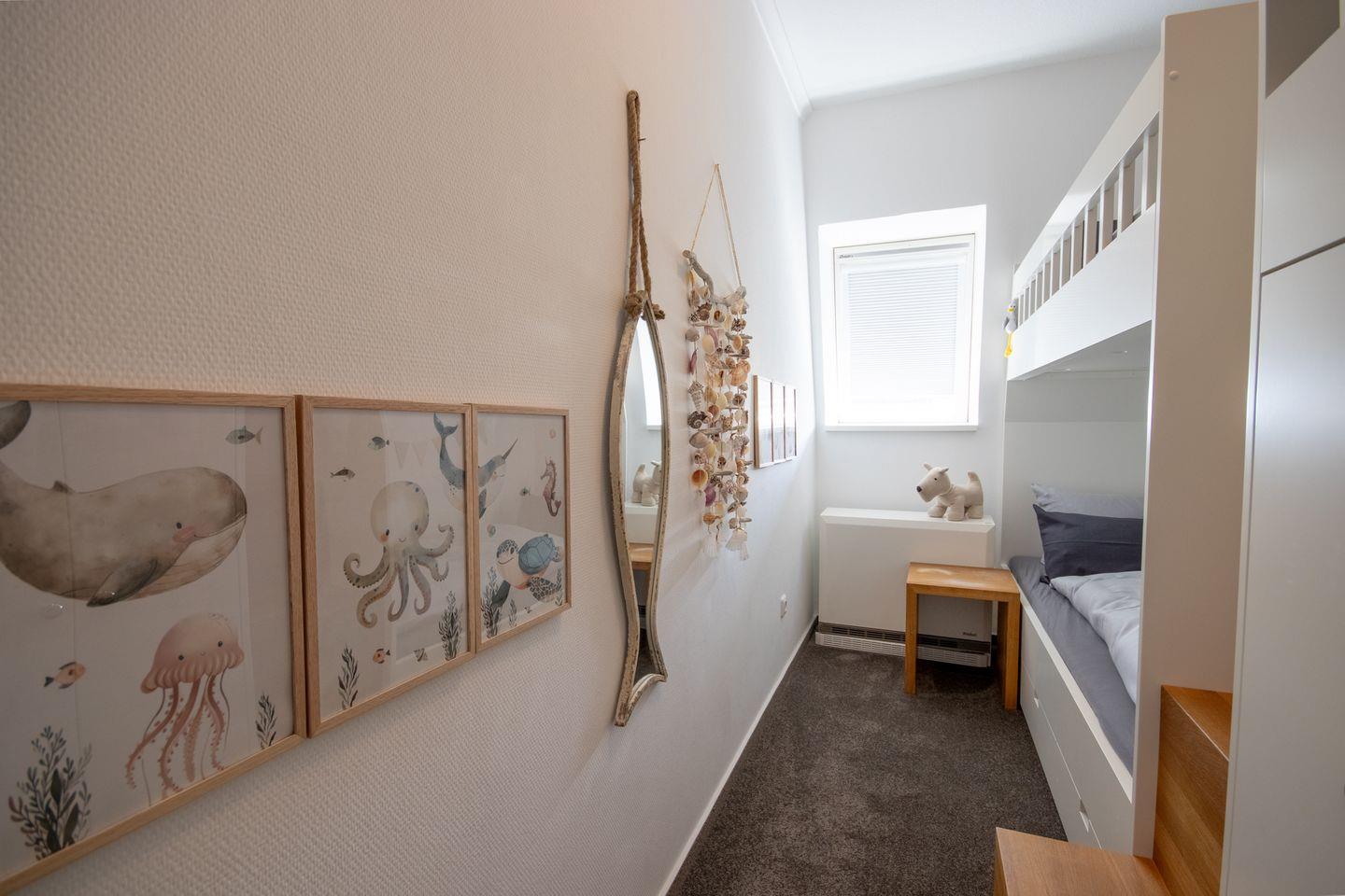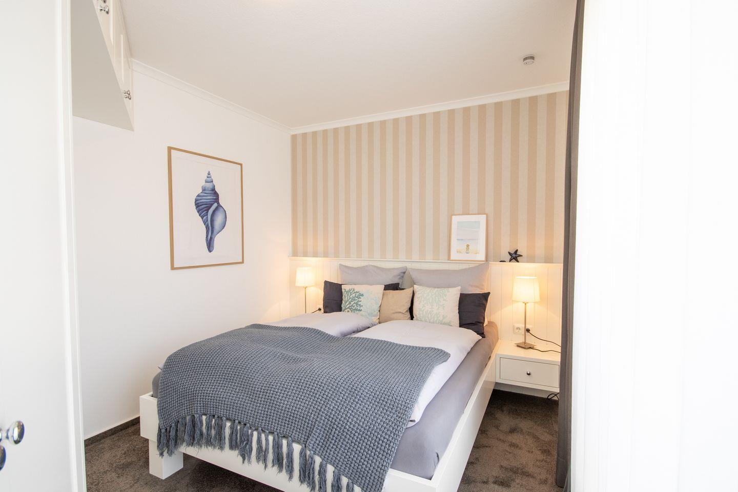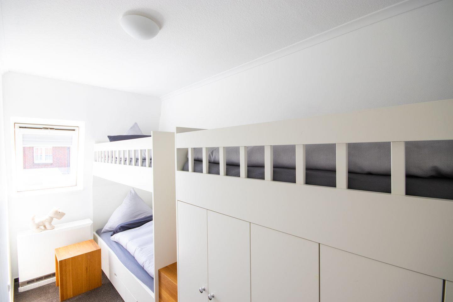 Schlafmöglichkeiten: 2 Schlafzimmer – ein Schlafzimmer mit Ehebett, Einbauschränken und ein Schlafzimmer mit einem Einbauetagenbett.